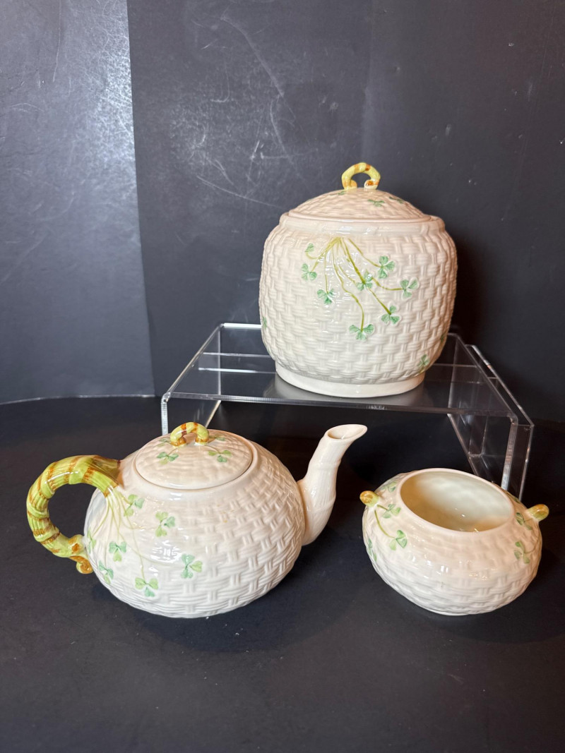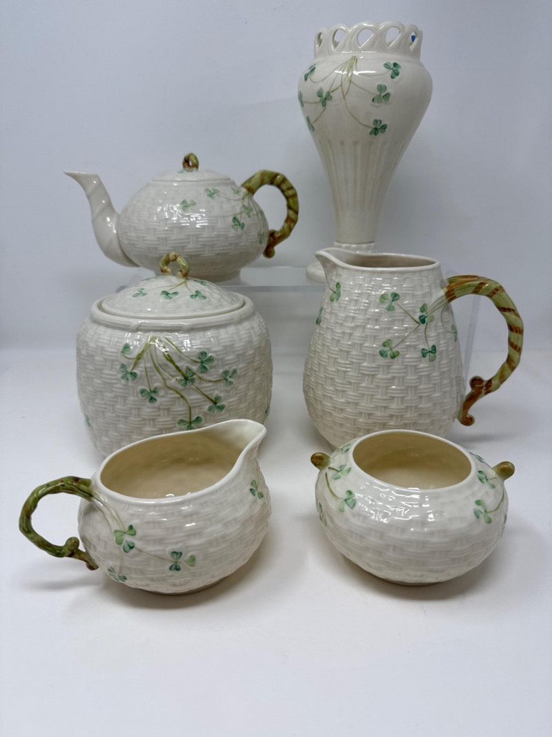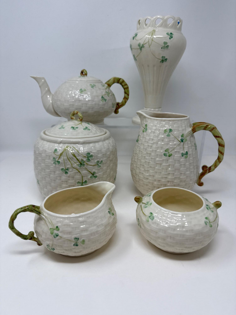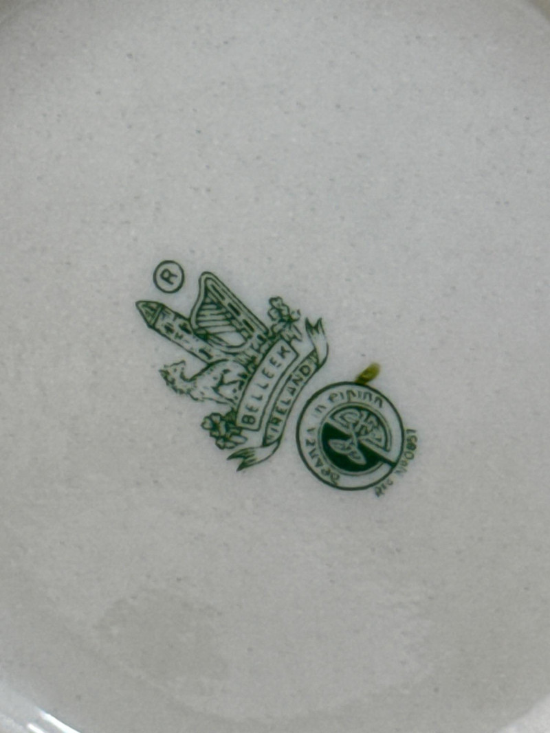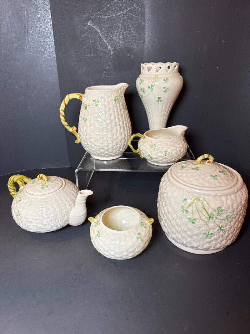 Belleek Shamrock Pierced Vase – 7.75" Tall A vintage Belleek porcelain vase featuring the iconic Shamrock pattern. Crafted in fine Parian china, this tall vase is lightweight and delicately translucent. The body is vertically fluted and topped with a pierced lattice rim, showcasing Belleek’s signature craftsmanship. Each shamrock leaf is hand-painted, adding unique character to the piece. Maker & Mark: Belleek Pottery, County Fermanagh, Ireland (est. 1857) 6th Green Mark (harp, round tower, wolfhound, “Belleek Ireland”) Mark used between 1965–1980 Pattern & Form: Shamrock – Belleek’s most iconic and enduring design Form: Fluted body, pierced rim, pedestal base Material: Fine Parian china, prized for its featherlight feel and translucent quality Collecting Note: Mid-20th-century Belleek vases with pierced rims are especially collectible The Shamrock pattern symbolizes Irish heritage and tradition A refined example of Belleek’s craftsmanship and cultural legacy Biscuit barrel is 6.5 inches tall, 5.25 inches wide. Pitcher is 6 inches long, 4.5 inches wide, 8.25 inches tall. teapot dimensions 8 inches long, 5.5 inches wide, 4.5 inches tall. Vase is 4 inches wide 7.75 inches tall. Sugar dish is 2.5 inches tall, 4.25 inches long, 4 inches wide. Creamer dish is 5.5 inches long, 4.5 inches wide, 3 inches tall.