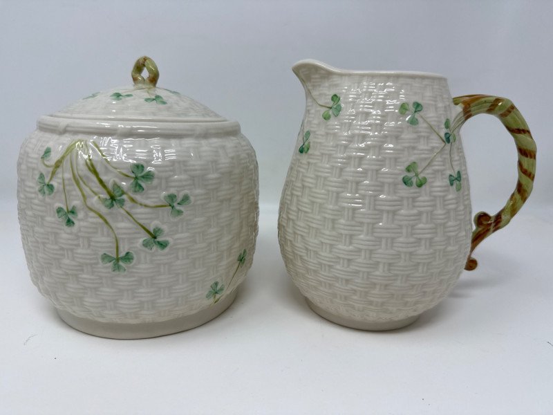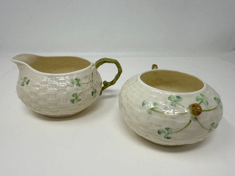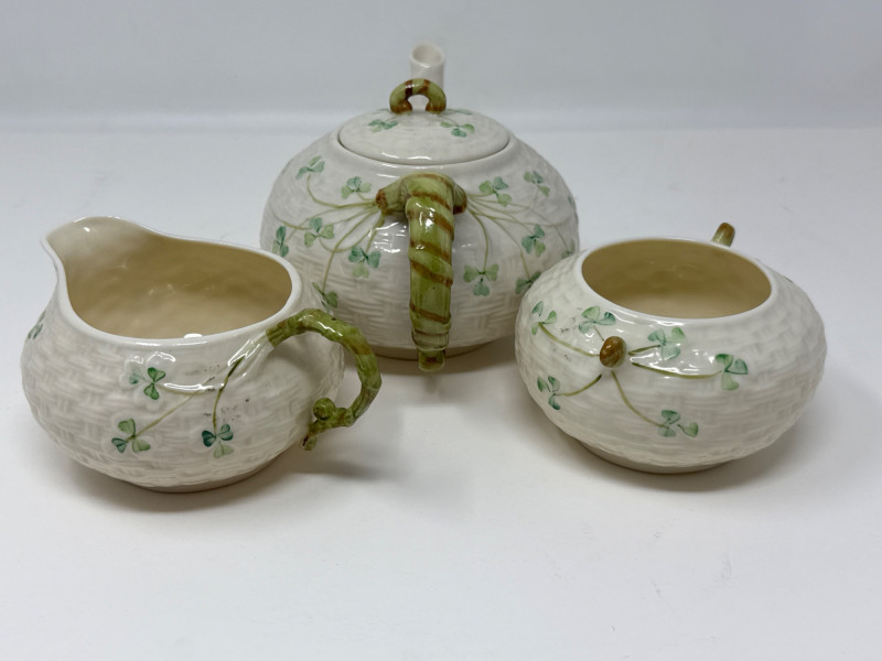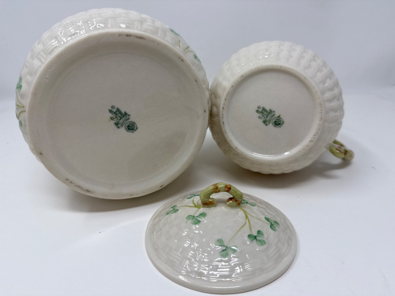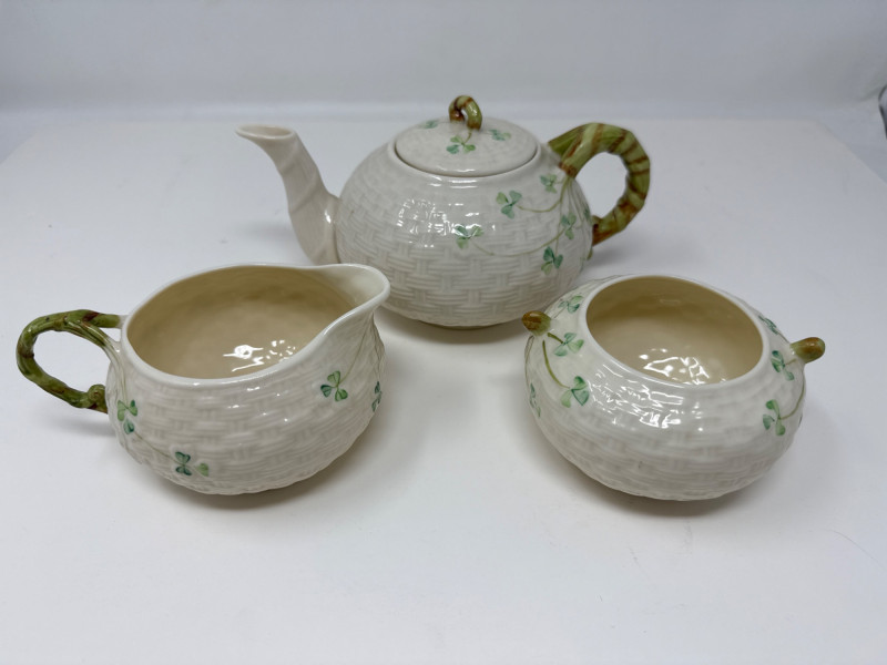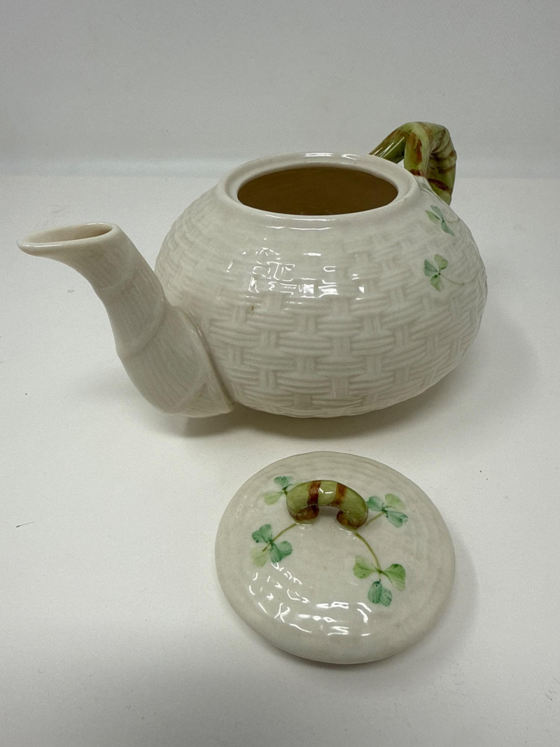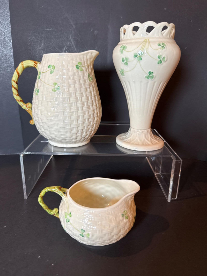 Belleek Shamrock Pierced Vase – 7.75" Tall A vintage Belleek porcelain vase featuring the iconic Shamrock pattern. Crafted in fine Parian china, this tall vase is lightweight and delicately translucent. The body is vertically fluted and topped with a pierced lattice rim, showcasing Belleek’s signature craftsmanship. Each shamrock leaf is hand-painted, adding unique character to the piece. Maker & Mark: Belleek Pottery, County Fermanagh, Ireland (est. 1857) 6th Green Mark (harp, round tower, wolfhound, “Belleek Ireland”) Mark used between 1965–1980 Pattern & Form: Shamrock – Belleek’s most iconic and enduring design Form: Fluted body, pierced rim, pedestal base Material: Fine Parian china, prized for its featherlight feel and translucent quality Collecting Note: Mid-20th-century Belleek vases with pierced rims are especially collectible The Shamrock pattern symbolizes Irish heritage and tradition A refined example of Belleek’s craftsmanship and cultural legacy Biscuit barrel is 6.5 inches tall, 5.25 inches wide. Pitcher is 6 inches long, 4.5 inches wide, 8.25 inches tall. teapot dimensions 8 inches long, 5.5 inches wide, 4.5 inches tall. Vase is 4 inches wide 7.75 inches tall. Sugar dish is 2.5 inches tall, 4.25 inches long, 4 inches wide. Creamer dish is 5.5 inches long, 4.5 inches wide, 3 inches tall.