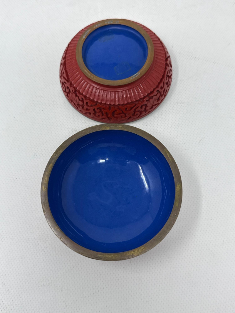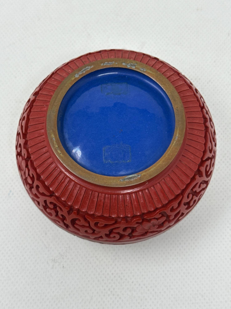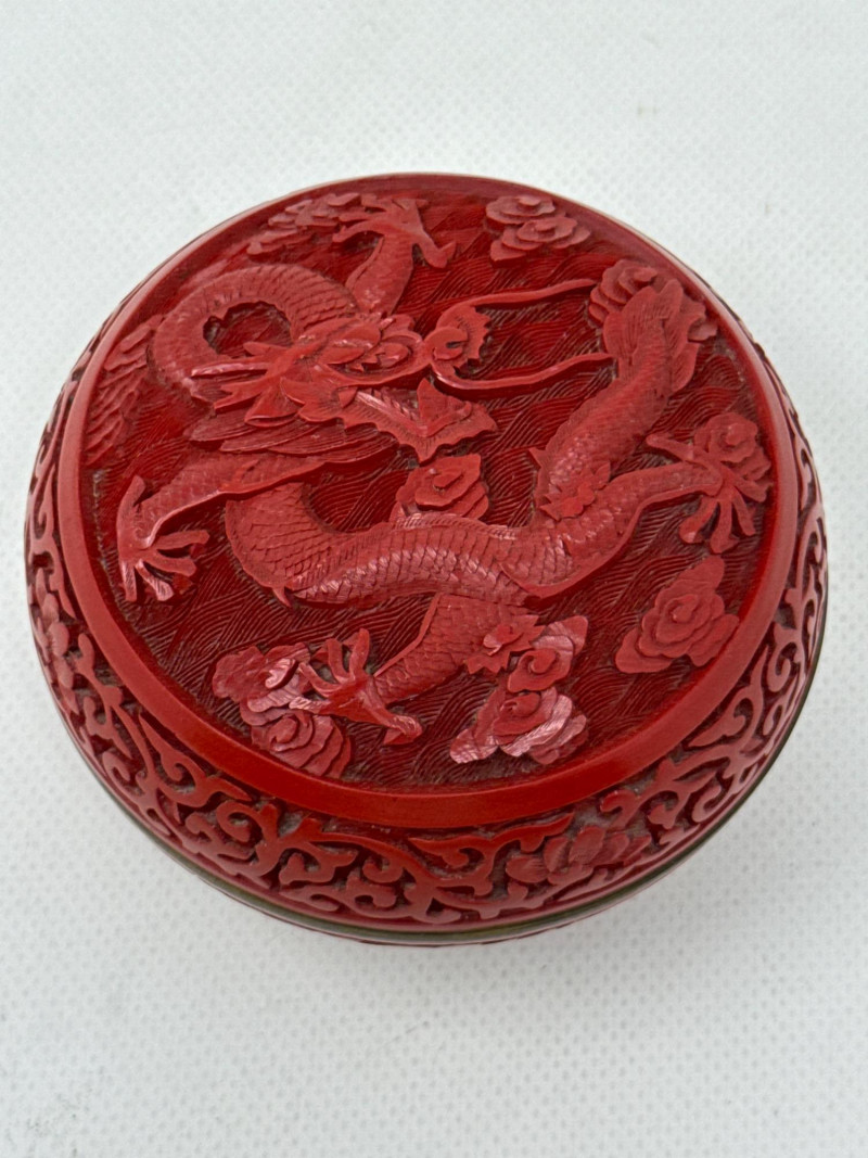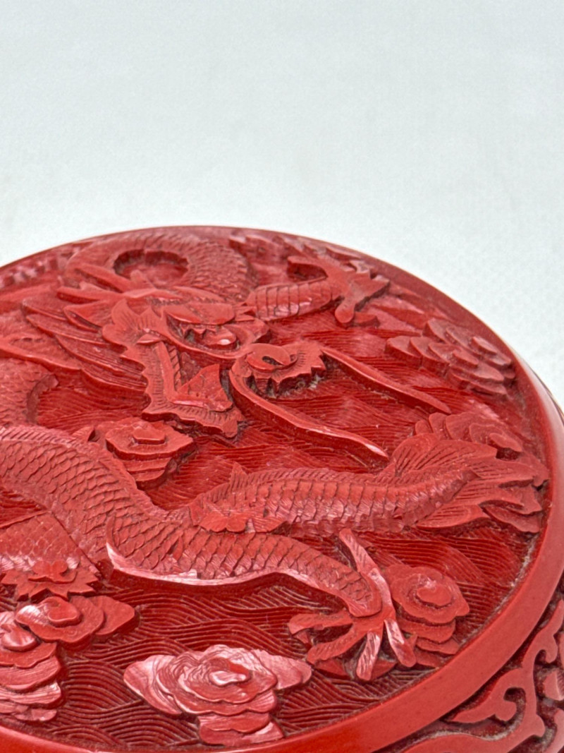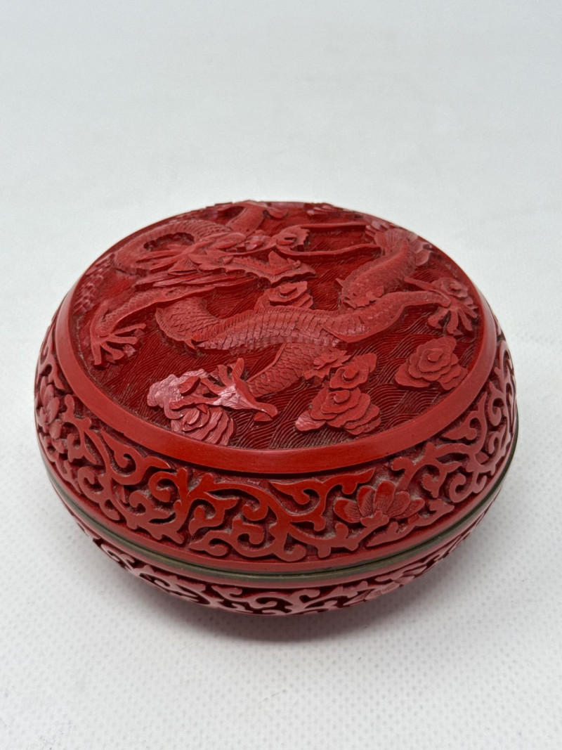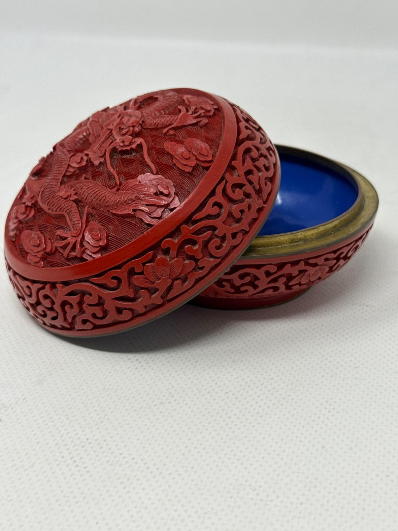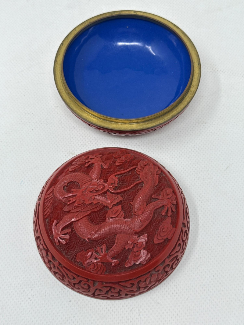 A finely crafted round trinket box featuring traditional Chinese cinnabar lacquerwork. The lid showcases a deeply carved dragon soaring through swirling clouds, framed by elegant floral scroll motifs. The interior reveals a brilliant cobalt-blue enamel lining, offering a vivid contrast to the rich red exterior. Origin: China (maker unknown) Material: Carved cinnabar lacquer over brass with enamel interior Design: Imperial dragon among clouds with floral scrollwork Form: Round, lidded trinket or jewelry box Markings: Impressed mark on base beneath enamel Cinnabar lacquerware is a traditional Chinese craft involving the application of multiple layers of lacquer—each hand-carved to create intricate relief designs. The dragon, a symbol of imperial power and good fortune, enhances the box’s appeal to collectors of Asian decorative arts. The cobalt enamel interior is typical of mid-20th century export pieces, valued for both its beauty and its protective function.Vintage Chinese Cinnabar Lacquered Trinket Box