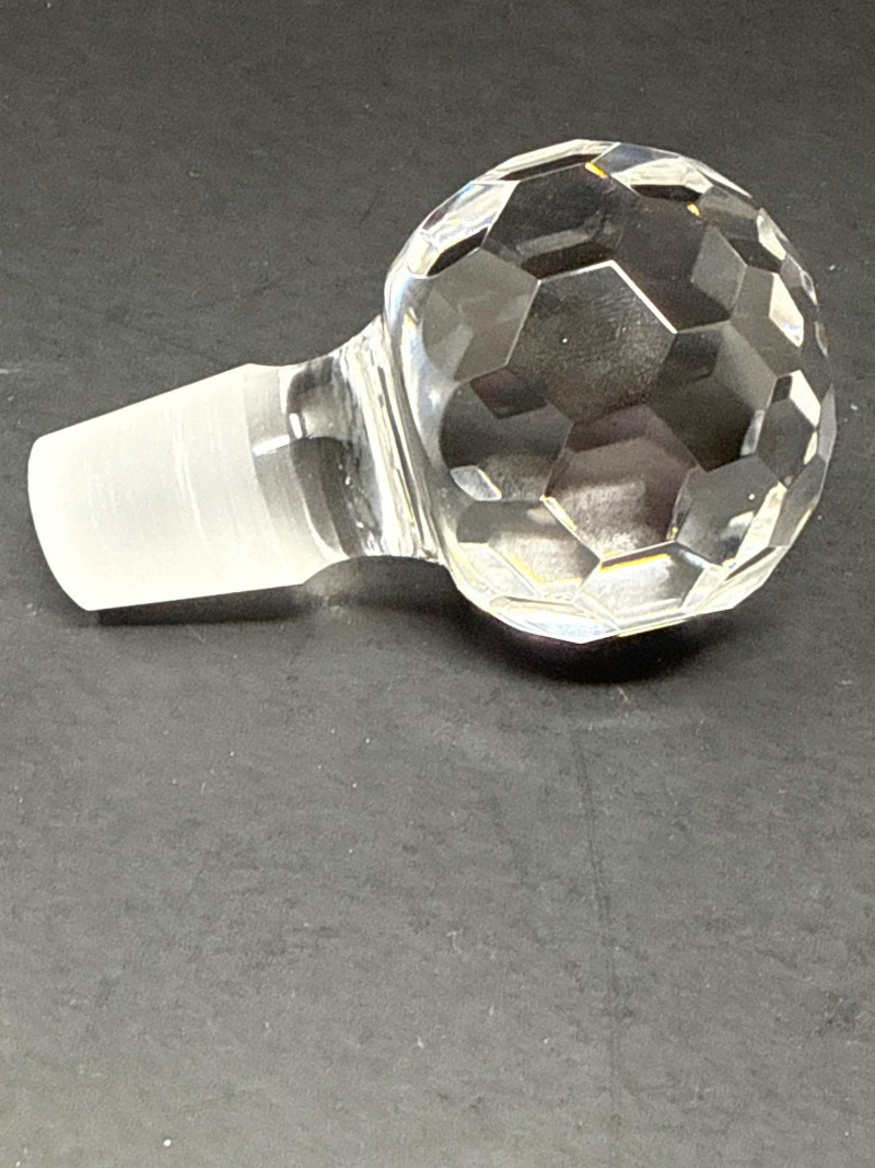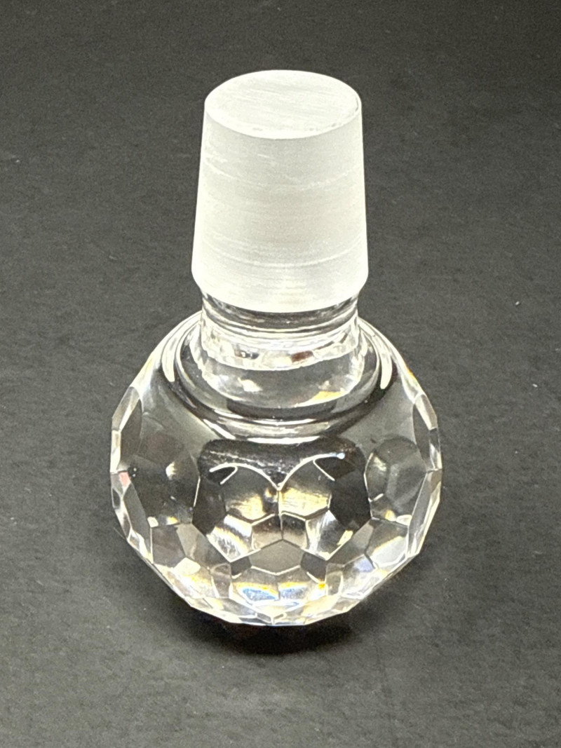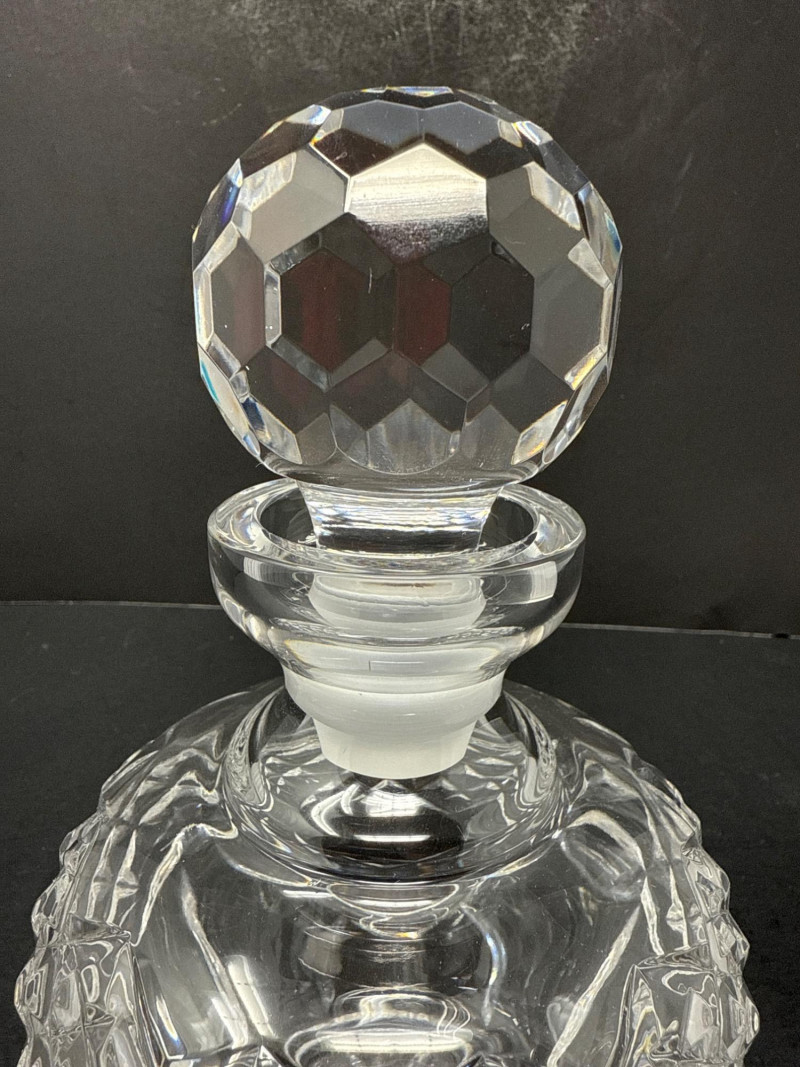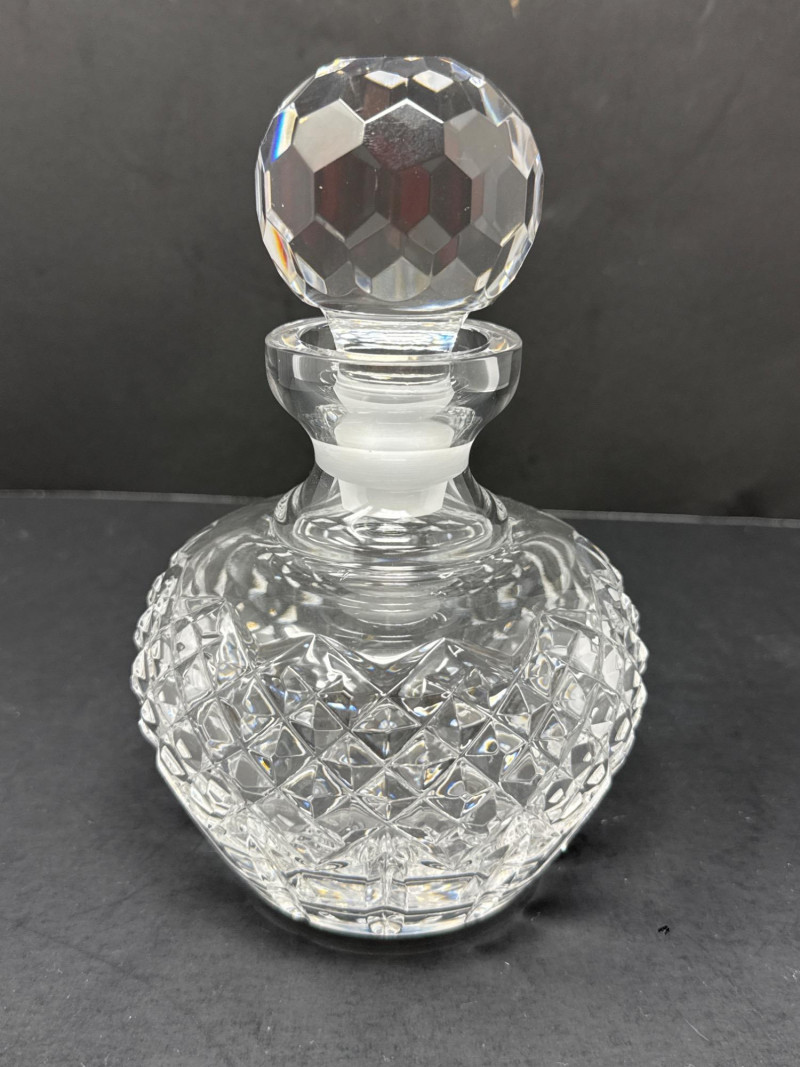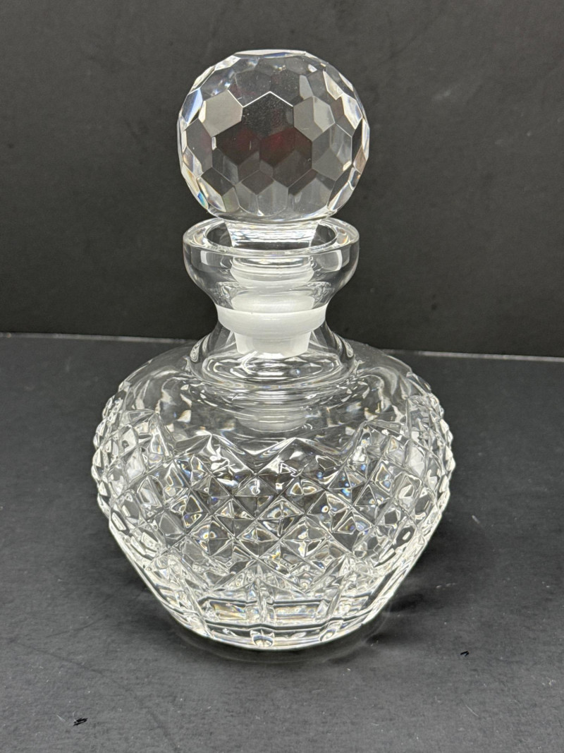 Waterford Crystal Cut Perfume Bottle with Faceted Stopper Rounded Waterford cut crystal perfume bottle with a multi-faceted ball stopper. The body displays an allover diamond crosshatch pattern with a starburst cut base. Stopper features a frosted ground plug for a secure fit.
