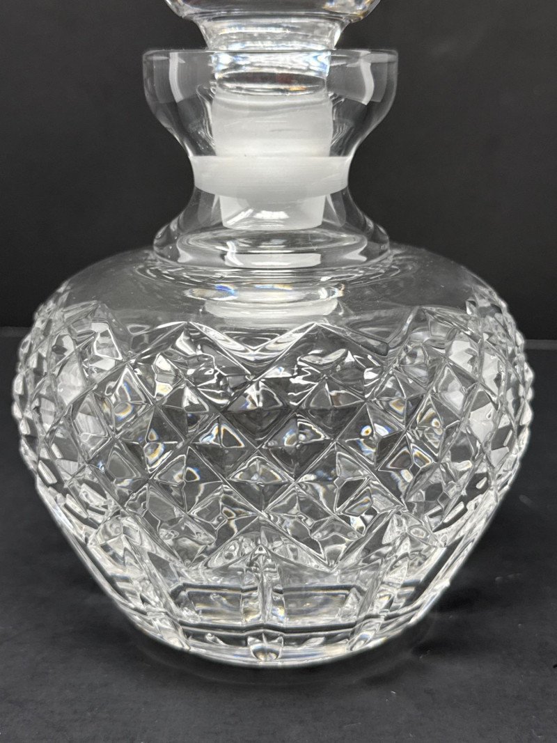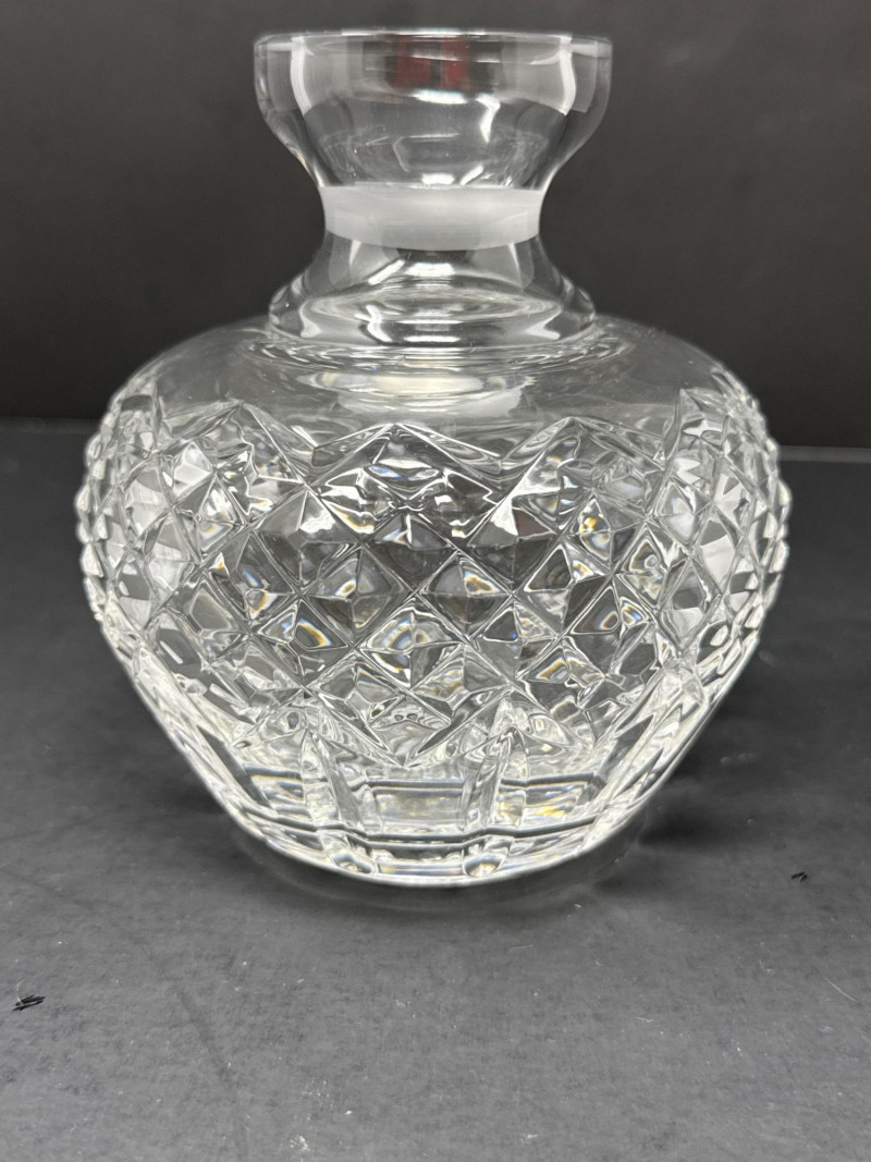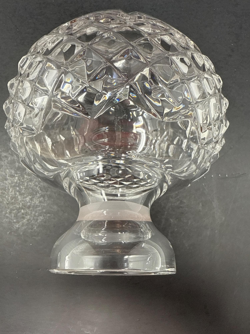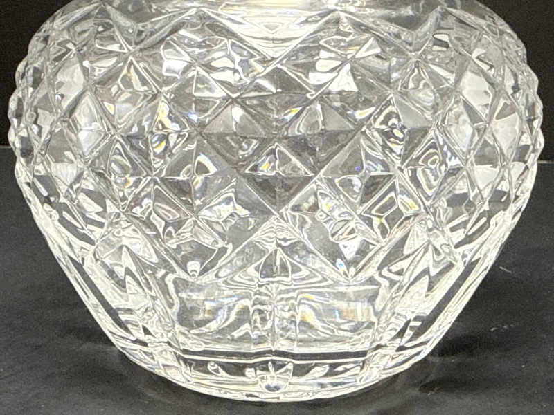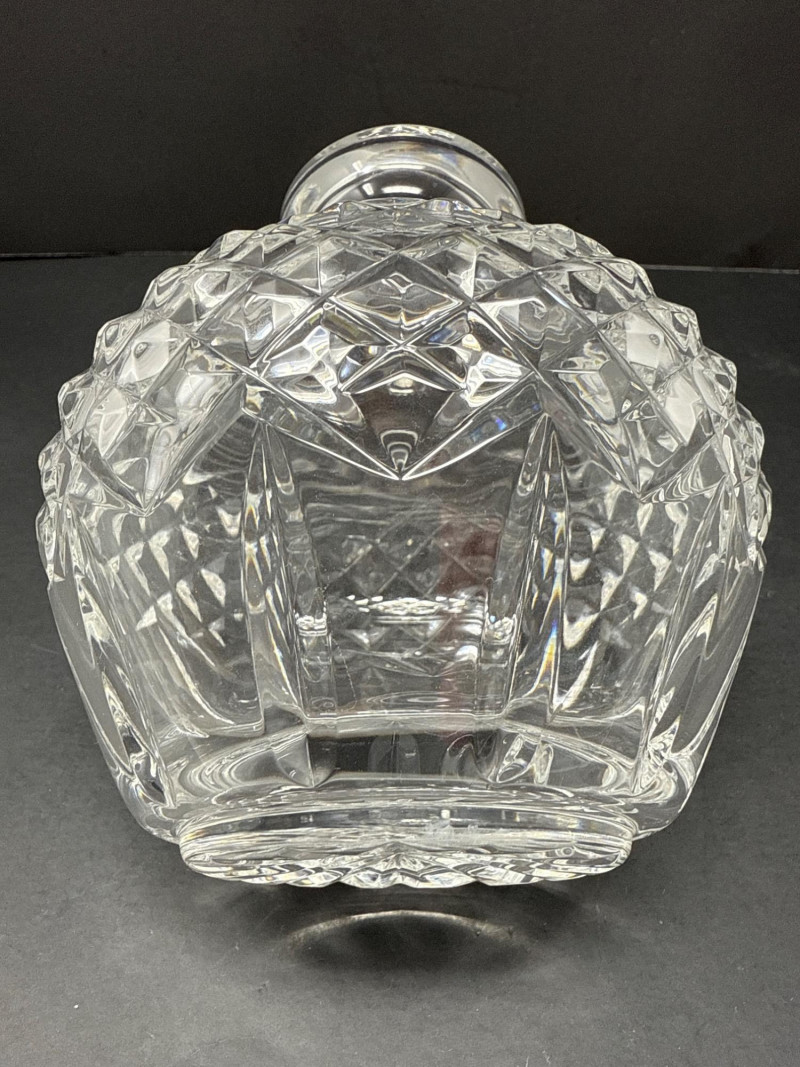 Waterford Crystal Cut Perfume Bottle with Faceted Stopper Rounded Waterford cut crystal perfume bottle with a multi-faceted ball stopper. The body displays an allover diamond crosshatch pattern with a starburst cut base. Stopper features a frosted ground plug for a secure fit.