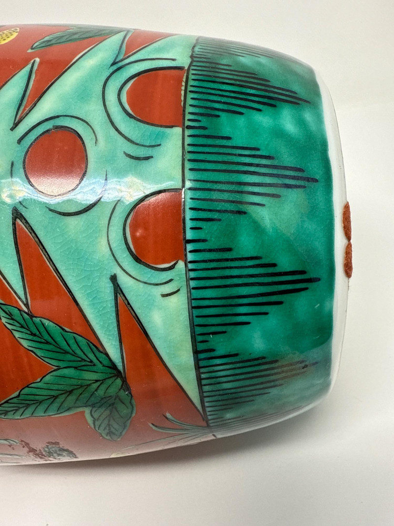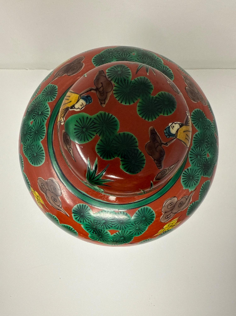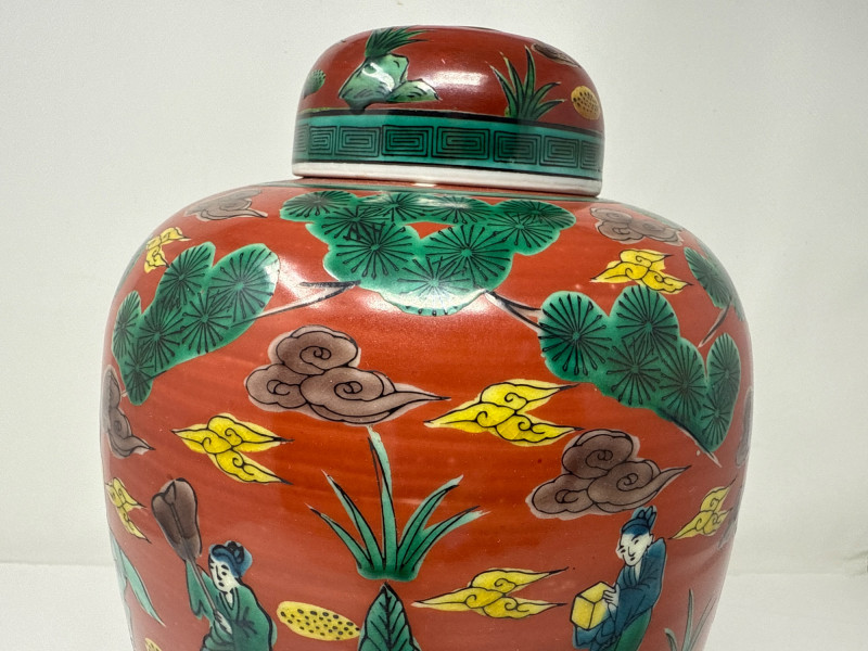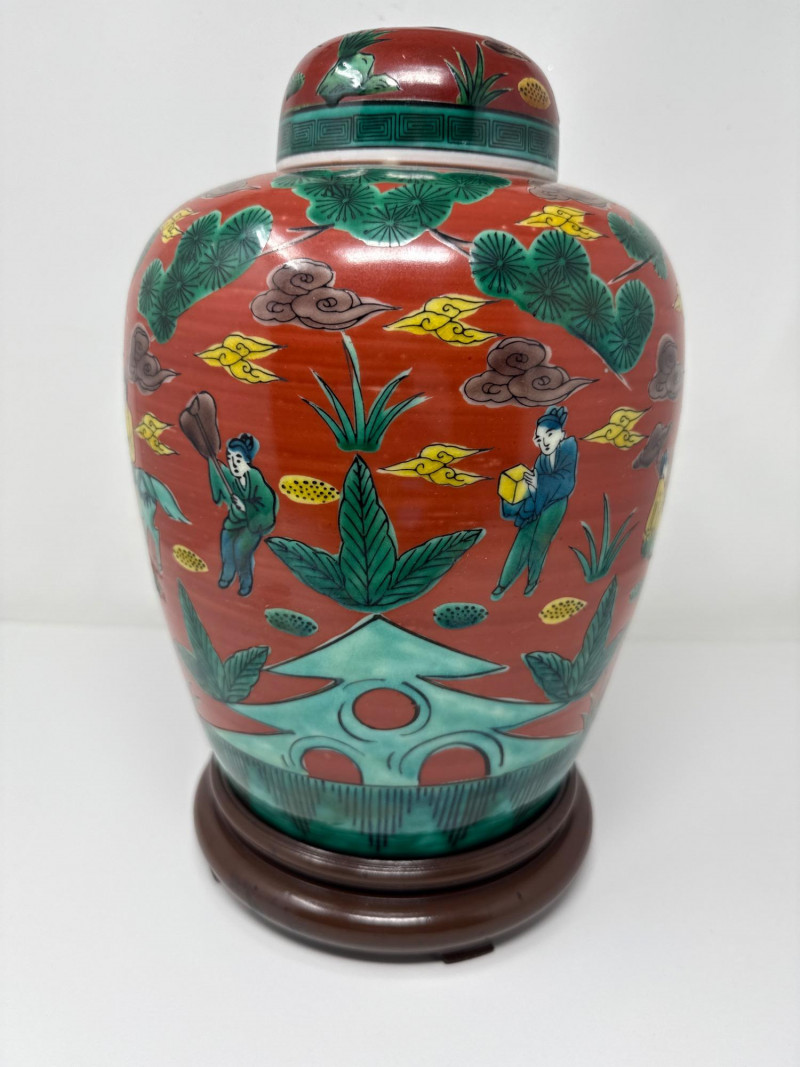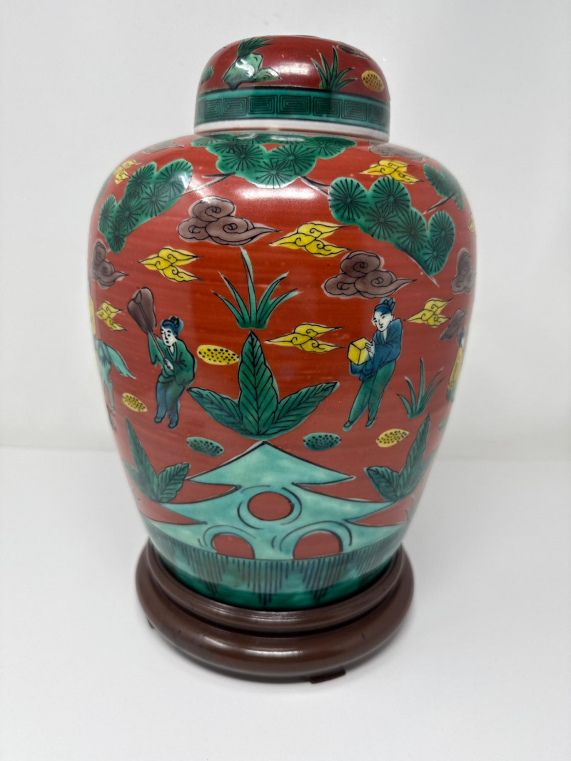 Vintage Japanese Kutani Porcelain Ginger Jar with Domed Lid A vintage Japanese Kutani porcelain ginger jar with domed lid, richly decorated in overglaze enamels on a red ground. The jar features hand-painted scenes of figures in traditional attire, a mounted horseman, pine and lotus foliage, and stylized cloud motifs. The domed lid continues the design with foliage and scrollwork. Details: Maker: Kutani ware, Japan Period: Mid-20th century (Showa era, circa 1950s–1970s) Form: Ginger jar with domed lid Material: Porcelain with overglaze enamels Mark: Square red Kutani mark on base; “Japan” export sticker present Collecting Note: Kutani porcelain, produced in Ishikawa Prefecture, is renowned for its bold palette of red, green, yellow, and turquoise enamels. This piece reflects the continuation of Kutani decorative traditions into the mid-20th century and was made for export, as indicated by the “Japan” sticker. Collectors value such jars both for their decorative appeal and as representative examples of Japan’s porcelain trade during the Showa era.