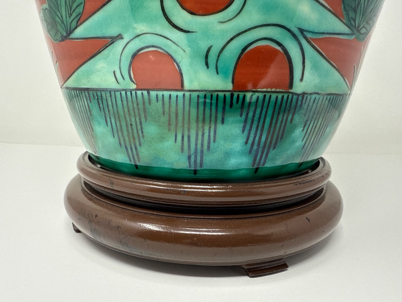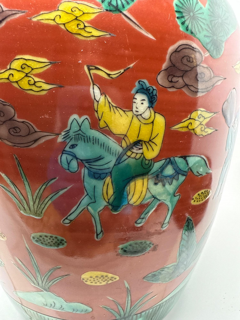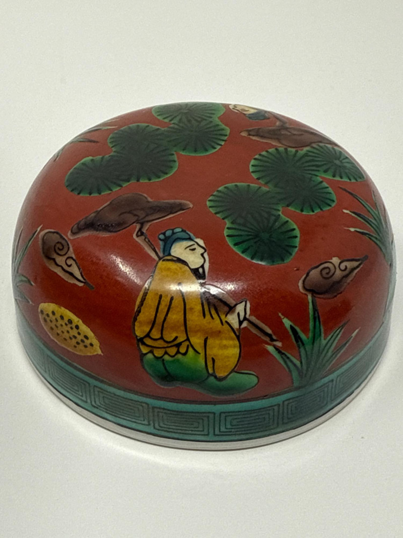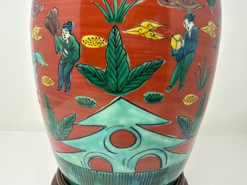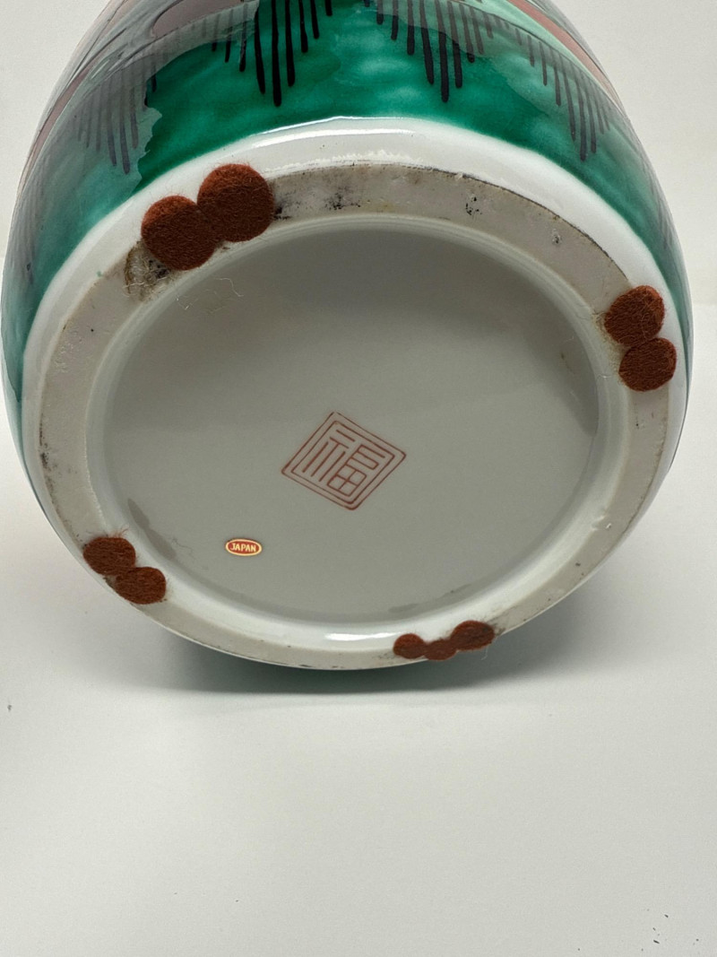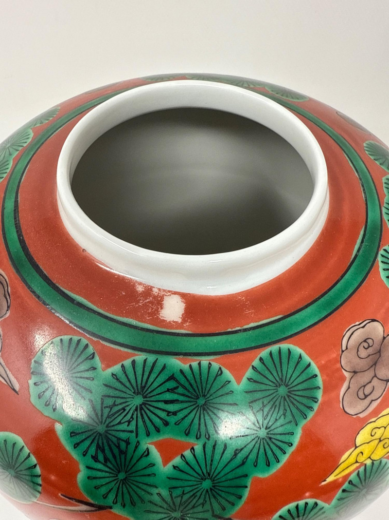 Vintage Japanese Kutani Porcelain Ginger Jar with Domed Lid A vintage Japanese Kutani porcelain ginger jar with domed lid, richly decorated in overglaze enamels on a red ground. The jar features hand-painted scenes of figures in traditional attire, a mounted horseman, pine and lotus foliage, and stylized cloud motifs. The domed lid continues the design with foliage and scrollwork. Details: Maker: Kutani ware, Japan Period: Mid-20th century (Showa era, circa 1950s–1970s) Form: Ginger jar with domed lid Material: Porcelain with overglaze enamels Mark: Square red Kutani mark on base; “Japan” export sticker present Collecting Note: Kutani porcelain, produced in Ishikawa Prefecture, is renowned for its bold palette of red, green, yellow, and turquoise enamels. This piece reflects the continuation of Kutani decorative traditions into the mid-20th century and was made for export, as indicated by the “Japan” sticker. Collectors value such jars both for their decorative appeal and as representative examples of Japan’s porcelain trade during the Showa era.