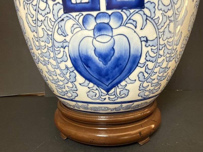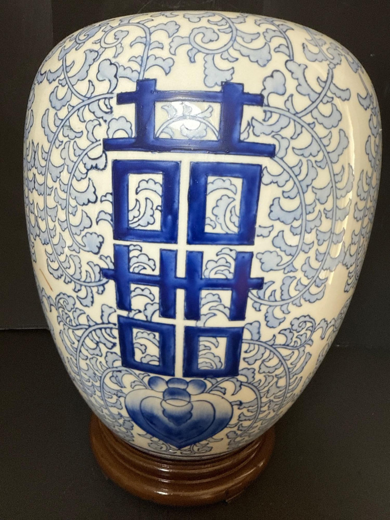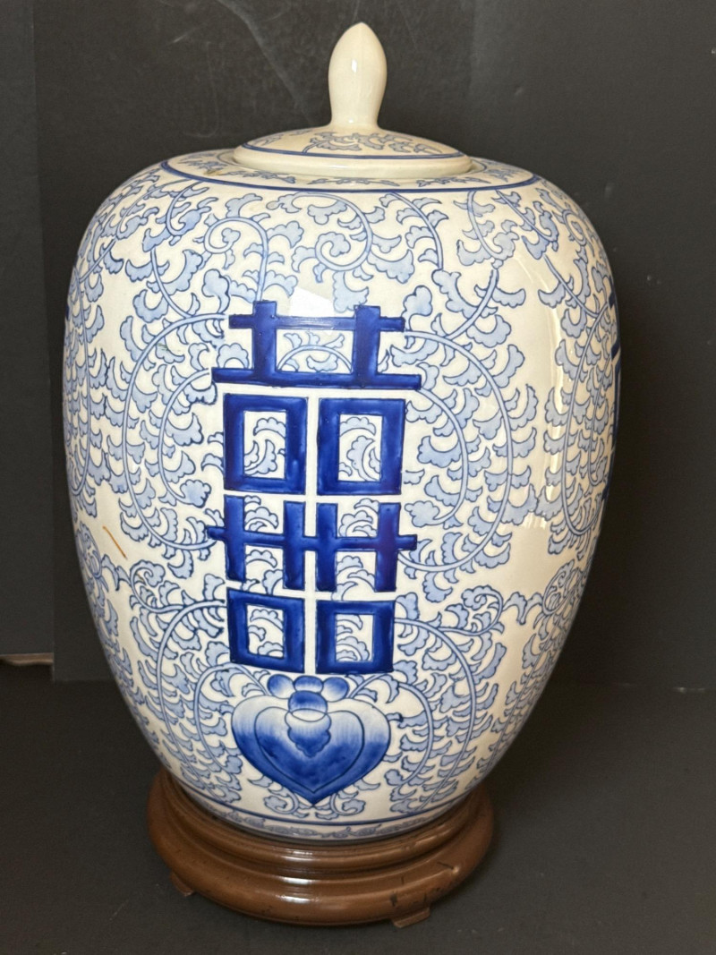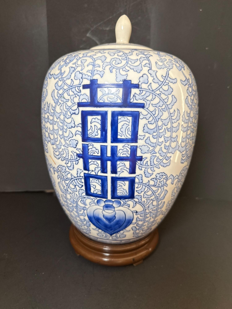 Lot # 56 - Vintage Blue & White Double Happiness Ginger Jar with Lid & Wood Stand