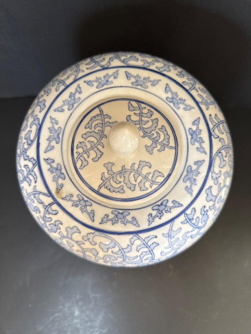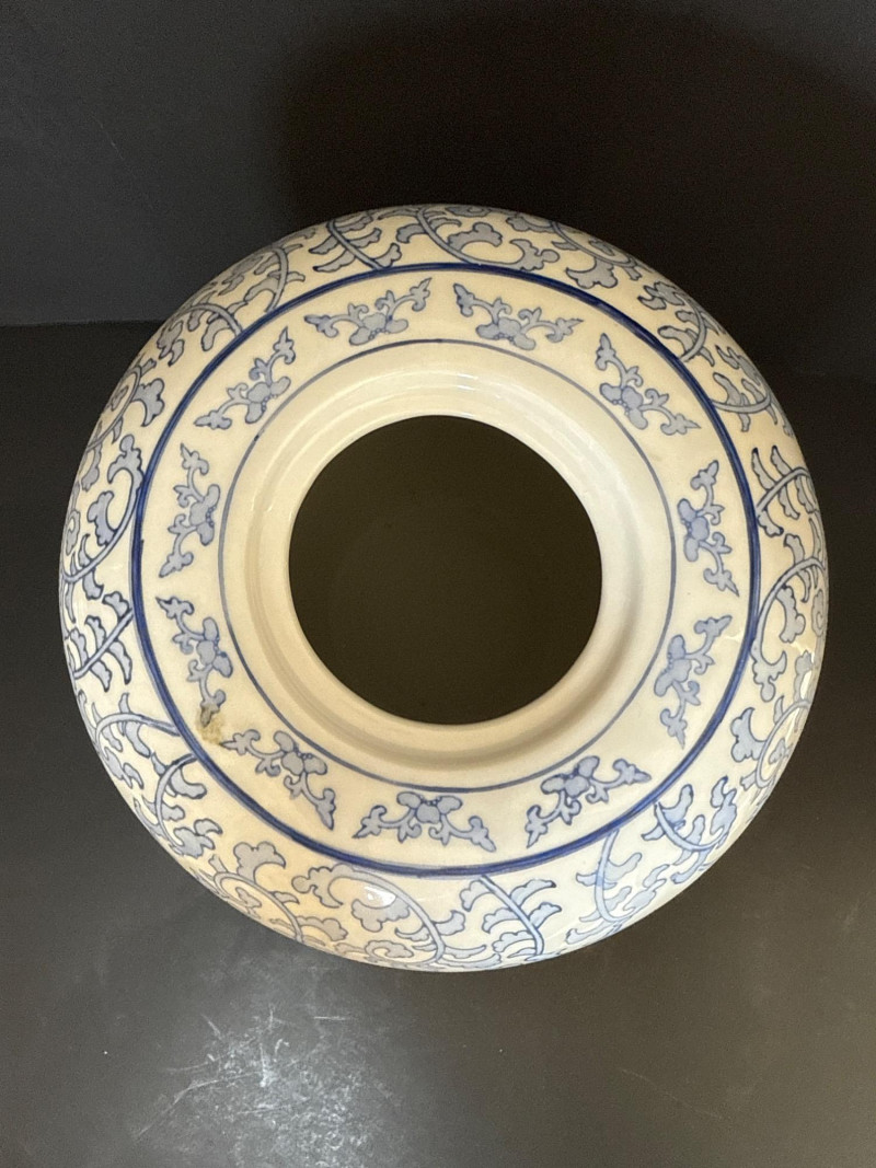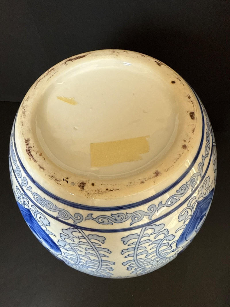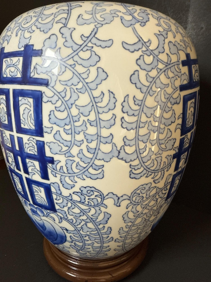 Lot # 56 - Vintage Blue & White Double Happiness Ginger Jar with Lid & Wood Stand