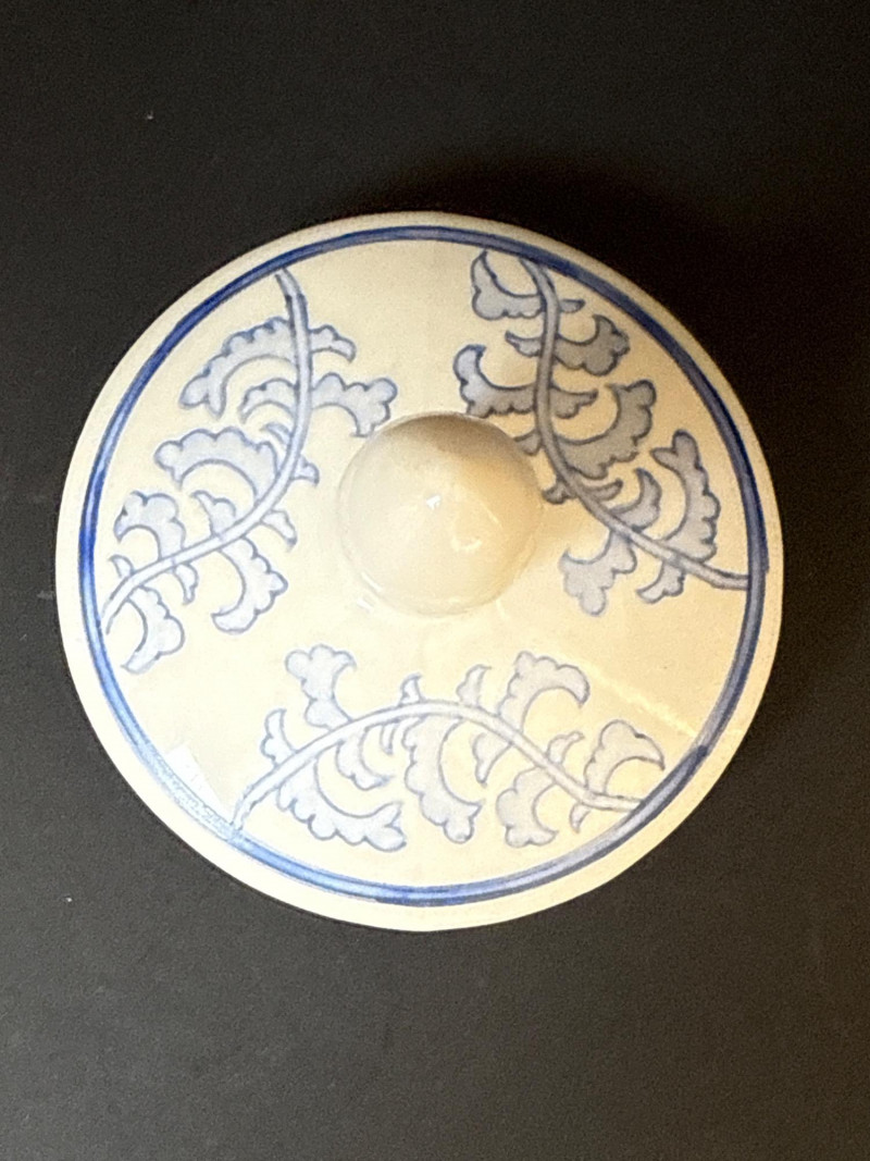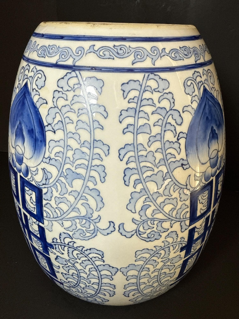 The double happiness symbol is a traditional Chinese emblem associated with weddings and blessings of joy and prosperity. While inspired by Qing dynasty blue-and-white porcelain wares, this piece is a decorative 20th-century ceramic example, reflecting the enduring appeal of blue-and-white patterns in both Asian and Western interiors.