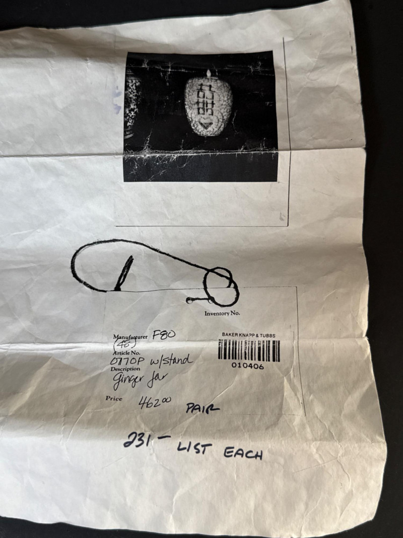 Originally retailed by Baker Knapp & Tubbs, a high-end furnishings and interiors company. Inventory sheet notes article no. 0170P, listed at $231 each ($462 per pair). Collecting Note: