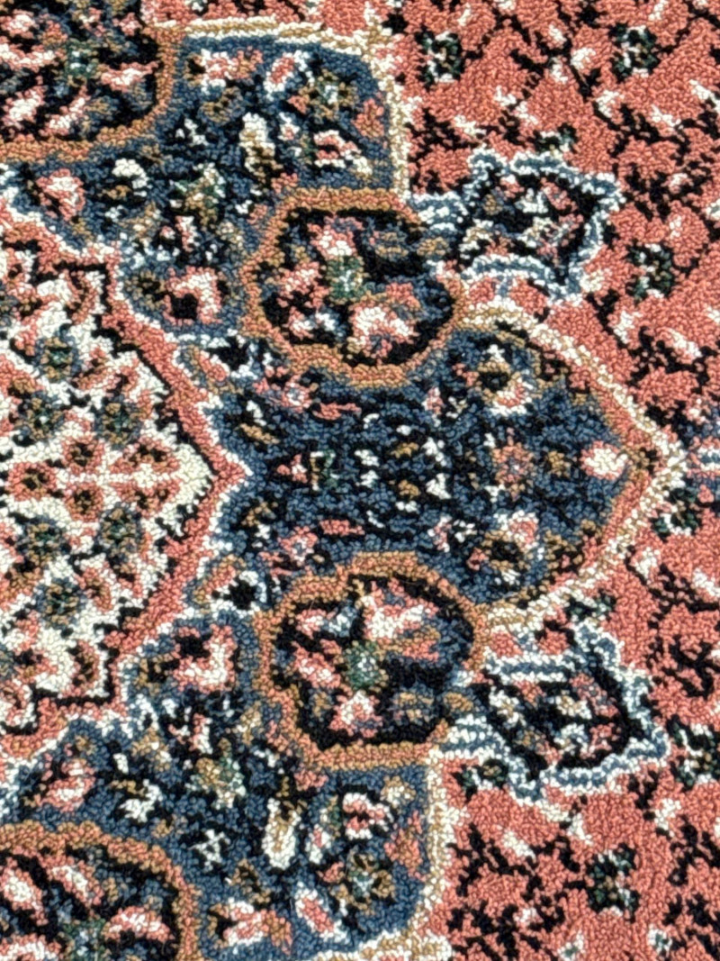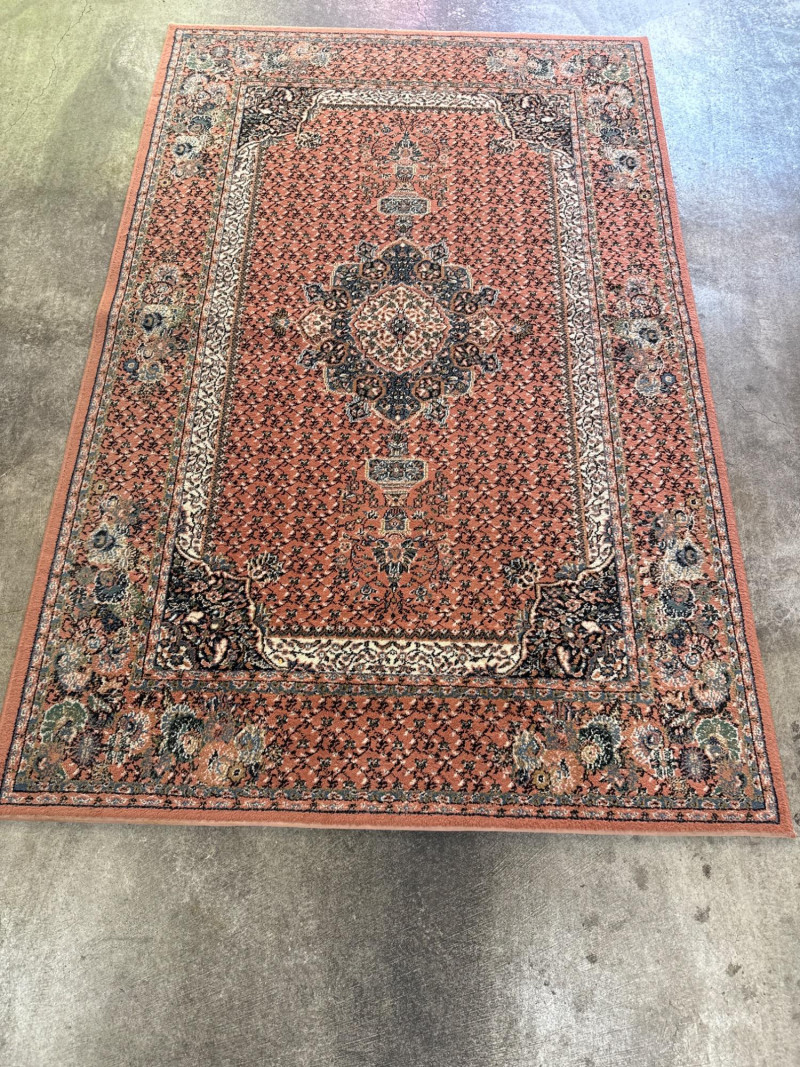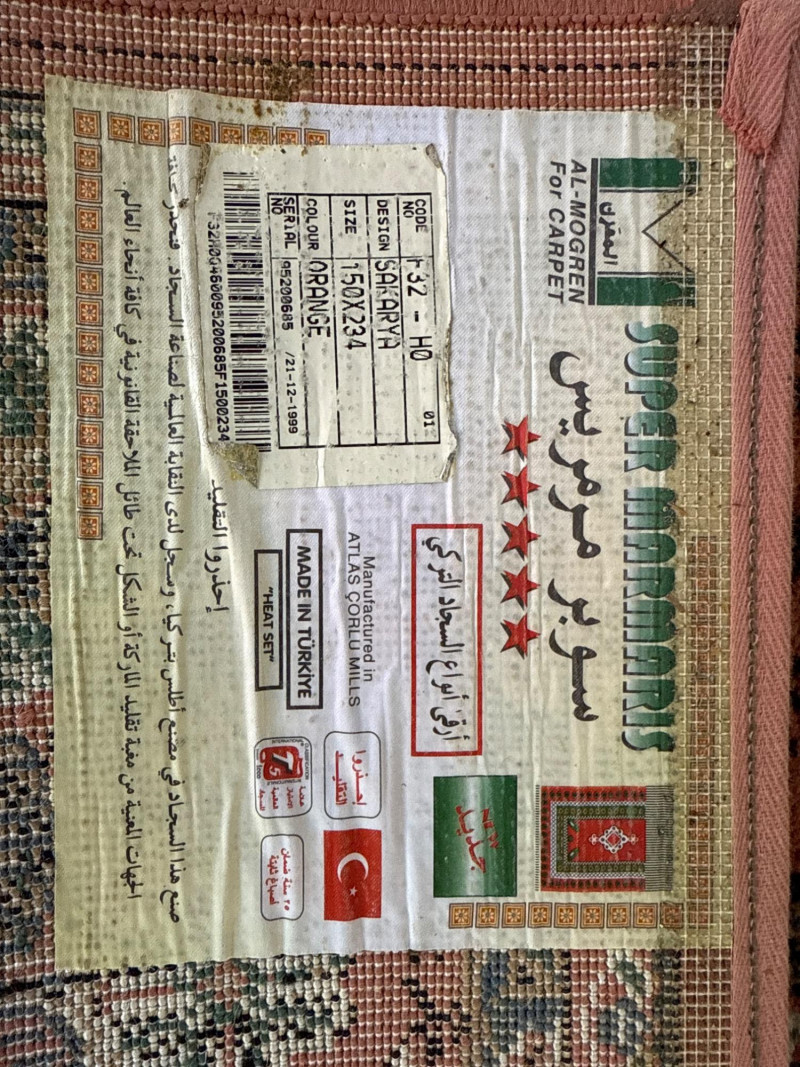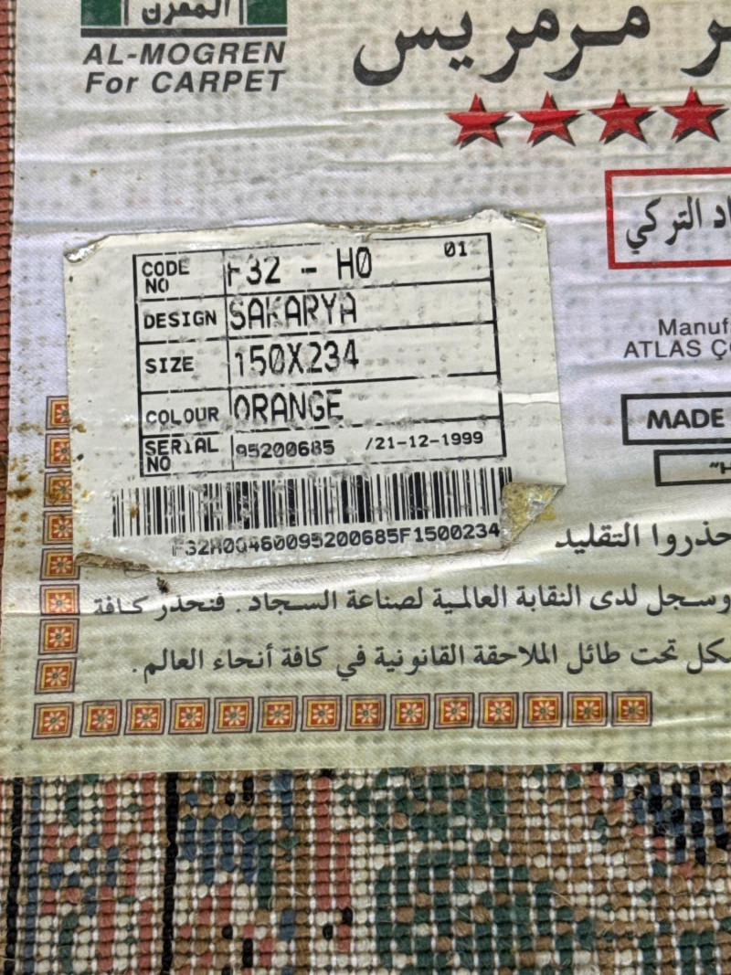 Turkish Sakarya Area Rug – 91″L × 59″W Details: Maker: Atlas Çorlu Mills (for Al-Mogren Carpets) Design: Sakarya Origin: Türkiye Date: 1999 (per label) Material: Heat-set polypropylene (machine-woven) Colors: Orange ground with navy, cream, and green accents Pattern: Central medallion, floral motifs, bordered frame About the Maker: