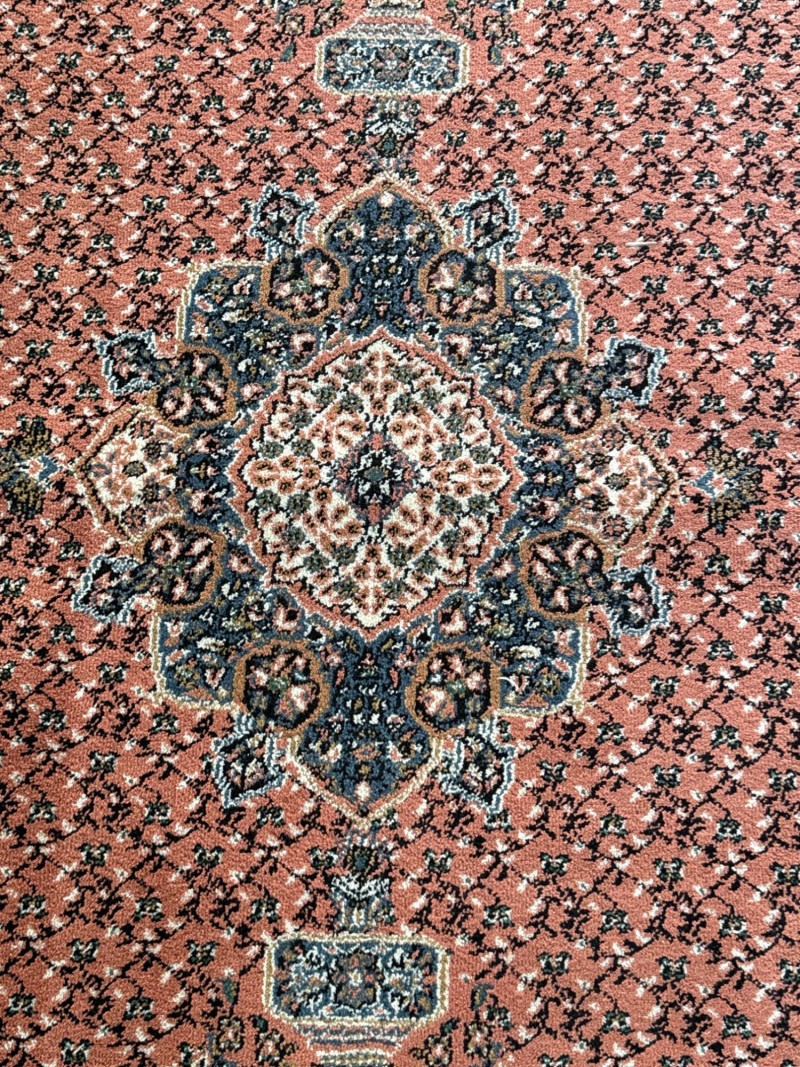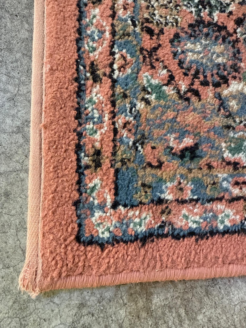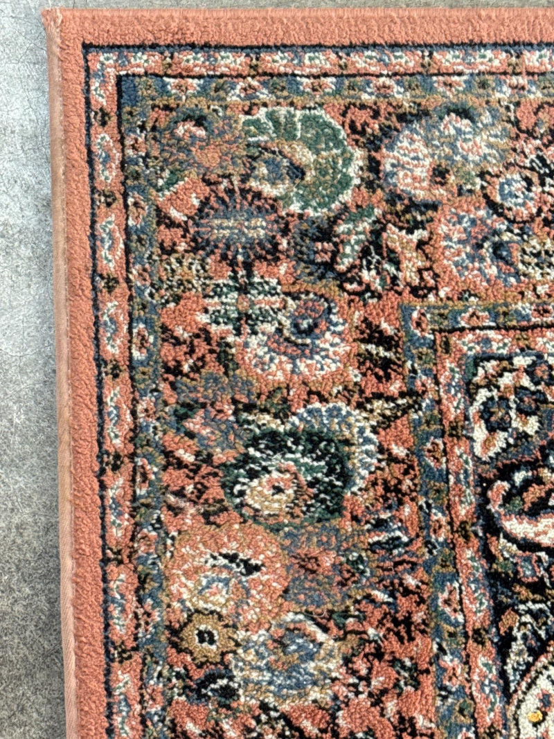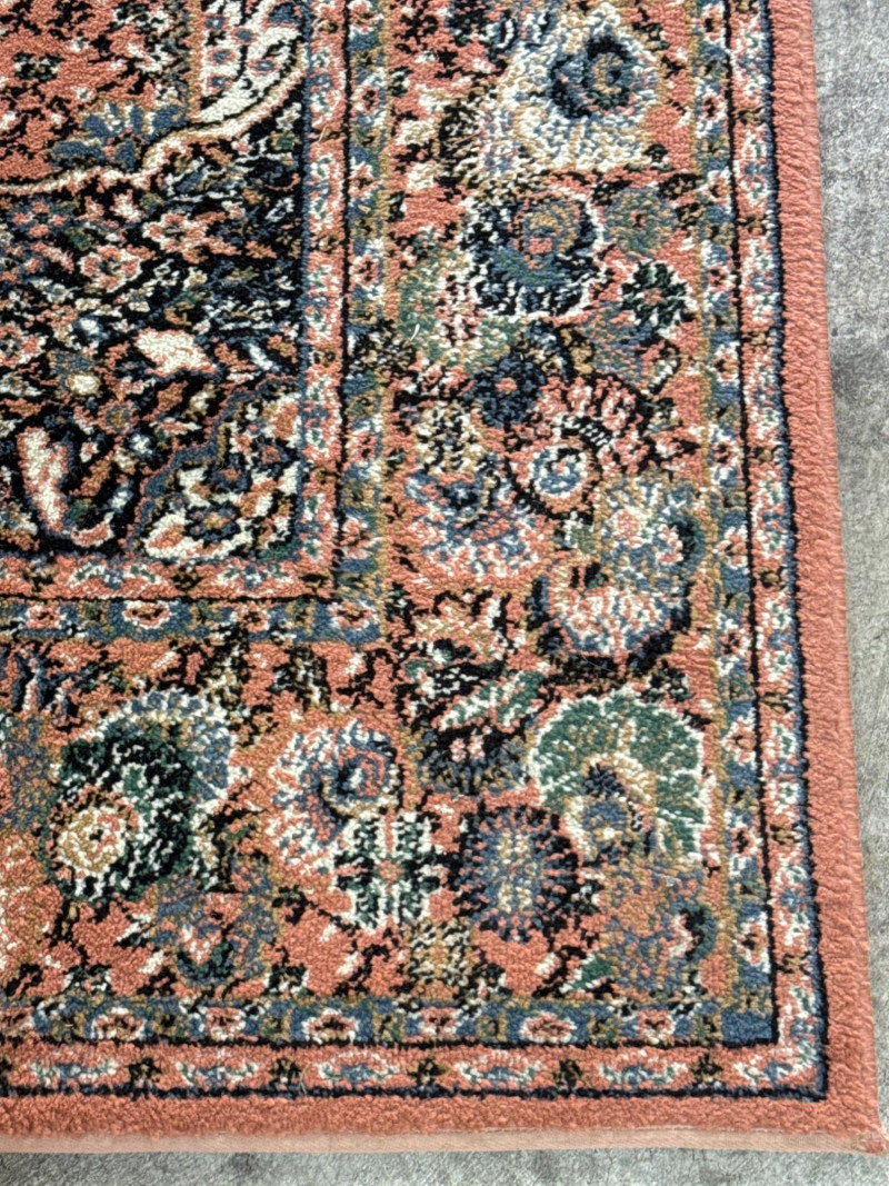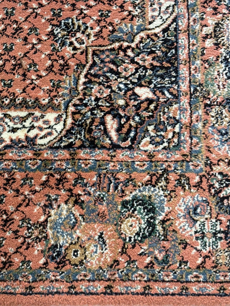 Turkish Sakarya Area Rug – 91″L × 59″W Details: Maker: Atlas Çorlu Mills (for Al-Mogren Carpets) Design: Sakarya Origin: Türkiye Date: 1999 (per label) Material: Heat-set polypropylene (machine-woven) Colors: Orange ground with navy, cream, and green accents Pattern: Central medallion, floral motifs, bordered frame About the Maker: