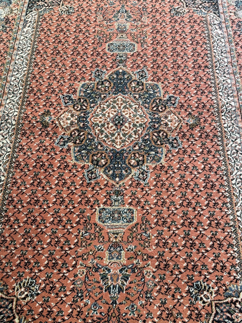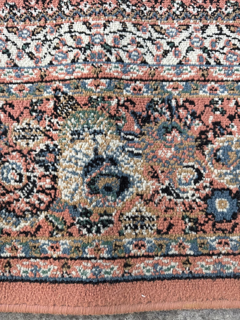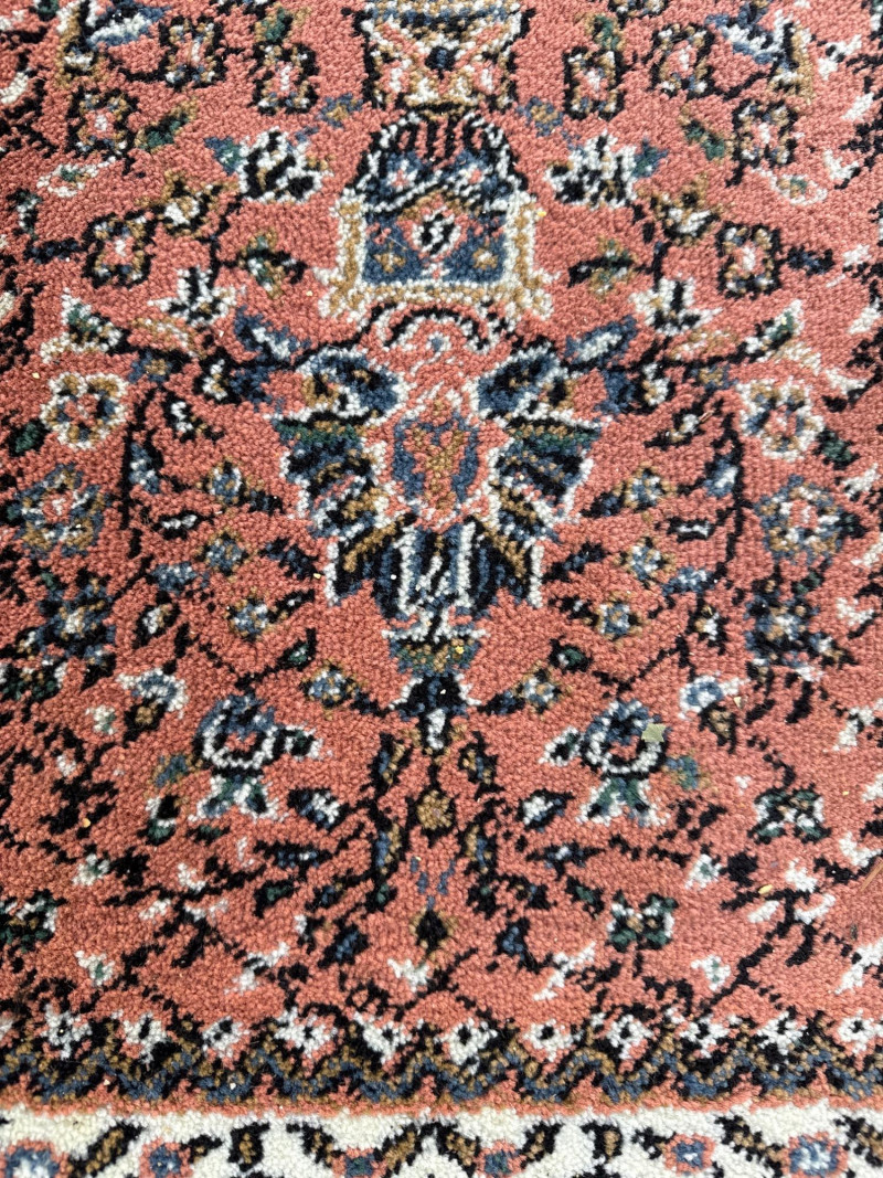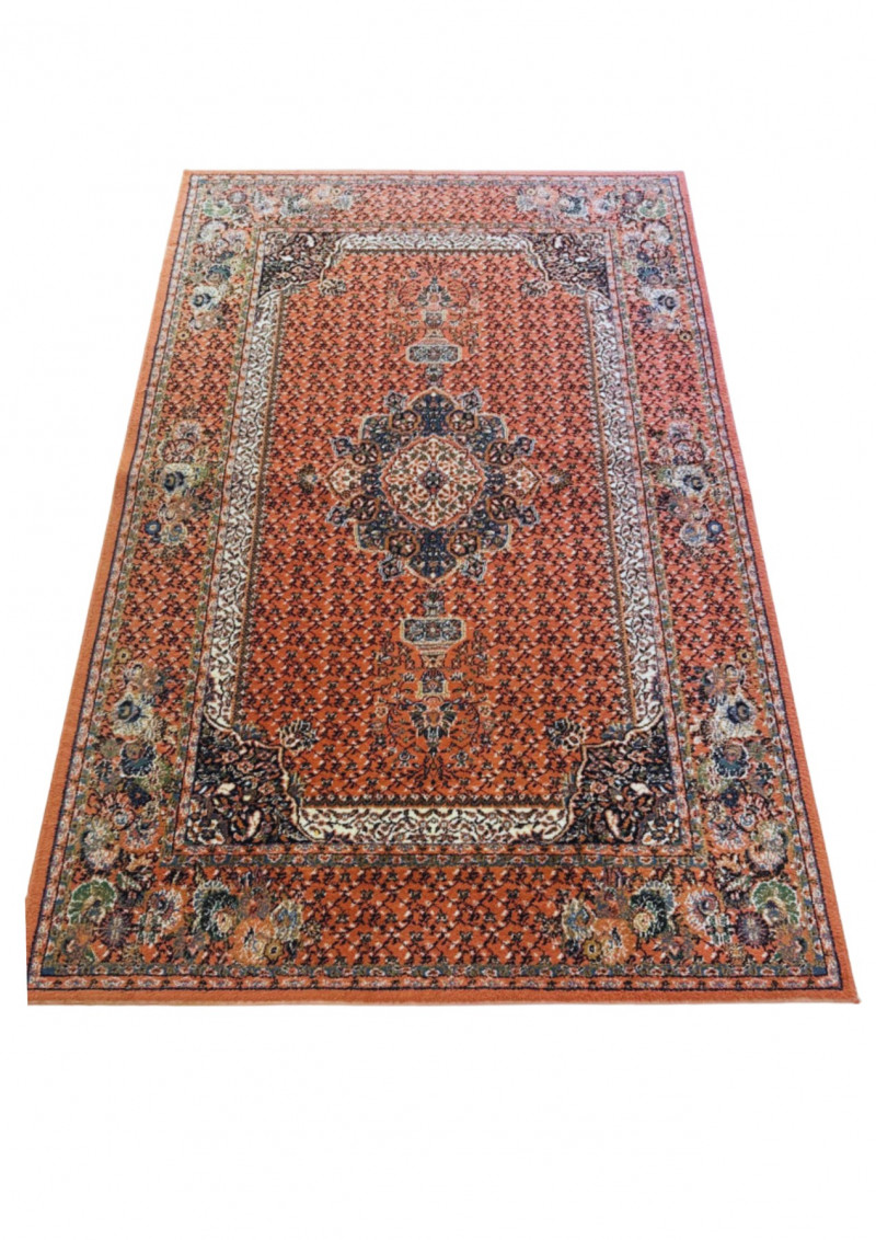 This late 20th-century rug reflects the export-driven Turkish carpet industry of the 1990s. While machine-made, it honors classic Ottoman and Anatolian design traditions, offering an affordable and durable alternative to hand-knotted pieces—ideal for both decorative and functional use.Machine-woven Turkish area rug in the Sakarya design, featuring a bold central medallion with floral motifs set against a vibrant orange field. Framed by a wide floral border with decorative corner spandrels, this piece blends traditional Anatolian aesthetics with modern durability.