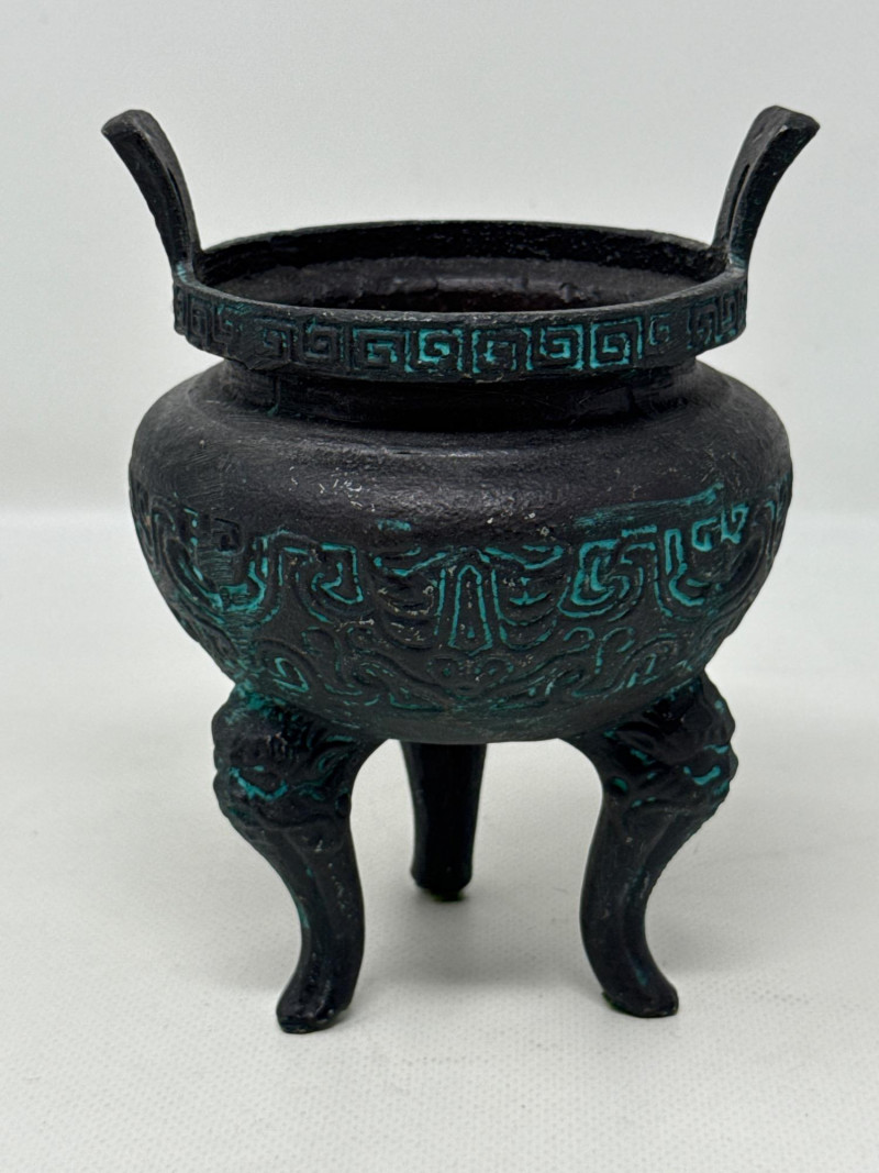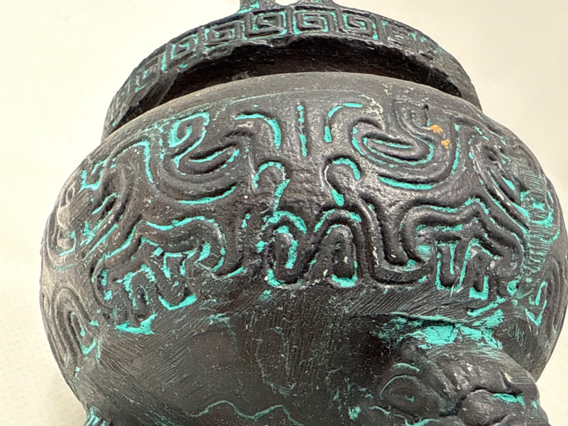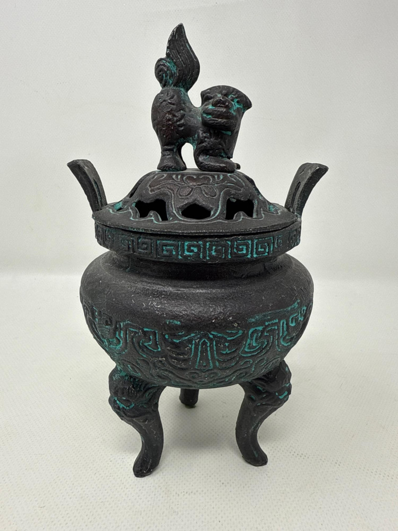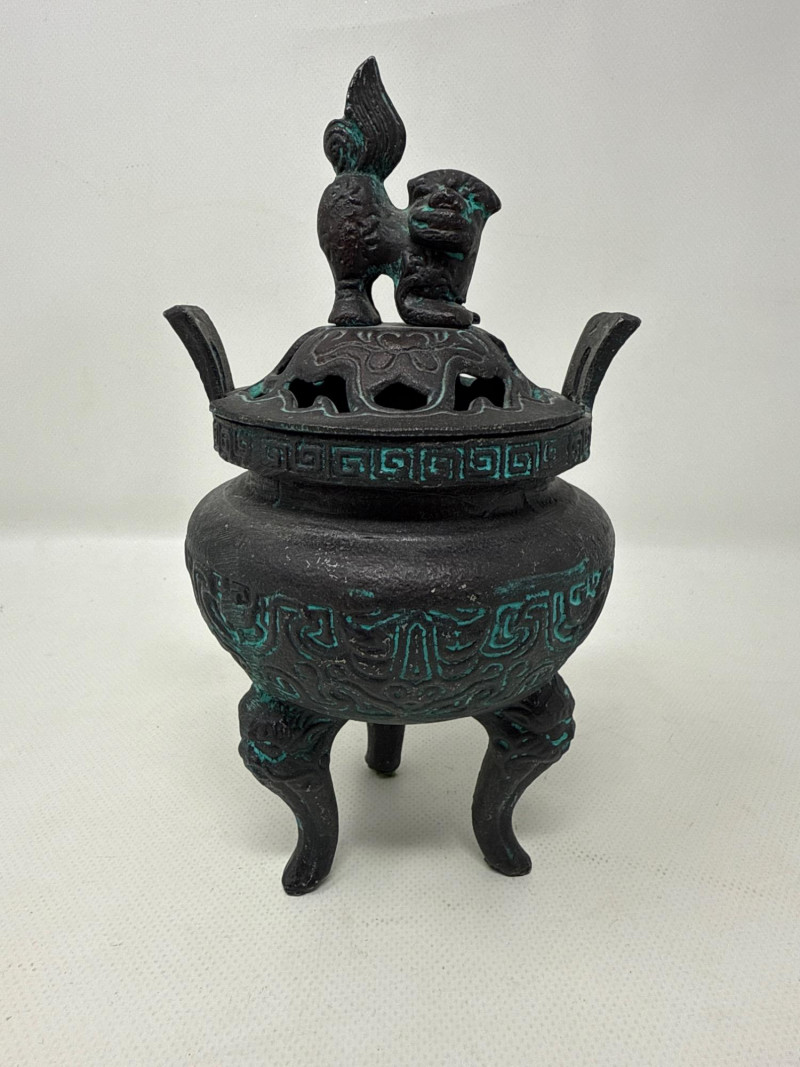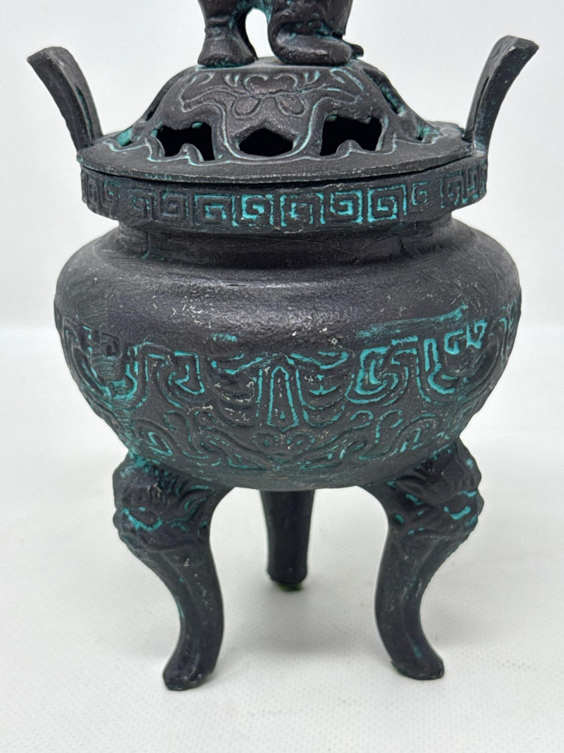 An early to mid-20th century Chinese incense burner, featuring a pierced lid topped with a metal Foo Dog (Shishi) finial. This tripod censer is inspired by ancient ritual bronzes and showcases traditional motifs with a rich patinated finish. Key Features: Form: Tripod incense burner with domed, pierced lid Finial: Cast metal Foo Dog, symbolizing protection and vigilance Design Motifs: Archaic Taotie masks referencing Shang and Zhou dynasty bronzes Meander (Greek key) borders for classical symmetry Applied turquoise-green patina for aged character Handles: Twin side handles for ceremonial balance Support: Three sturdy legs in traditional tripod form Material: Bronze or bronzed metal throughout, including Foo Dog finial Period: Republic Period or later (early to mid-20th century) Function: Used for burning incense in ritual or decorative settings Collecting Note: