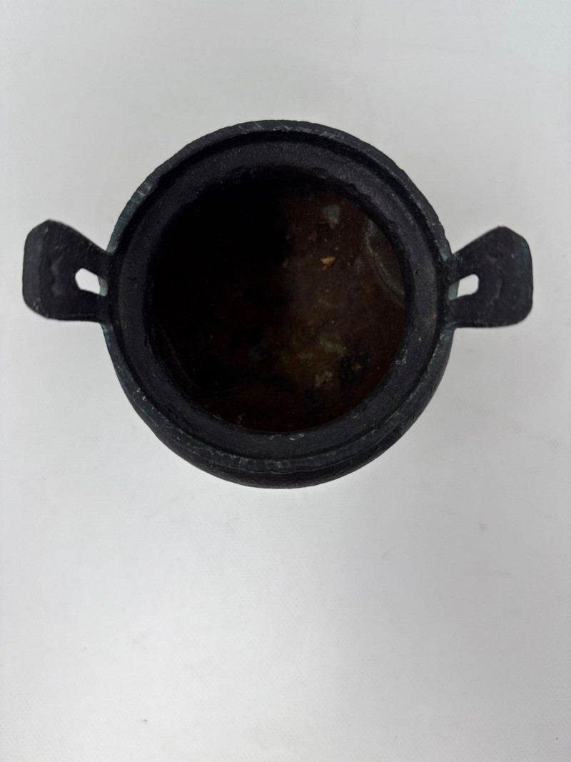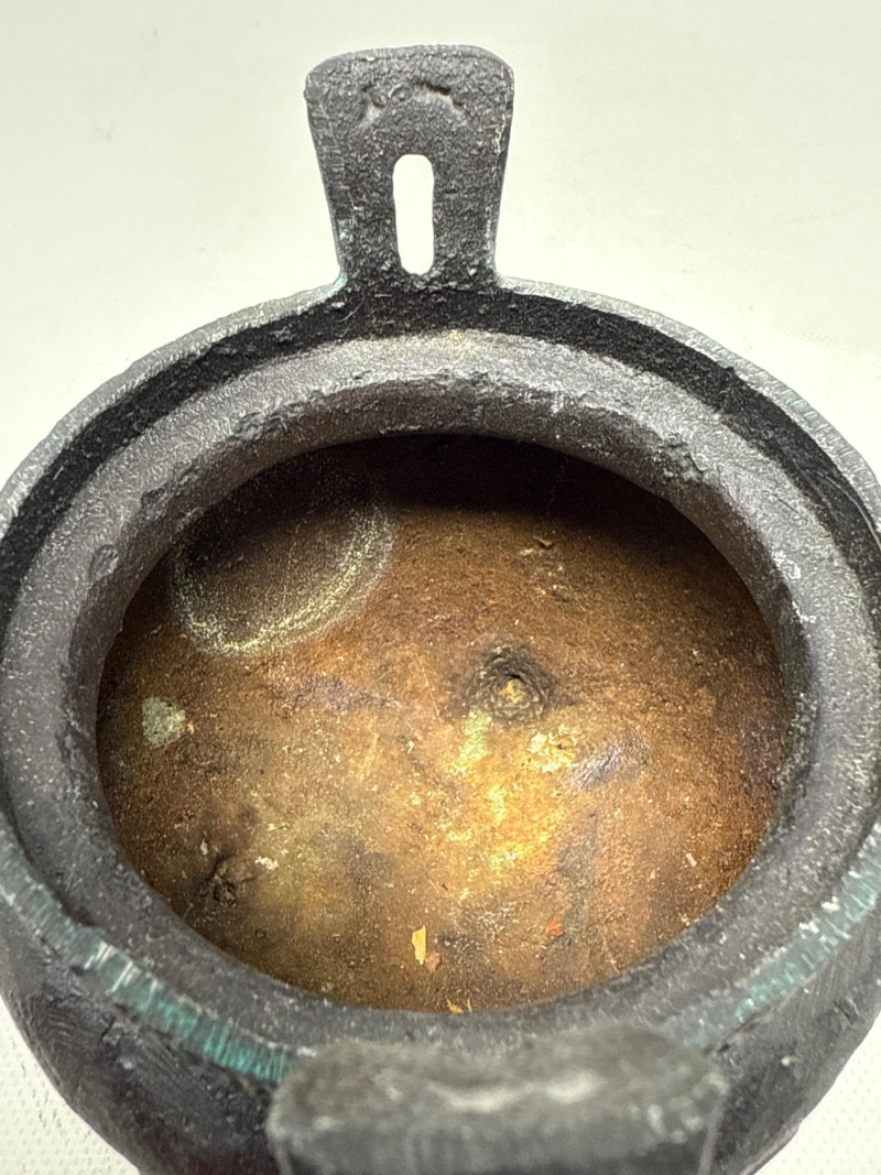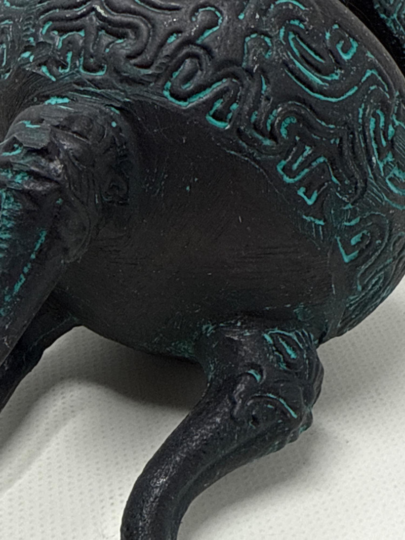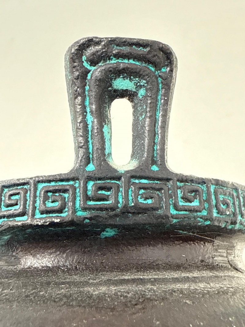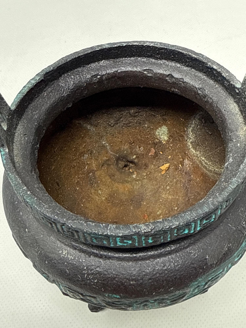 An early to mid-20th century Chinese incense burner, featuring a pierced lid topped with a metal Foo Dog (Shishi) finial. This tripod censer is inspired by ancient ritual bronzes and showcases traditional motifs with a rich patinated finish. Key Features: Form: Tripod incense burner with domed, pierced lid Finial: Cast metal Foo Dog, symbolizing protection and vigilance Design Motifs: Archaic Taotie masks referencing Shang and Zhou dynasty bronzes Meander (Greek key) borders for classical symmetry Applied turquoise-green patina for aged character Handles: Twin side handles for ceremonial balance Support: Three sturdy legs in traditional tripod form Material: Bronze or bronzed metal throughout, including Foo Dog finial Period: Republic Period or later (early to mid-20th century) Function: Used for burning incense in ritual or decorative settings Collecting Note: