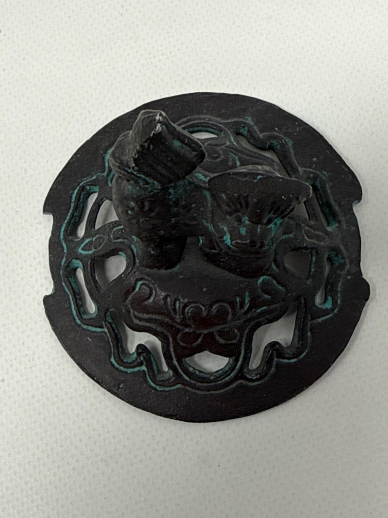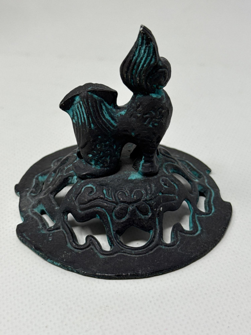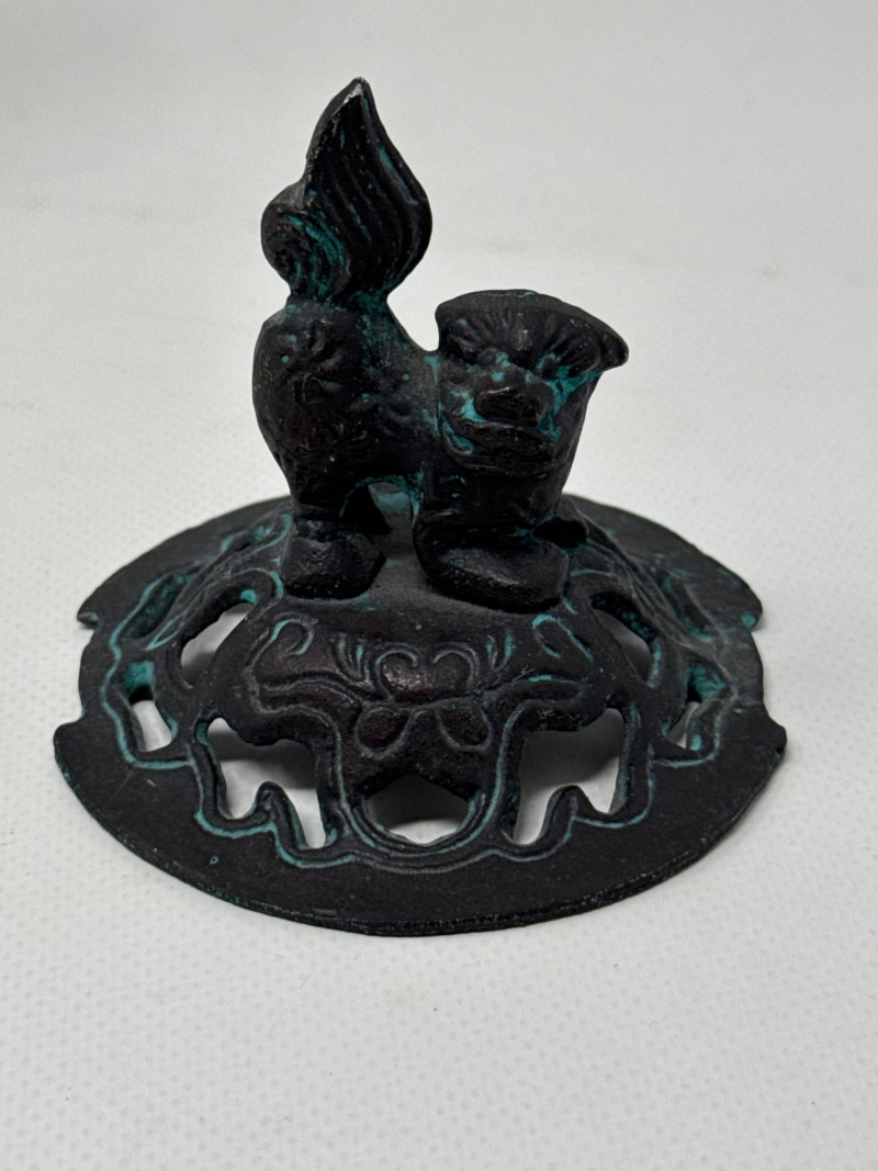 This incense burner reflects the revivalist spirit of early 20th-century Chinese artisans, blending ancient symbolism with modern metalwork. The metal Foo Dog finial adds a bold, protective presence, making this piece both functional and culturally resonant.Vintage Chinese Bronze Incense Burner with Metal Foo Dog Finial