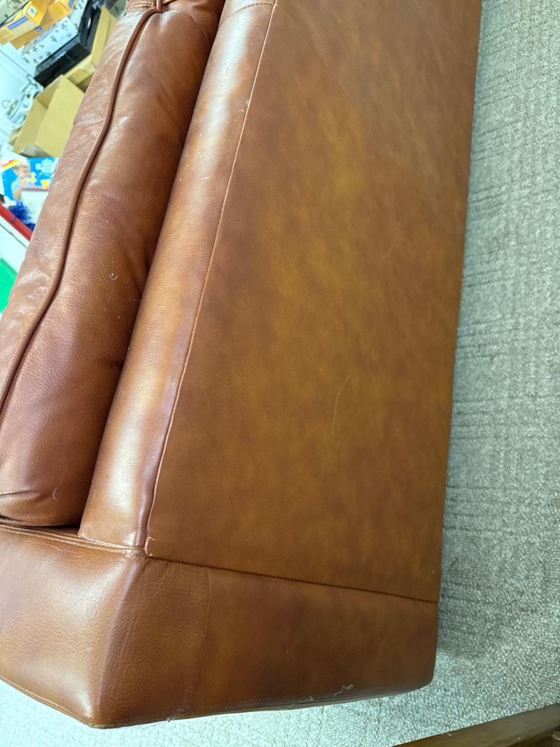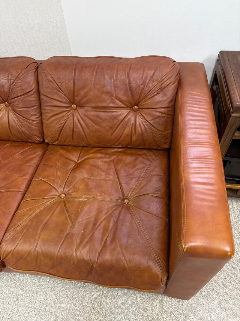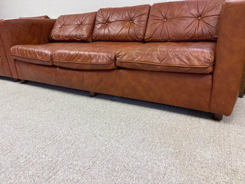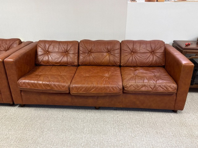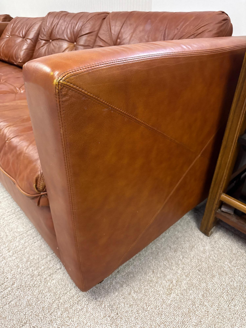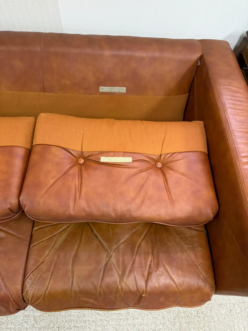 Schaefer Brothers of New Jersey was a respected American furniture manufacturer known for producing high-quality leather seating in the mid-to-late 20th century. Their sofas were recognized for resilient materials, lasting construction, and understated modern lines, making them highly collectible today. Details: Maker: Schaefer Brothers, New Jersey Style: Mid-Century / 1970s Modern Upholstery: Brown leather Cushion Filling: 100% Astrofill polyester fiberfill (labeled) Features: Button-tufted back and seat cushions Straight square armrests Removable cushions with fabric underside Low wood legs *Very Heavy. Must bring help and equipment to load.