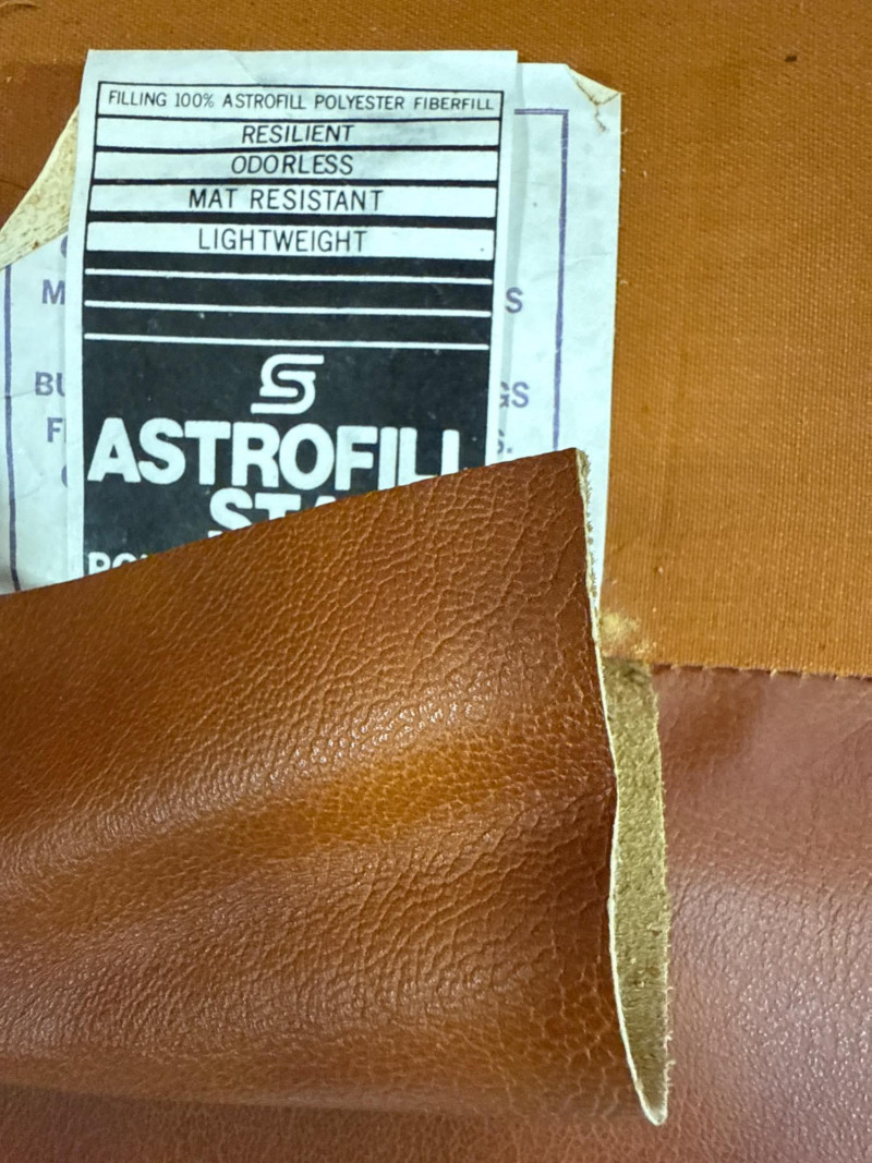 Vintage Schaefer Brothers Brown Leather Three-Seat Sofa A vintage three-seat sofa by Schaefer Brothers, upholstered in supple brown leather with button-tufted back and seat cushions. The design features straight square arms, low-profile wood feet, and removable cushions filled with Astrofill S.T.A. polyester fiberfill (labeled on underside). This piece reflects the mid-century modern to 1970s American design aesthetic, valued for its durability and timeless form. Maker Background: