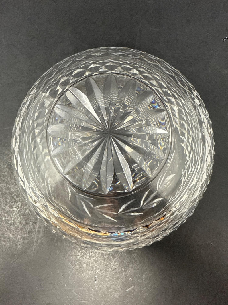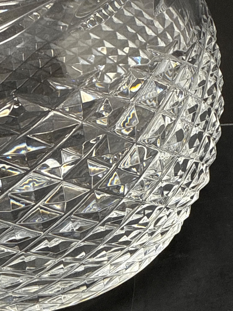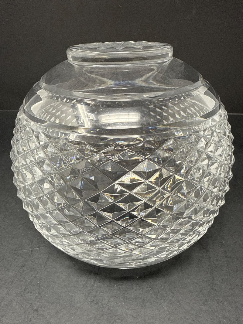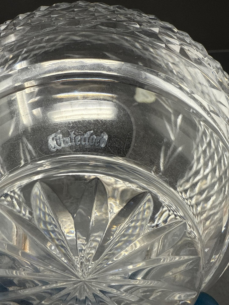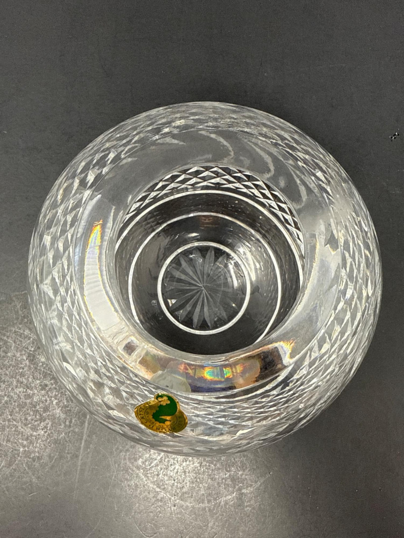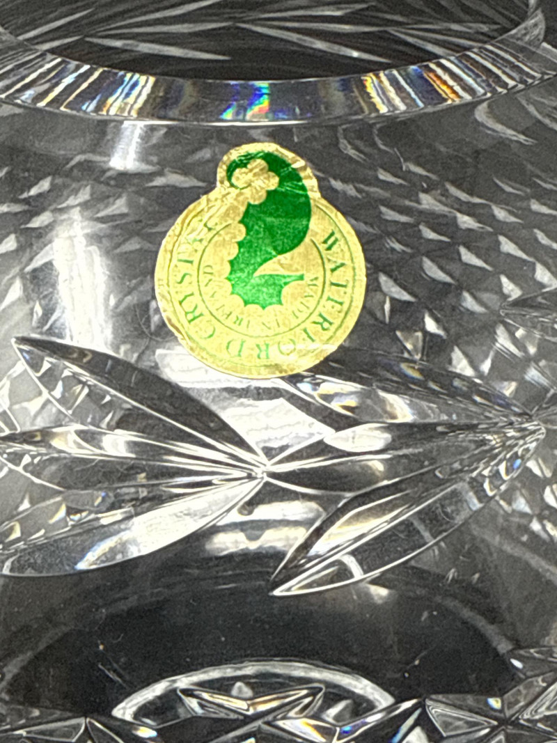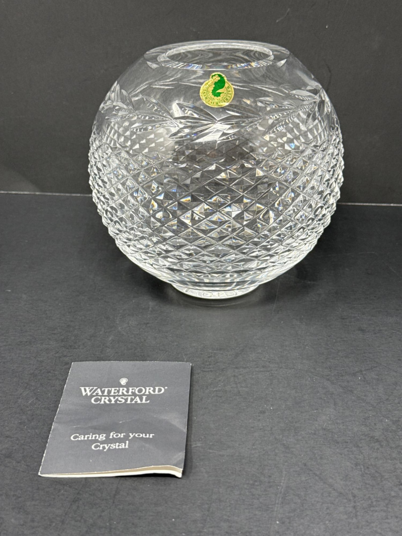 Waterford Crystal Glandore Rose Bowl with Original Label & Booklet A timeless piece of Irish craftsmanship, this hand-cut lead crystal rose bowl is designed in Waterford’s elegant Glandore pattern. The round bowl features a diamond lattice cut with elongated leaf and fan motifs, finished with a radiant starburst base. The underside bears the acid-etched “Waterford” signature, and the original green-and-gold foil label remains intact. Included is the original Waterford care booklet, adding provenance and charm for collectors. Details Maker: Waterford Crystal, Ireland Pattern: Glandore Form: Rose bowl / globe vase Material: Full lead crystal Markings: Acid-etched “Waterford” signature; original foil sticker Additional: Original Waterford care booklet included Collecting Note: The Glandore pattern, named after the picturesque village in County Cork, Ireland, is prized for its intricate diamond cutting and balanced proportions. Rose bowls in this pattern remain a desirable centerpiece for collectors of fine Irish crystal, especially when accompanied by their original label and literature.