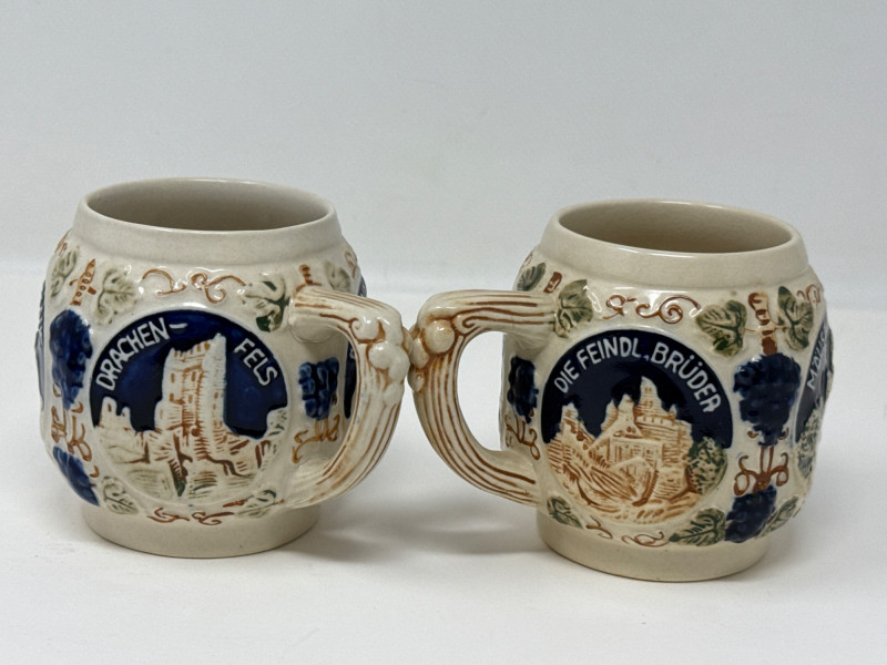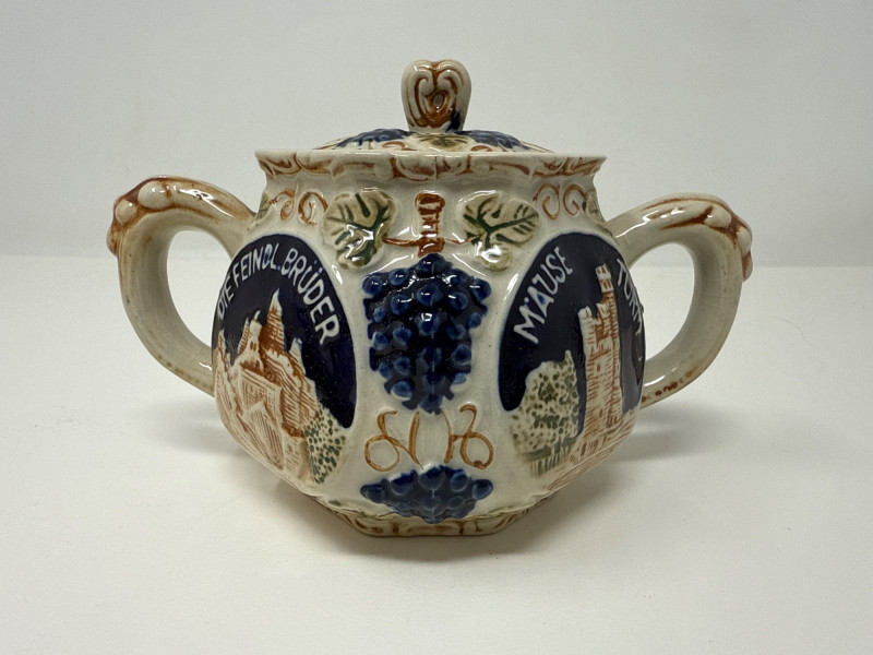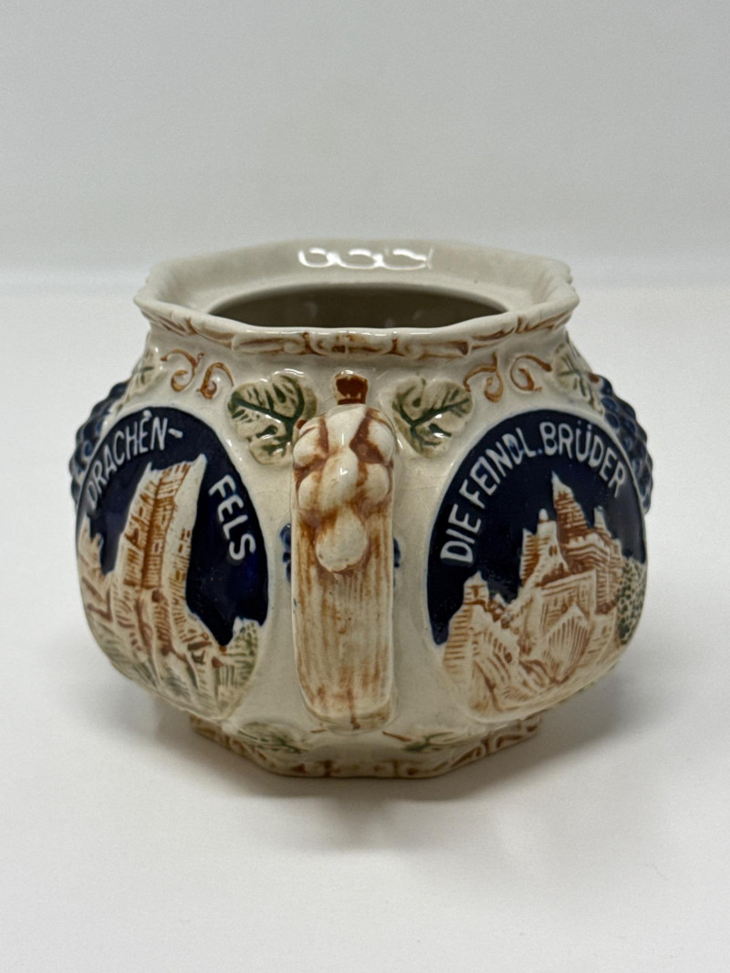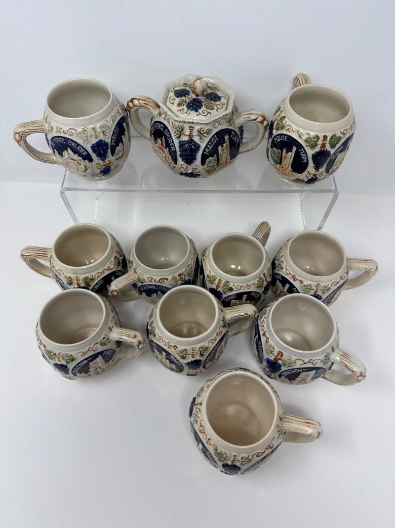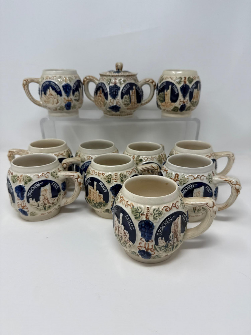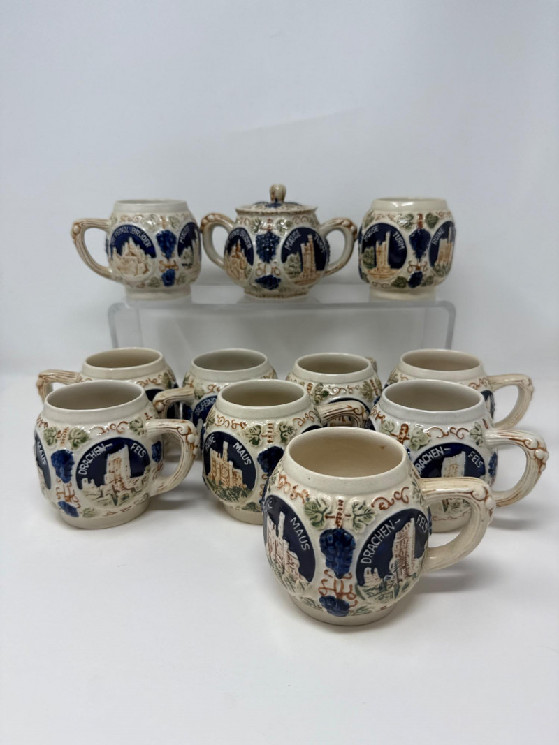Vintage Cerart Crystal China Gerz Style Sugar Dish with Lid & Mugs A vintage Cerart Crystal China ceramic drinkware set, decorated in the Gerz style of German steinware. Relief decoration features grapes, vine leaves, and castle landmarks along the Rhine River, including: Drachenfels Mäuseturm Die Feindl Brüder (1) Covered sugar dish with lid and double handles (10) Matching handled mugs Maker: Cerart Crystal China (original foil label under base) Material: Glazed ceramic Style: Gerz-inspired German souvenir steinware reproductionSet Includes: