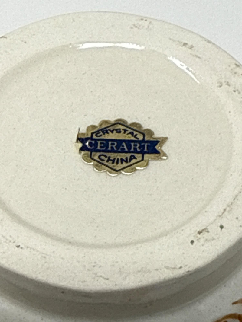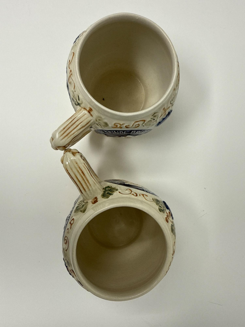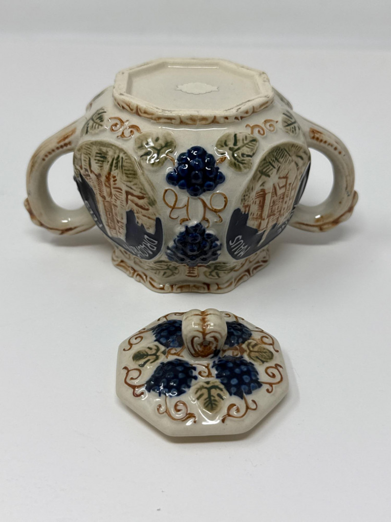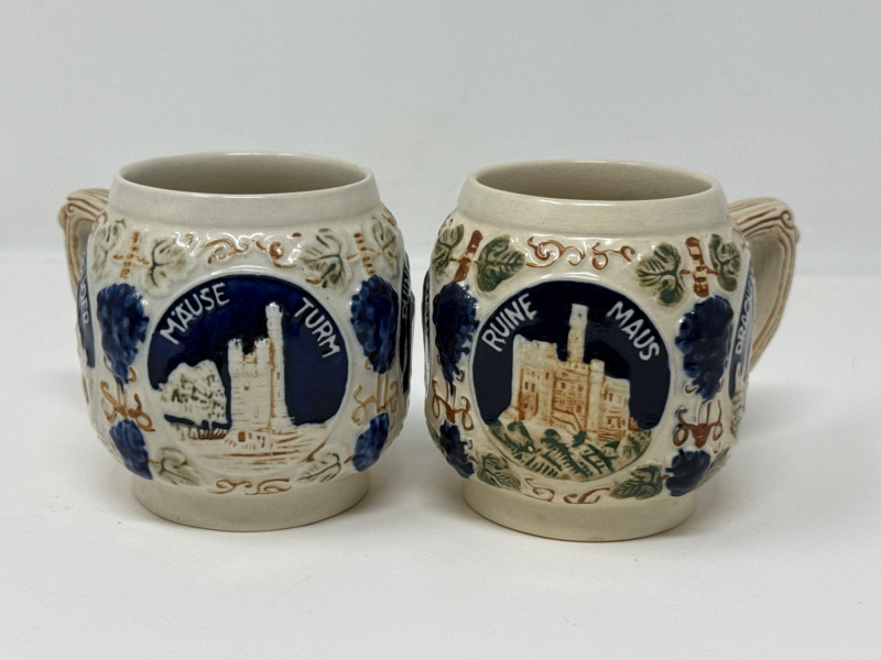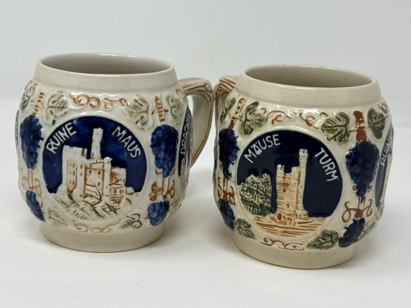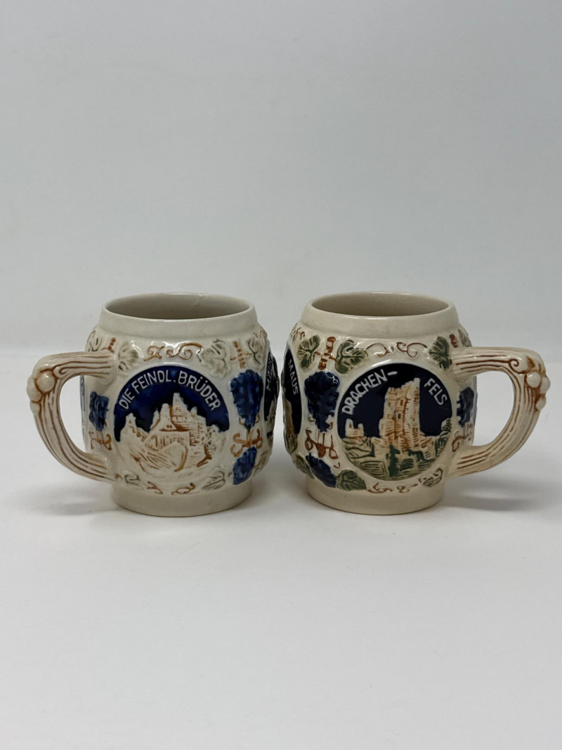 Vintage Cerart Crystal China Gerz Style Sugar Dish with Lid & Mugs A vintage Cerart Crystal China ceramic drinkware set, decorated in the Gerz style of German steinware. Relief decoration features grapes, vine leaves, and castle landmarks along the Rhine River, including: Drachenfels Mäuseturm Die Feindl Brüder (1) Covered sugar dish with lid and double handles (10) Matching handled mugs Maker: Cerart Crystal China (original foil label under base) Material: Glazed ceramic Style: Gerz-inspired German souvenir steinware reproductionSet Includes: