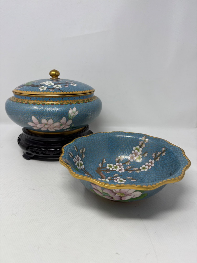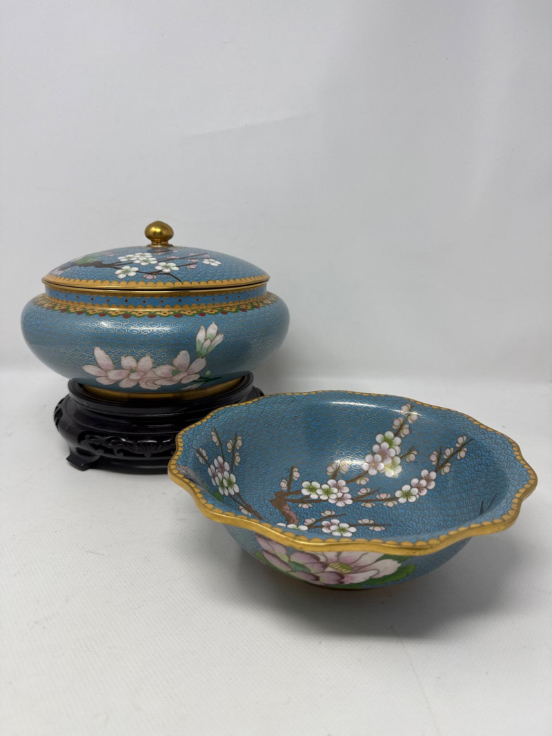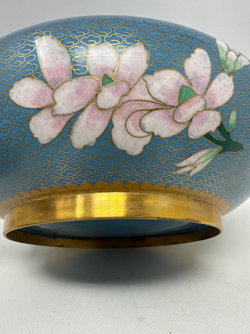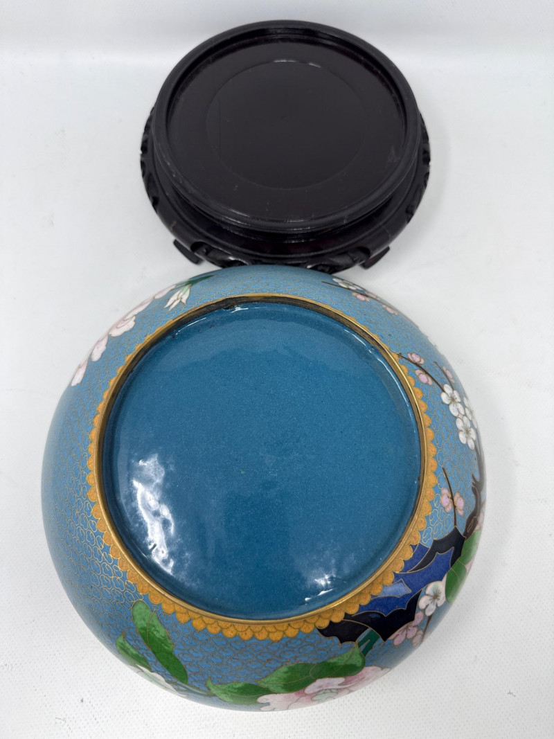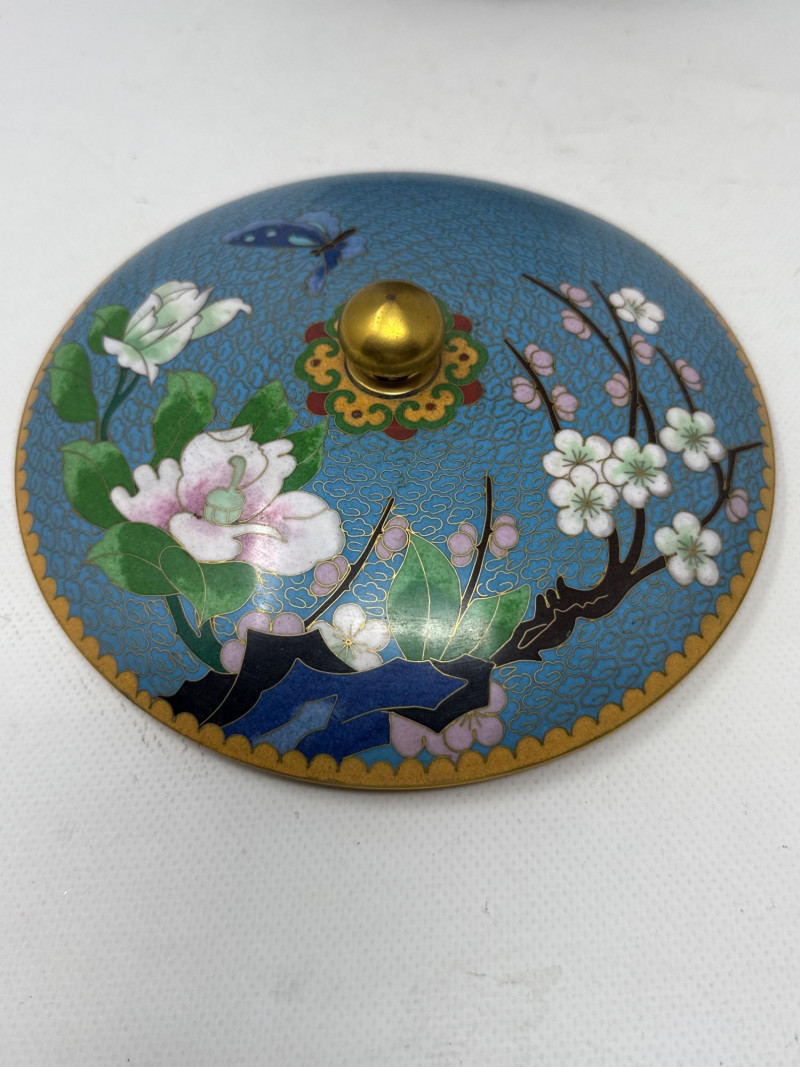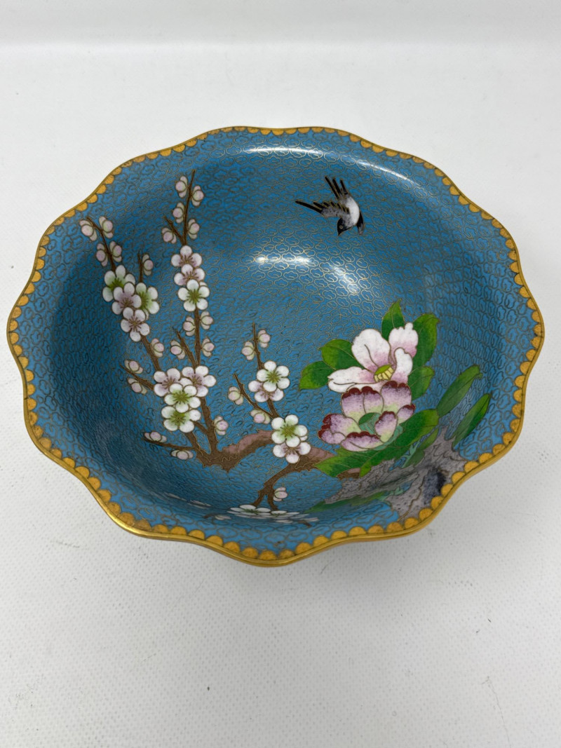 Pair of Vintage Chinese Cloisonné Bowls – Blue & Gold Floral Motifs A beautifully matched of mid-20th century Chinese cloisonné bowls, showcasing traditional artistry with vibrant enamel work and graceful motifs. Design: Rounded form with domed lid and gilt finial Decoration: Blossoms and butterflies on a turquoise-blue ground Interior/Base: Finished in smooth turquoise enamel Dimensions: Approx. 9 in wide × 6 in tall (excluding wood stand) Design: Open bowl with scalloped edge Decoration: Flowering branches and a swallow in flight Finish: Gilt rim and base Dimensions: Approx. 8.2 in wide × 2.75 in tall Material: Cloisonné on brass with gilt accents Motifs: Butterflies, blossoms, and birds Period: Likely mid-20th century (Republic period or later)Lidded Bowl with Stand: