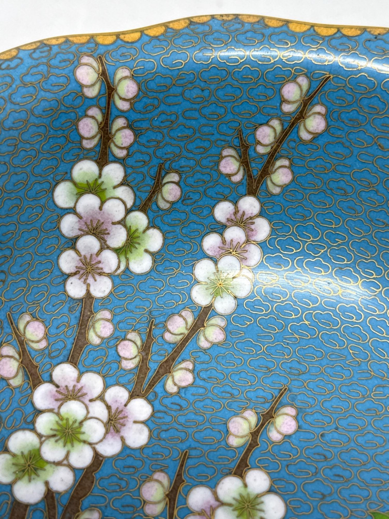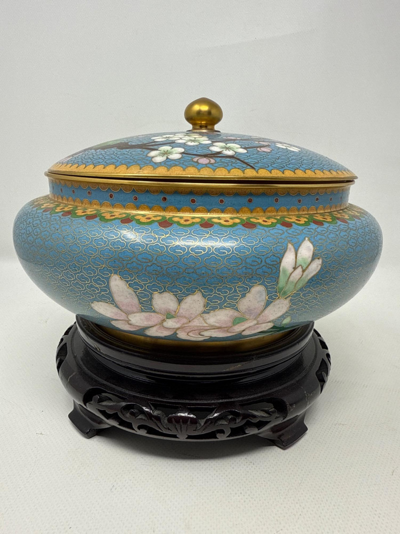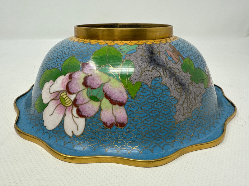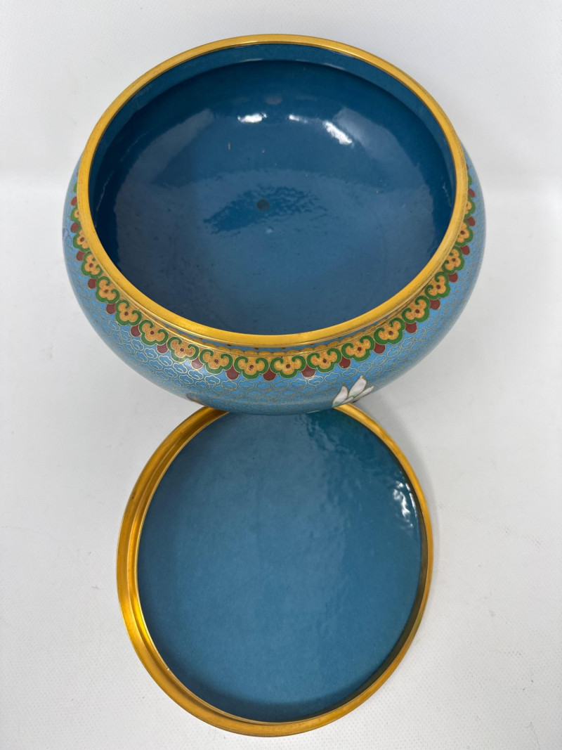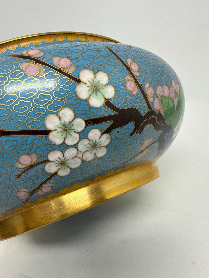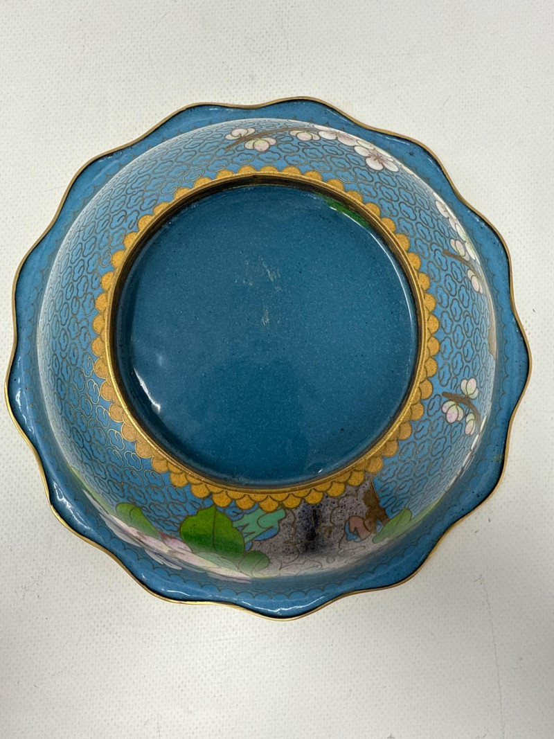 Pair of Vintage Chinese Cloisonné Bowls – Blue & Gold Floral Motifs A beautifully matched of mid-20th century Chinese cloisonné bowls, showcasing traditional artistry with vibrant enamel work and graceful motifs. Design: Rounded form with domed lid and gilt finial Decoration: Blossoms and butterflies on a turquoise-blue ground Interior/Base: Finished in smooth turquoise enamel Dimensions: Approx. 9 in wide × 6 in tall (excluding wood stand) Design: Open bowl with scalloped edge Decoration: Flowering branches and a swallow in flight Finish: Gilt rim and base Dimensions: Approx. 8.2 in wide × 2.75 in tall Material: Cloisonné on brass with gilt accents Motifs: Butterflies, blossoms, and birds Period: Likely mid-20th century (Republic period or later)Lidded Bowl with Stand: