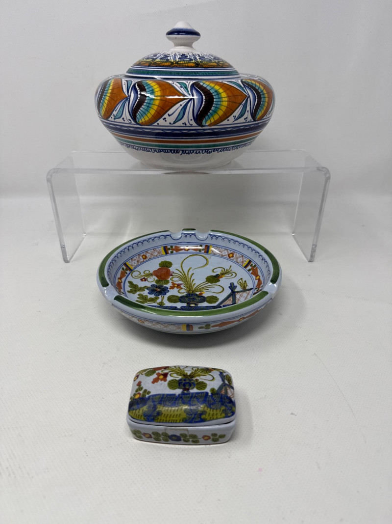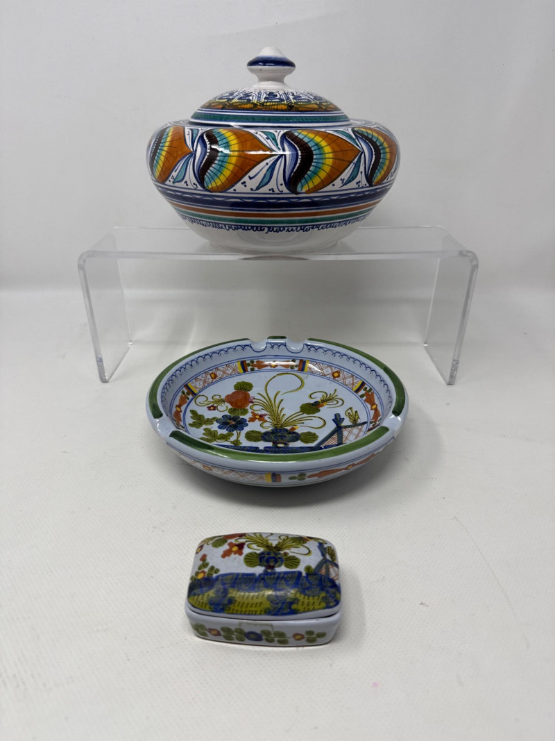 Italian Faenza Majolica Pieces – Lidded Jar, Ashtray, and Trinket Box