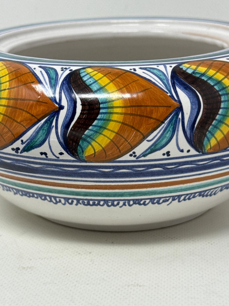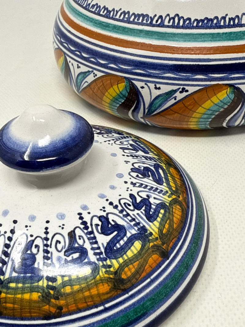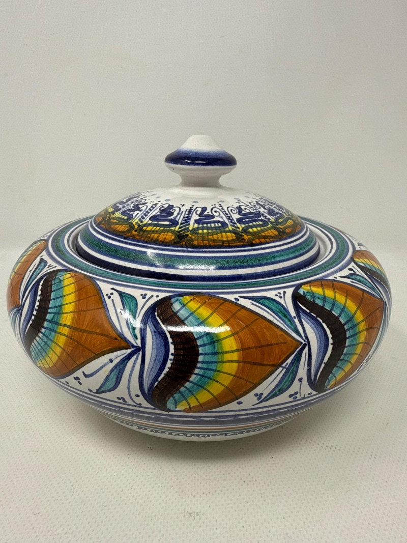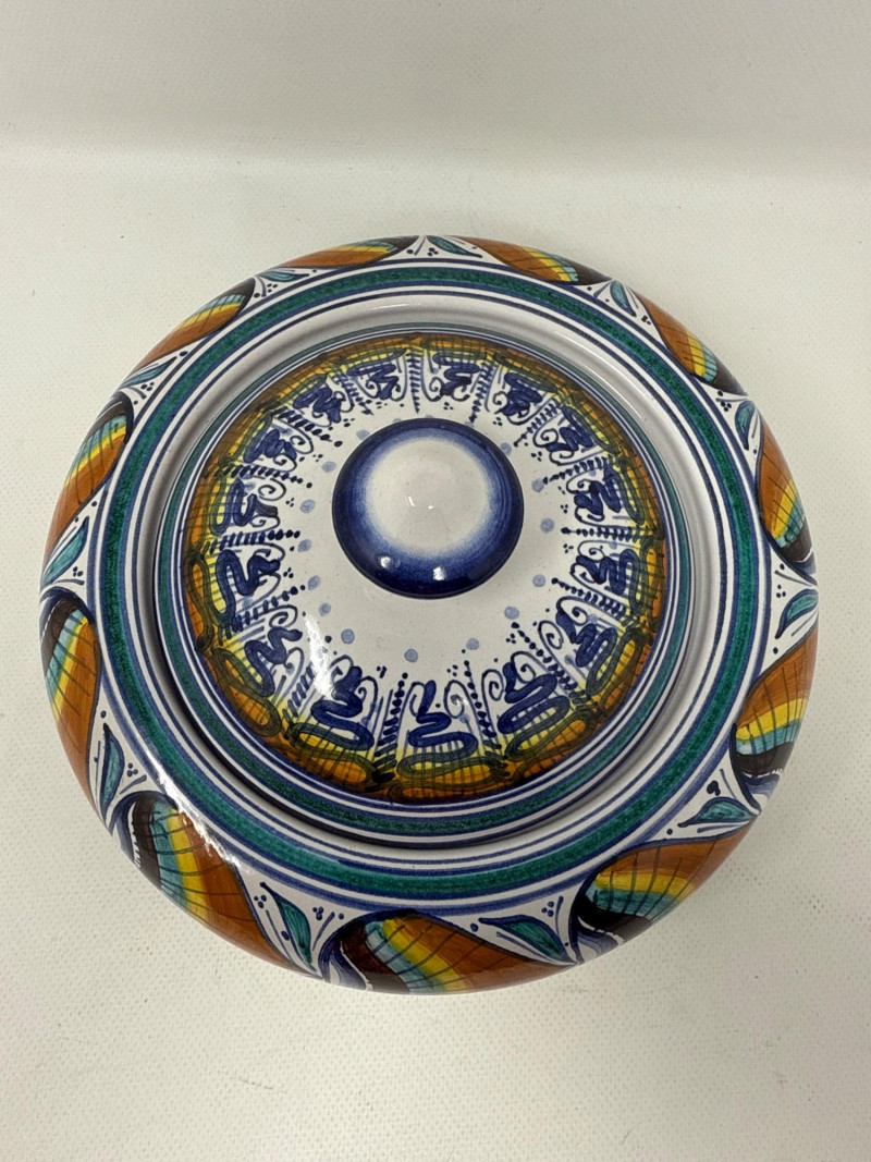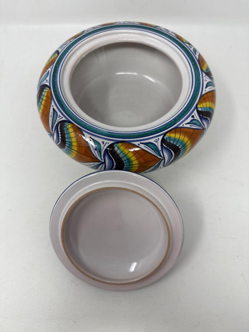 Covered Jar (Signed “FAENZA” with workshop marks): Rounded form with domed lid, decorated with bold geometric leaf patterns in blue, green, yellow, and orange.