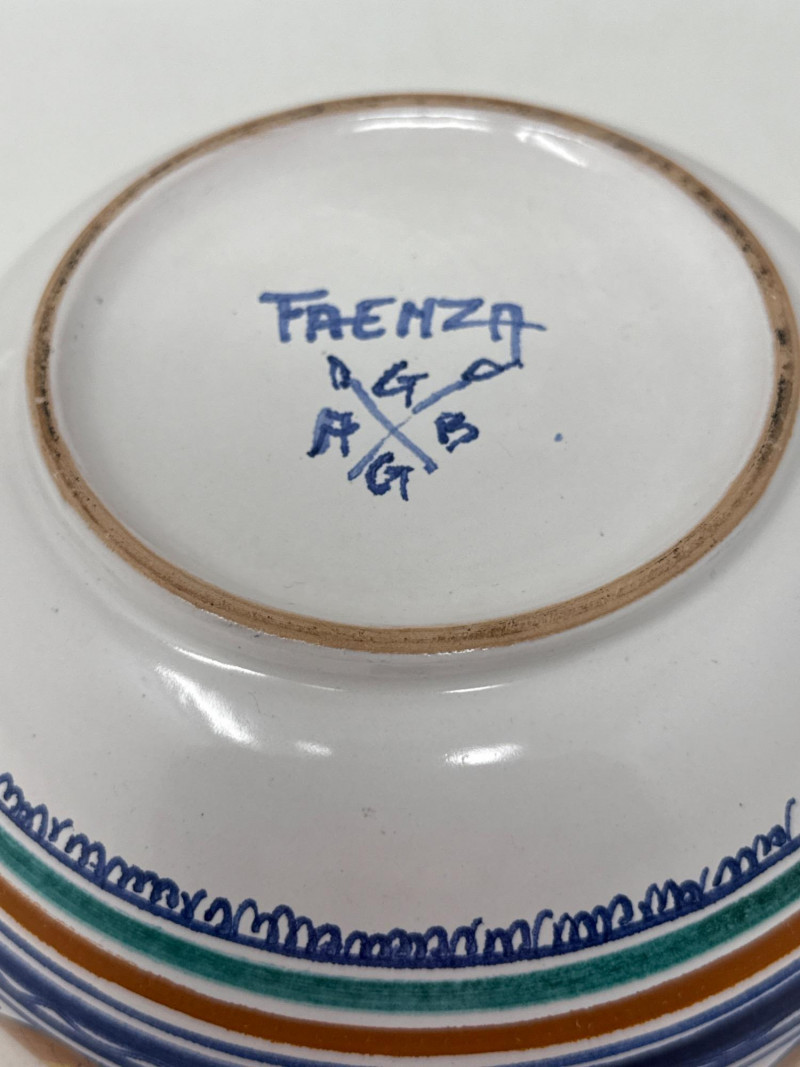 This lot includes three hand-painted Faenza ceramic pieces, all decorated in traditional Italian maiolica style with colorful floral and geometric motifs. Each piece is marked on the underside, confirming origin from Faenza, Italy — a region renowned for its pottery since the Renaissance.