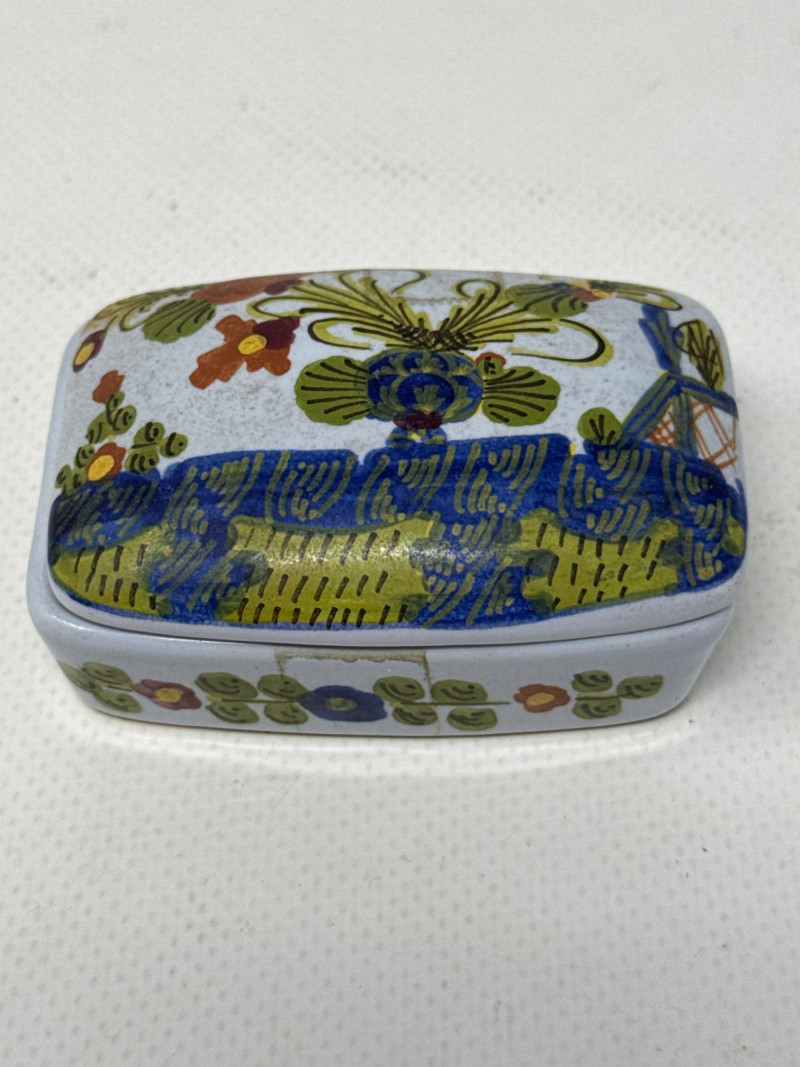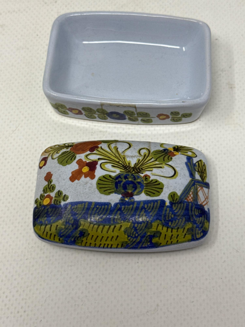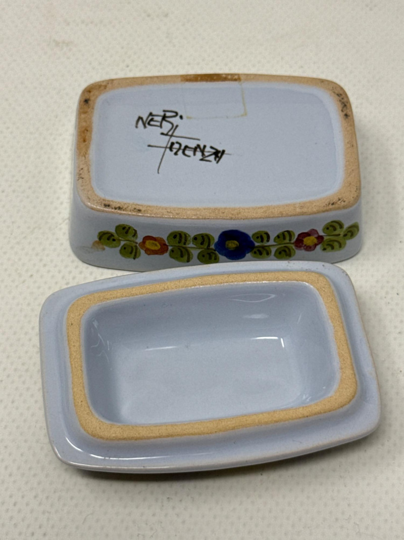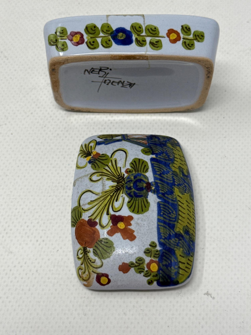 Rectangular Trinket Box (Signed “Neri Faenza”): Floral decoration on lid and sides, hand-painted in vivid polychrome.