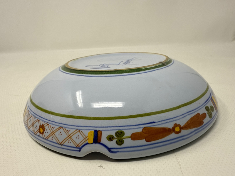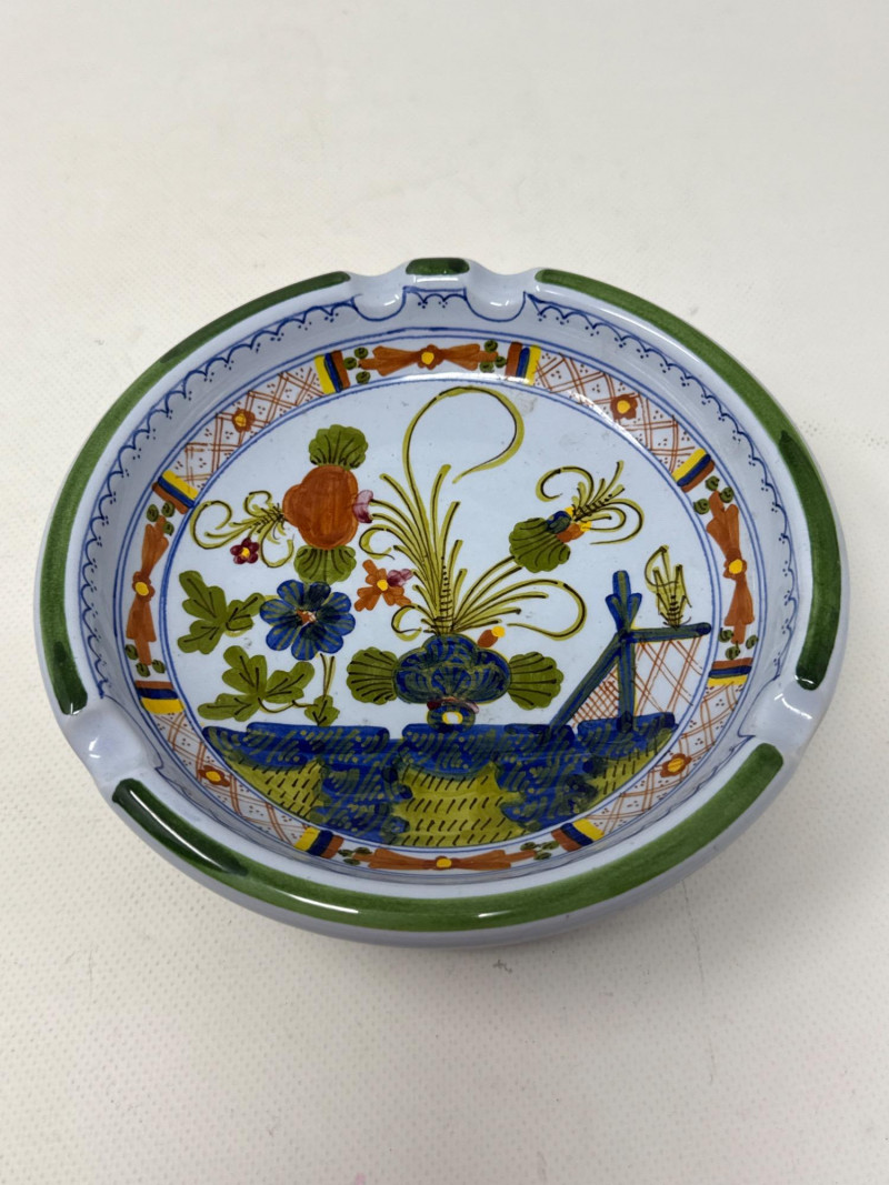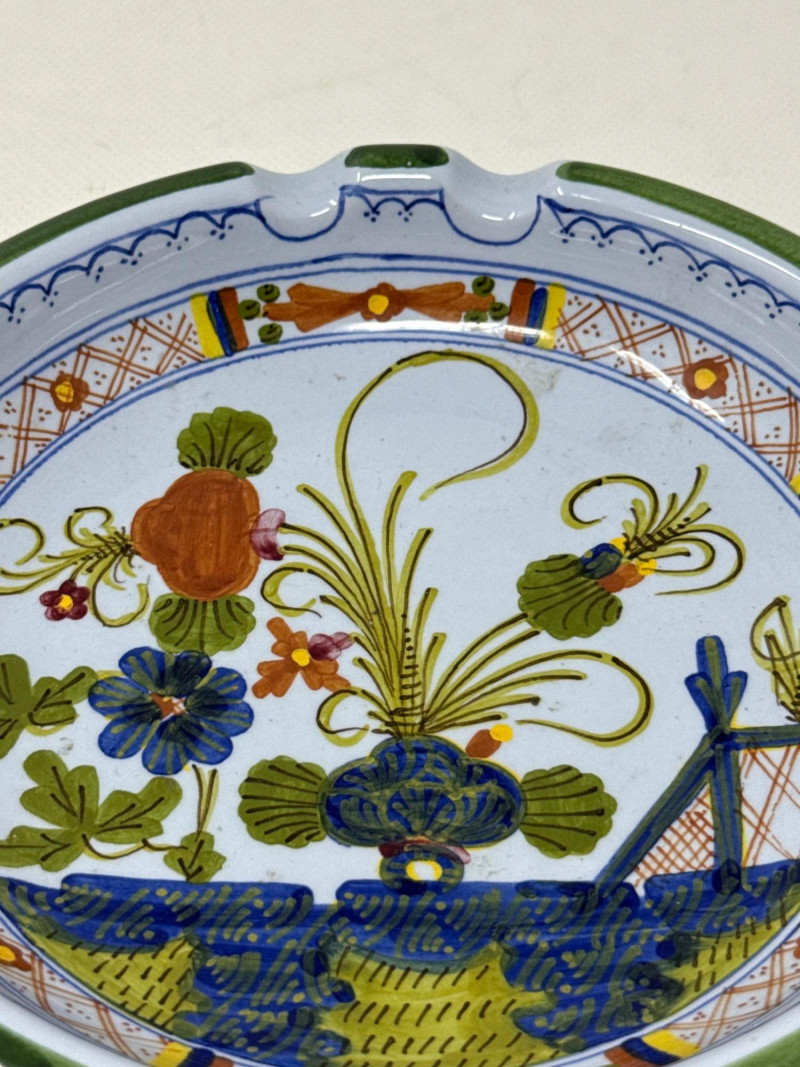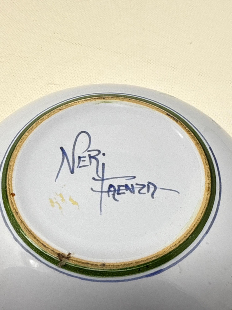 Round Ashtray (Signed “Neri Faenza”): Featuring a central floral bouquet and patterned border, with three cigarette rests.