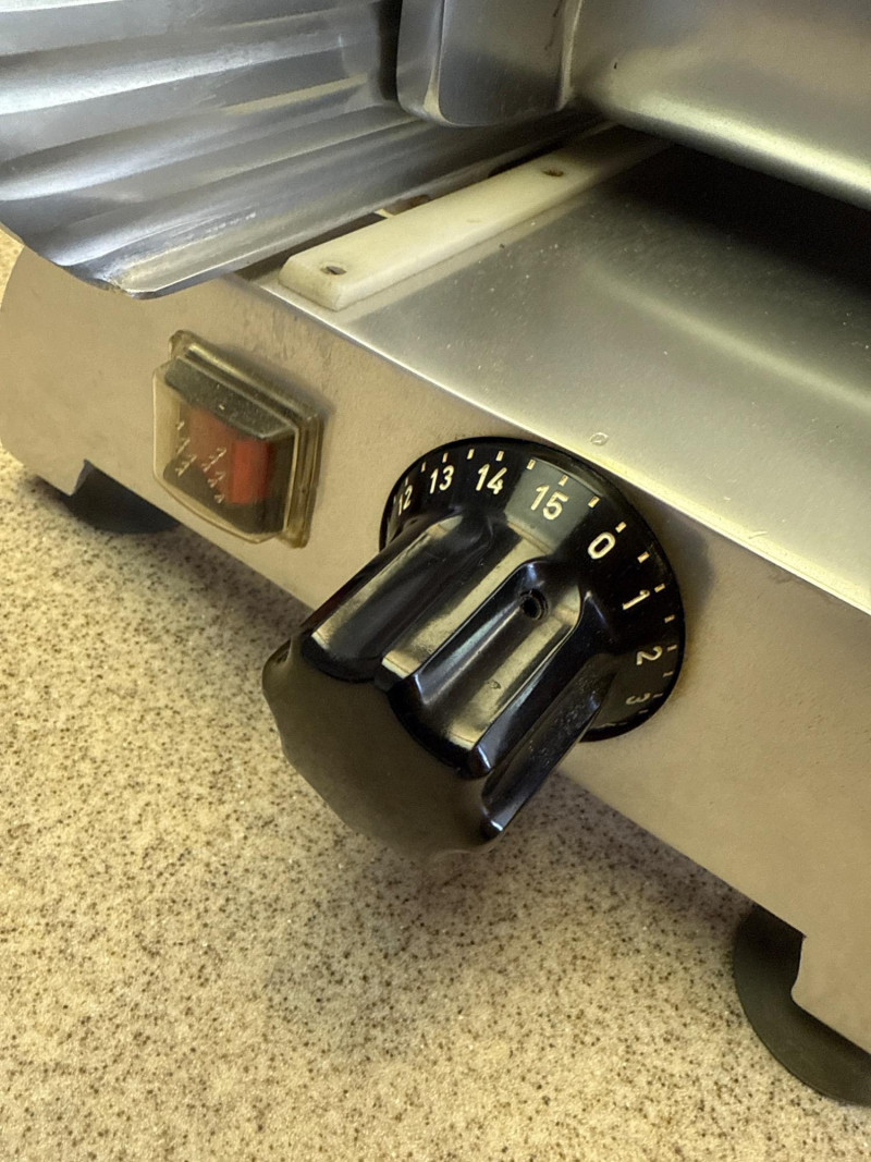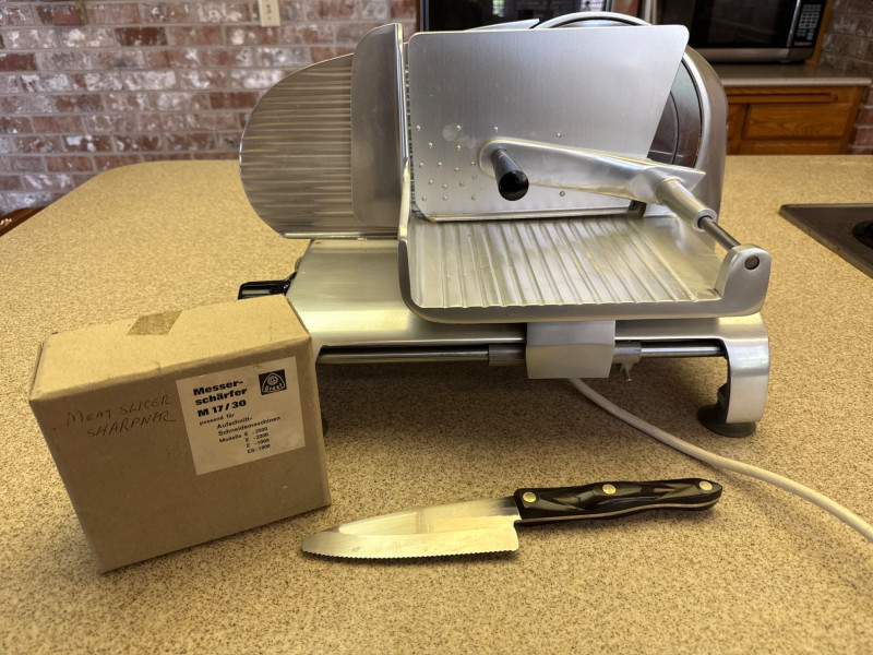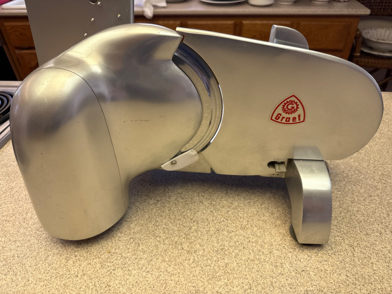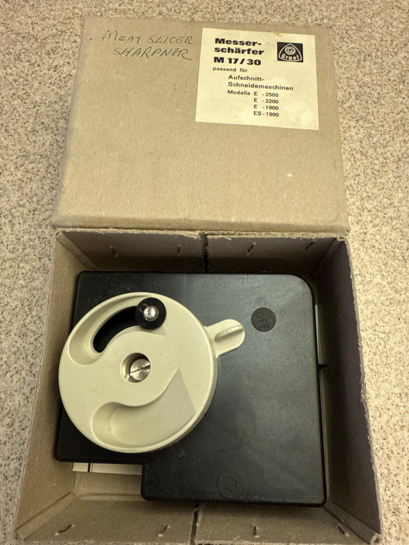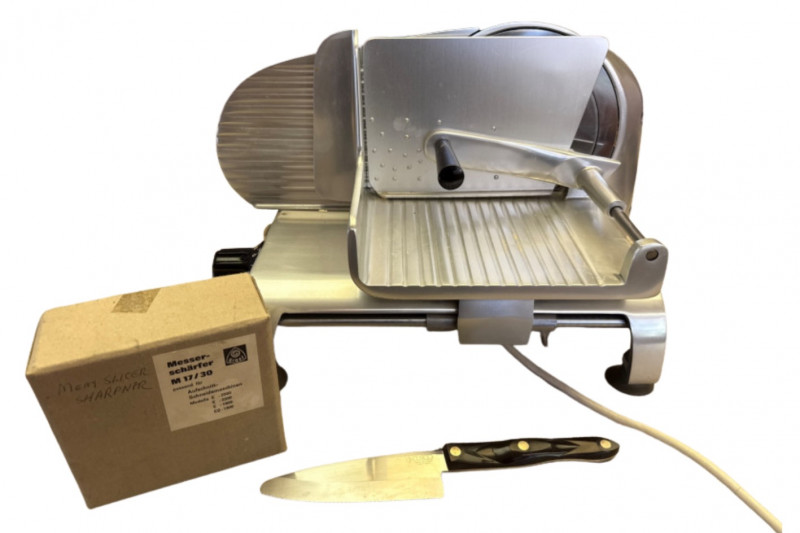 Offered is a Graef Model E-2200 M.U. commercial meat slicer, made in Germany. This professional-grade slicer features a heavy-duty aluminum housing, adjustable thickness control, and a smooth-glide food carriage with pusher guard for safe, precise operation. Heavy-duty commercial-grade construction Adjustable slicing thickness dial Aluminum housing with integrated safety features Food carriage and pusher guard Dimensions: 19 in L × 12 in W × 13 in H Specs: 120V, 60Hz, 0.25 kW Original boxed accessory Compatible with Graef slicer models: E-2500, E-2200, E-1900, ES-1900 Serrated edge, black triple-rivet handle Marked: “CUTCO – Olean, NY – Made in U.S.A.” Made in the U.S.A.Graef Commercial Meat Slicer with Sharpener & Cutco Utility Knife