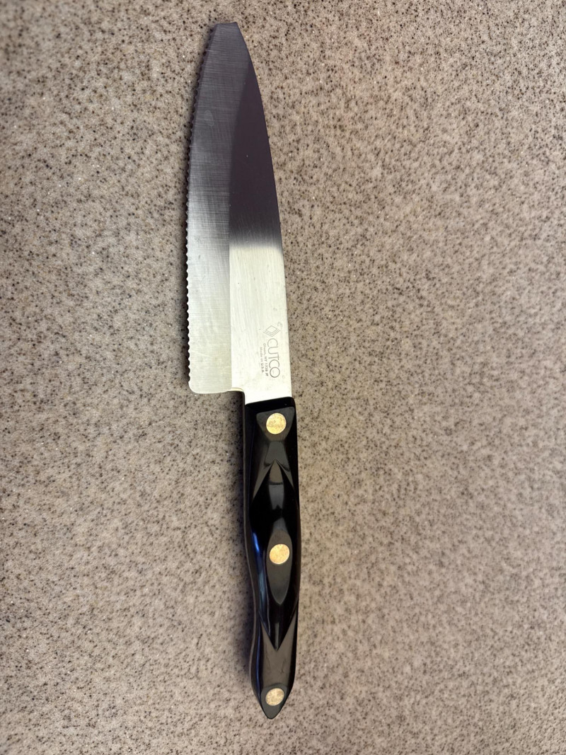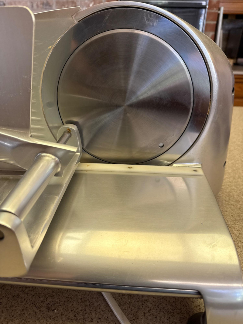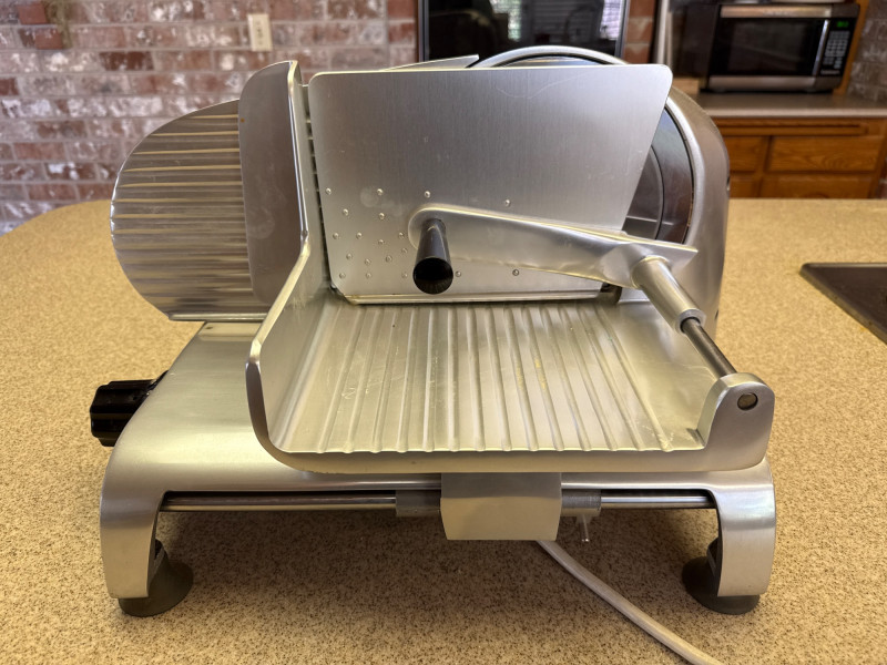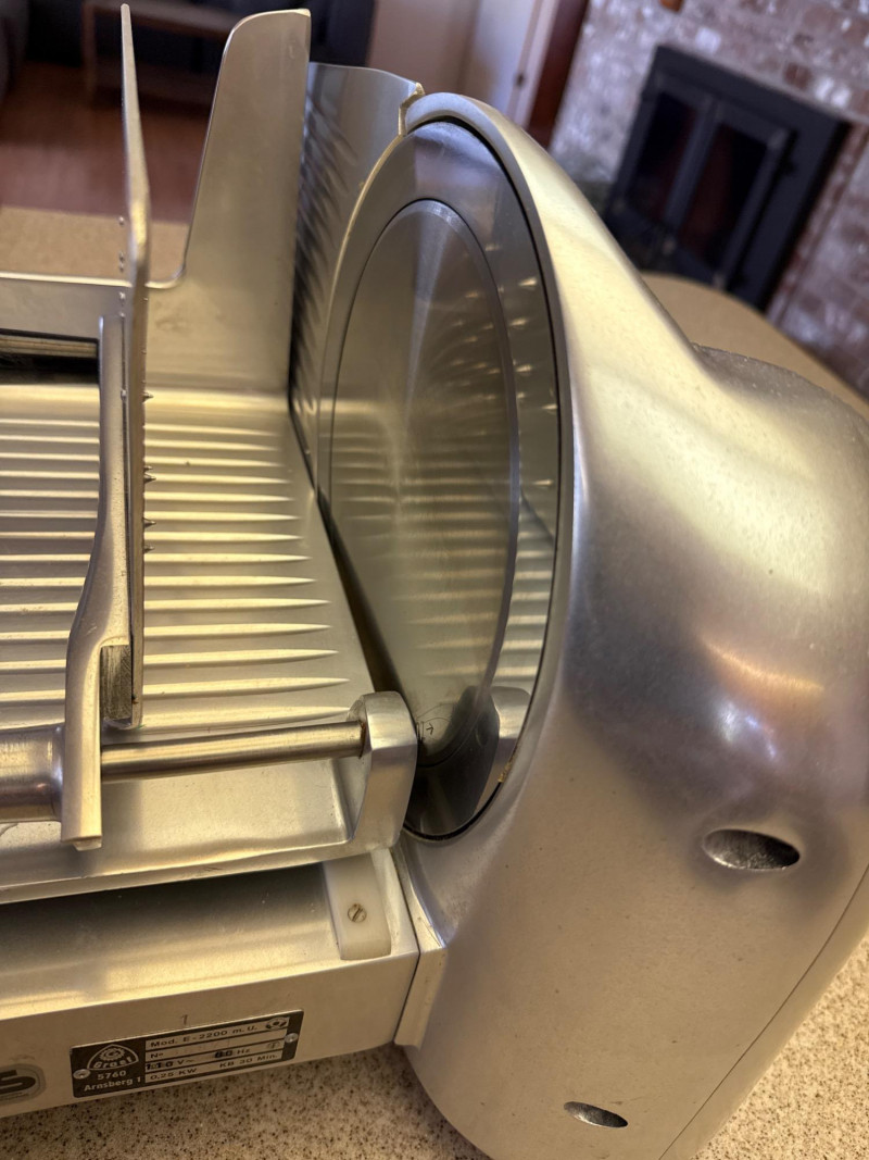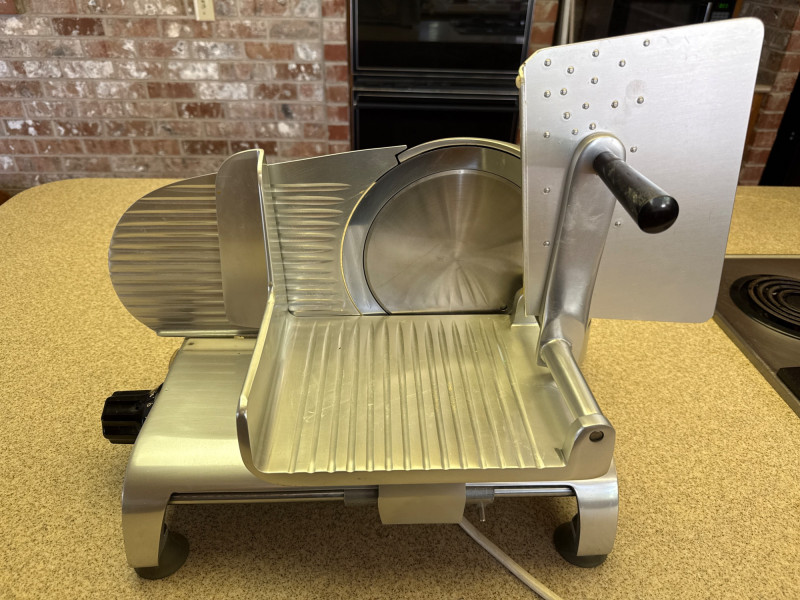 Offered is a Graef Model E-2200 M.U. commercial meat slicer, made in Germany. This professional-grade slicer features a heavy-duty aluminum housing, adjustable thickness control, and a smooth-glide food carriage with pusher guard for safe, precise operation. Heavy-duty commercial-grade construction Adjustable slicing thickness dial Aluminum housing with integrated safety features Food carriage and pusher guard Dimensions: 19 in L × 12 in W × 13 in H Specs: 120V, 60Hz, 0.25 kW Original boxed accessory Compatible with Graef slicer models: E-2500, E-2200, E-1900, ES-1900 Serrated edge, black triple-rivet handle Marked: “CUTCO – Olean, NY – Made in U.S.A.” Made in the U.S.A.Graef Commercial Meat Slicer with Sharpener & Cutco Utility Knife