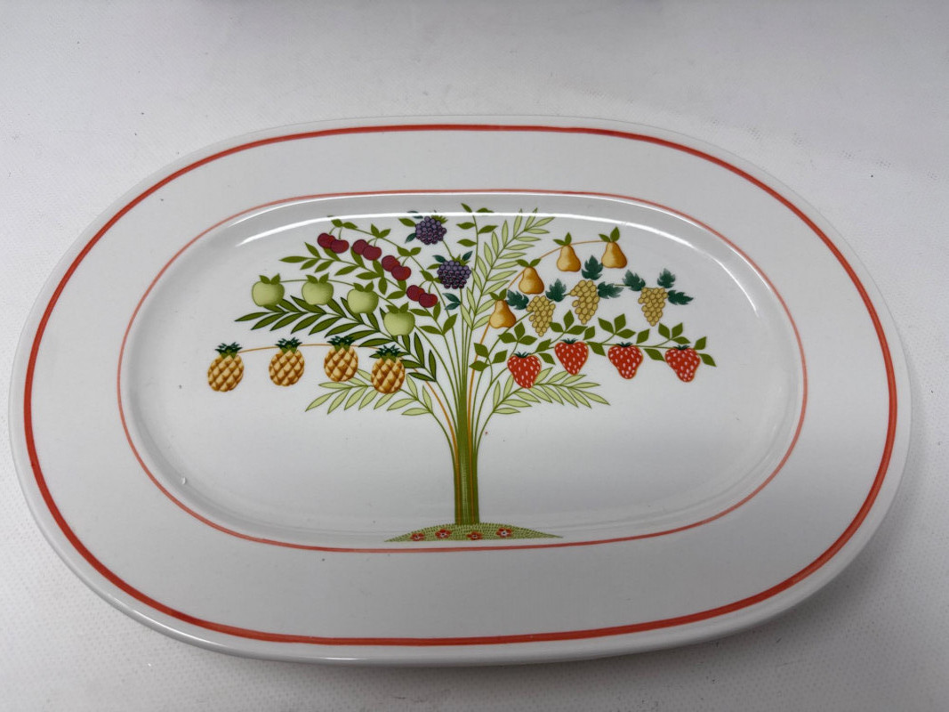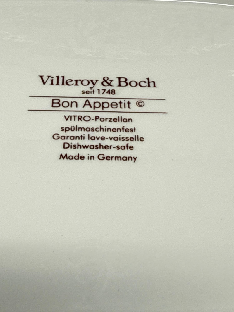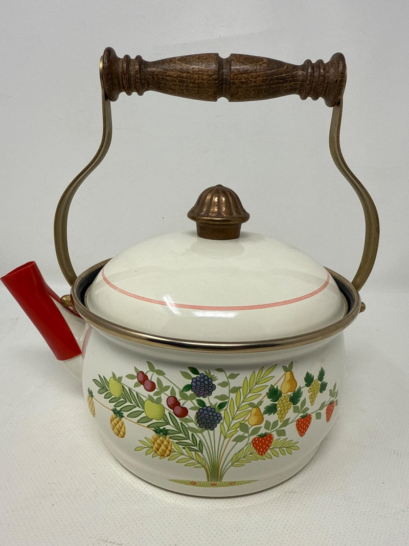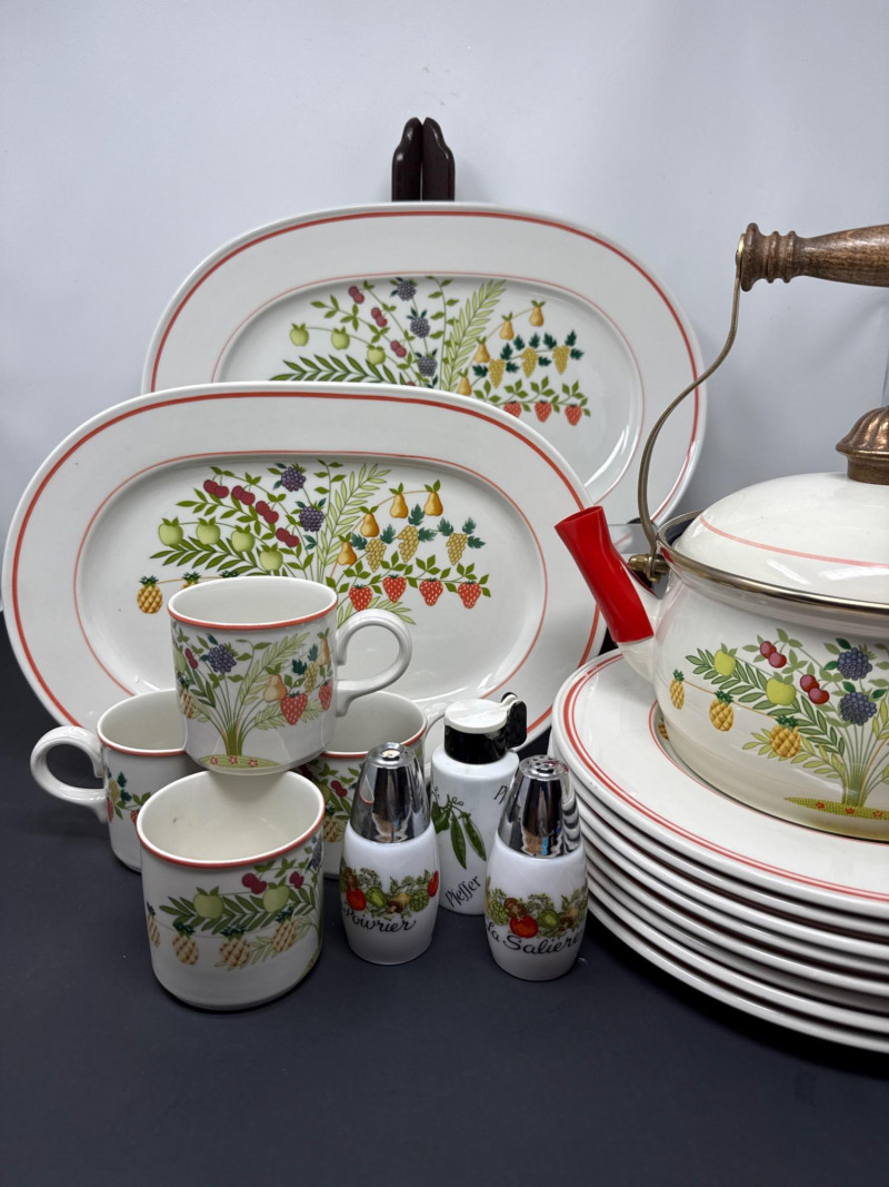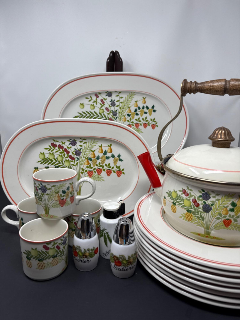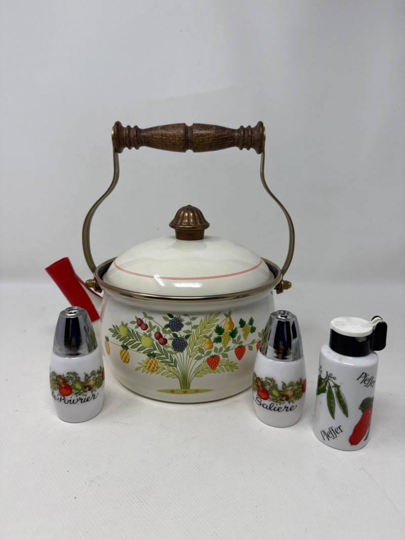 Made in Germany – Dishwasher Safe Large Oval Platter Size: 16" L × 11" W Pattern: Bon Appétit fruit tree motif with pears, berries, pineapples, and apples Material: Vitro-Porzellan, dishwasher-safe Medium Oval Platter Size: 13" L × 9" W Same motif with red rim border Ideal for serving main courses or sides Dinner Plates (8 total) Diameter: 10.5" each Matching orchard fruit tree design Heavy porcelain, durable for daily or entertaining use Cups (4 total) Approx. 3.5" tall × 3.25" wide Coordinated orchard fruit motifs Comfortable handles, dishwasher-safe Style Notes A cohesive grouping from the Bon Appétit collection by Villeroy & Boch Known for bright, orchard-inspired motifs and German craftsmanship Functional and collectible West Germany & Bavaria – Mid-Century Kitchenware Asta Enamel Tea Kettle Maker: Fissler, West Germany Pattern: Asta fruit tree motif Features: Swing wooden handle, curved spout with red enamel cover, domed vented lid, deep blue enameled interior Condition: Light enamel wear at base, interior clean Salt Shaker – “La Salière” Maker: Westinghouse Gemco, USA Material: White milk glass with colorful vegetable motif Chrome screw-top lid Pepper Shaker – “Le Poivrier” Maker: Westinghouse Gemco, USA Matching vegetable motif with chrome screw-top lid Pepper Shaker – “Pepper / Peber / Pfeffer” Maker: Gerold Porzellan, Bavaria, Germany Porcelain with multi-language script Black flip-top lid Style Notes Coordinated vintage kitchenware lot Combines West German enamelware with American and Bavarian shakers Blend of fruit and vegetable motifs for a rustic mid-century kitchen displayA. Villeroy & Boch "Bon Appétit" Vitro-Porzellan Dinnerware Set
