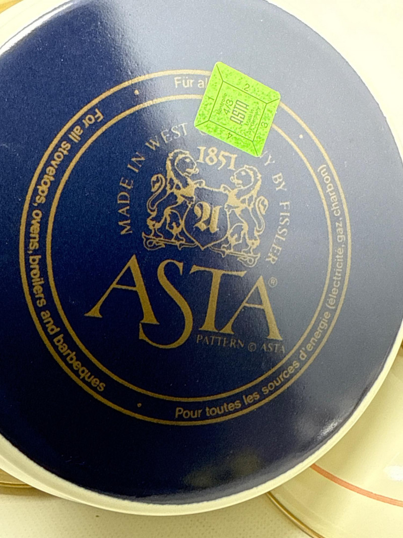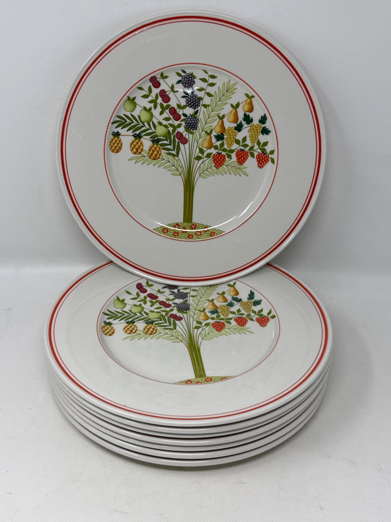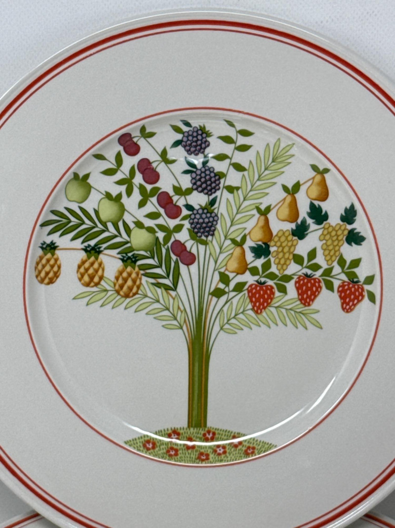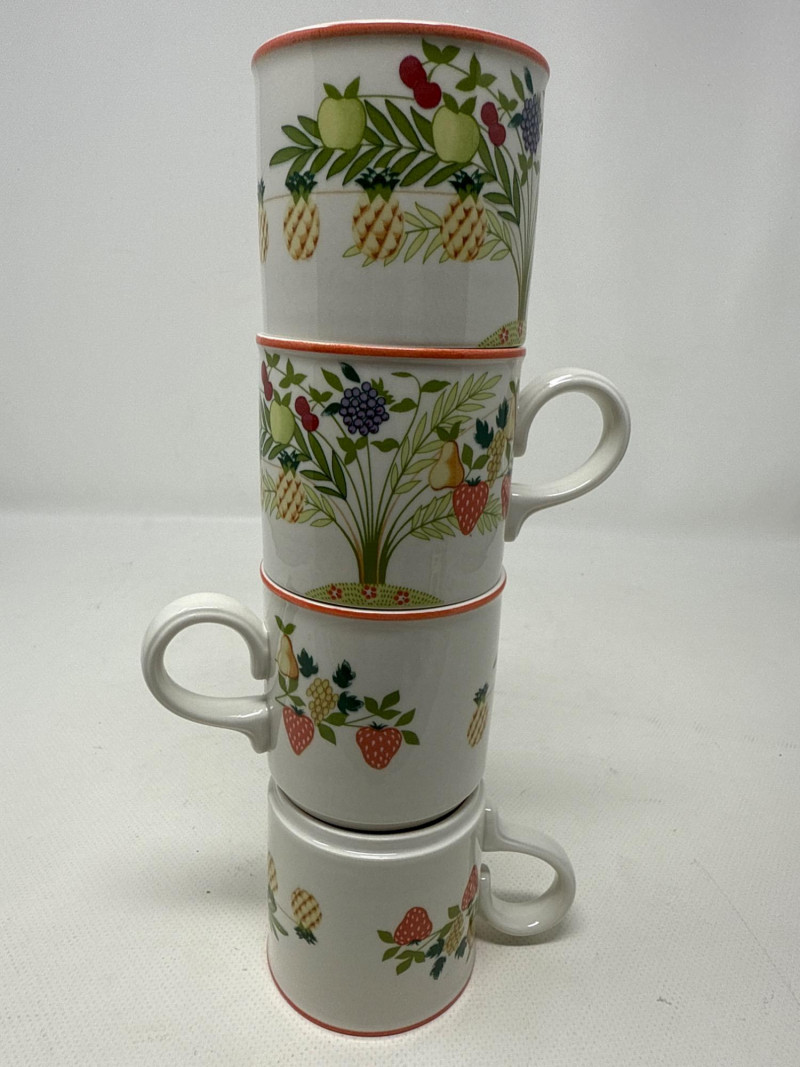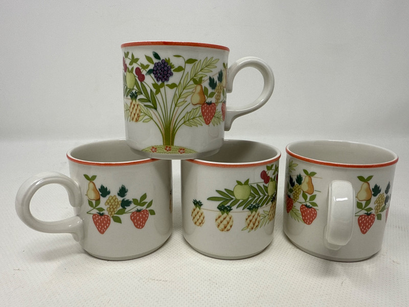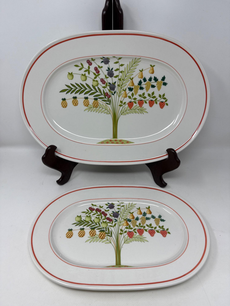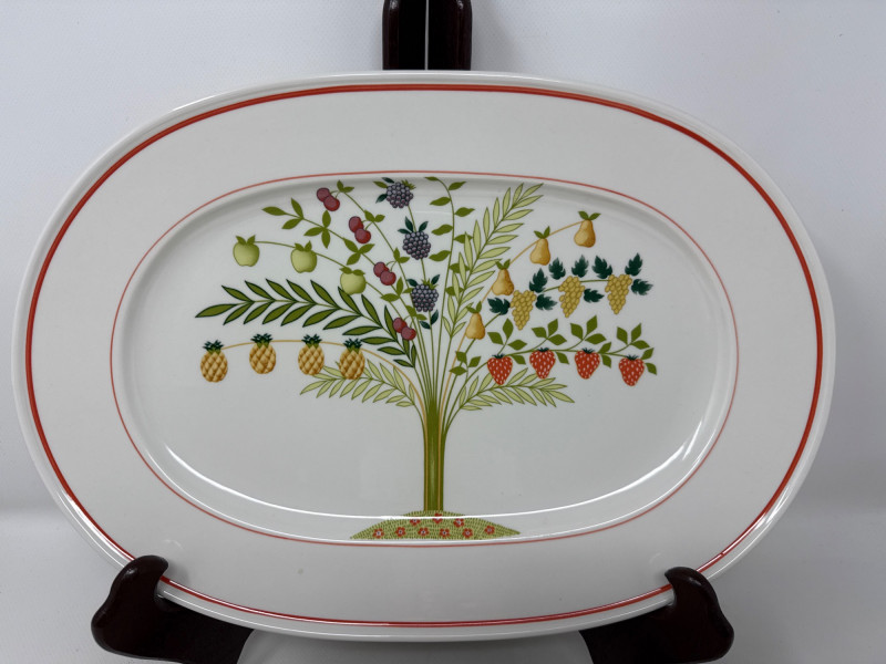 Made in Germany – Dishwasher Safe Large Oval Platter Size: 16" L × 11" W Pattern: Bon Appétit fruit tree motif with pears, berries, pineapples, and apples Material: Vitro-Porzellan, dishwasher-safe Medium Oval Platter Size: 13" L × 9" W Same motif with red rim border Ideal for serving main courses or sides Dinner Plates (8 total) Diameter: 10.5" each Matching orchard fruit tree design Heavy porcelain, durable for daily or entertaining use Cups (4 total) Approx. 3.5" tall × 3.25" wide Coordinated orchard fruit motifs Comfortable handles, dishwasher-safe Style Notes A cohesive grouping from the Bon Appétit collection by Villeroy & Boch Known for bright, orchard-inspired motifs and German craftsmanship Functional and collectible West Germany & Bavaria – Mid-Century Kitchenware Asta Enamel Tea Kettle Maker: Fissler, West Germany Pattern: Asta fruit tree motif Features: Swing wooden handle, curved spout with red enamel cover, domed vented lid, deep blue enameled interior Condition: Light enamel wear at base, interior clean Salt Shaker – “La Salière” Maker: Westinghouse Gemco, USA Material: White milk glass with colorful vegetable motif Chrome screw-top lid Pepper Shaker – “Le Poivrier” Maker: Westinghouse Gemco, USA Matching vegetable motif with chrome screw-top lid Pepper Shaker – “Pepper / Peber / Pfeffer” Maker: Gerold Porzellan, Bavaria, Germany Porcelain with multi-language script Black flip-top lid Style Notes Coordinated vintage kitchenware lot Combines West German enamelware with American and Bavarian shakers Blend of fruit and vegetable motifs for a rustic mid-century kitchen displayA. Villeroy & Boch "Bon Appétit" Vitro-Porzellan Dinnerware Set