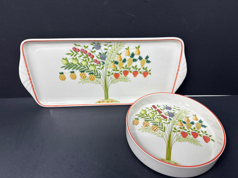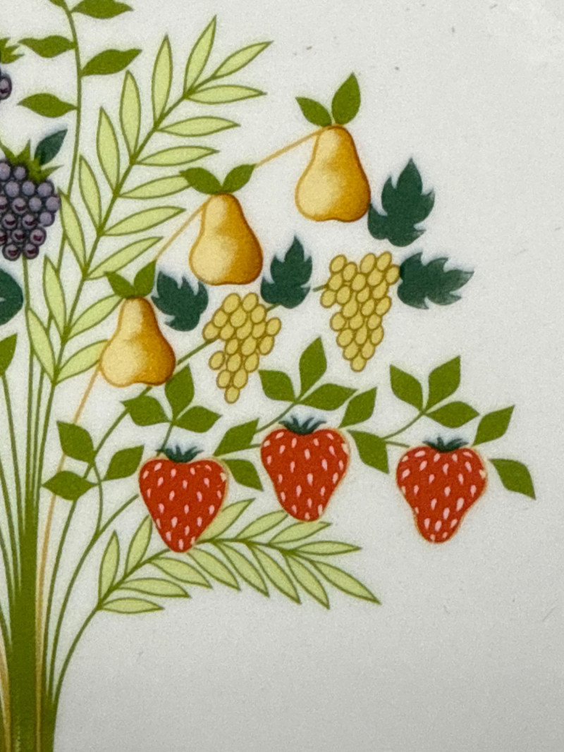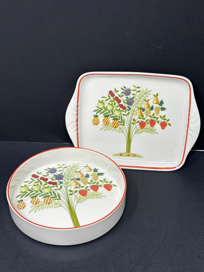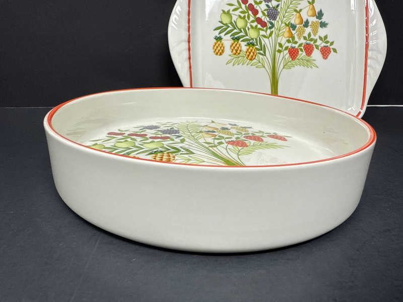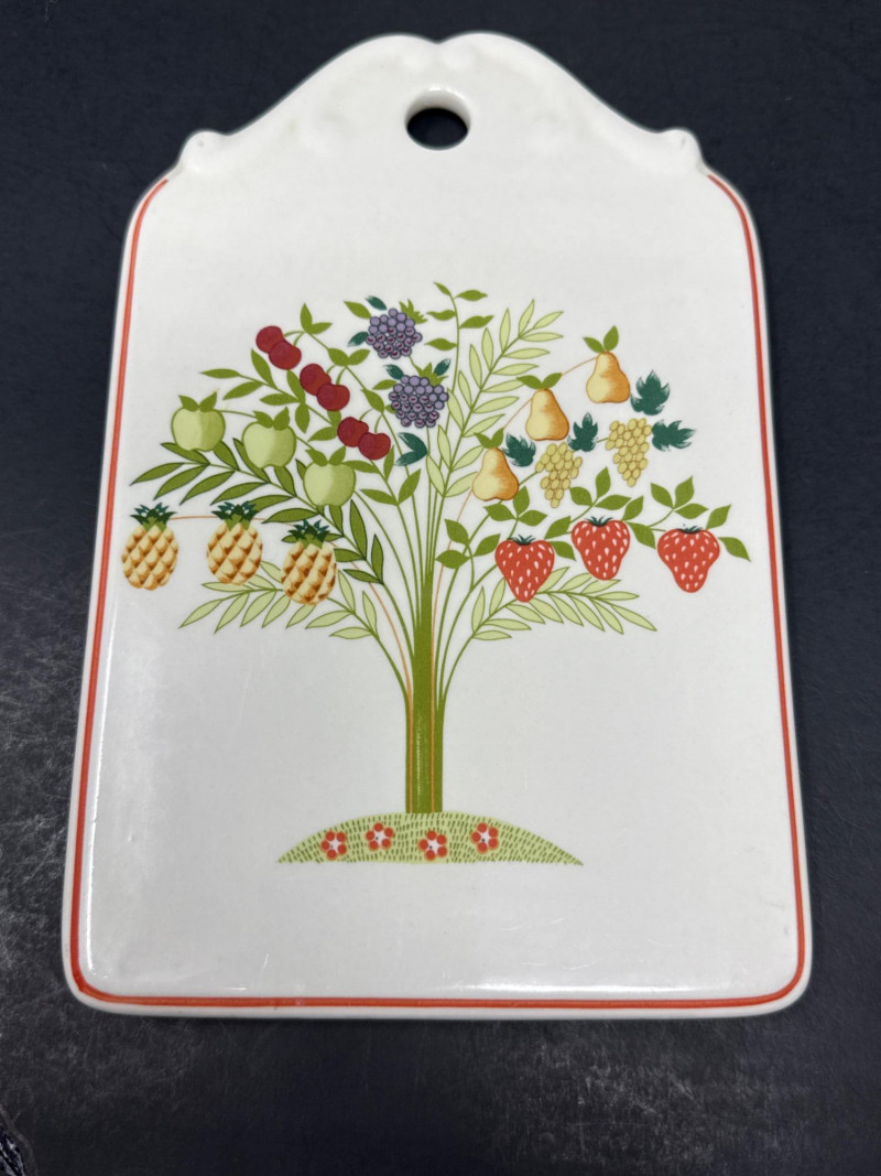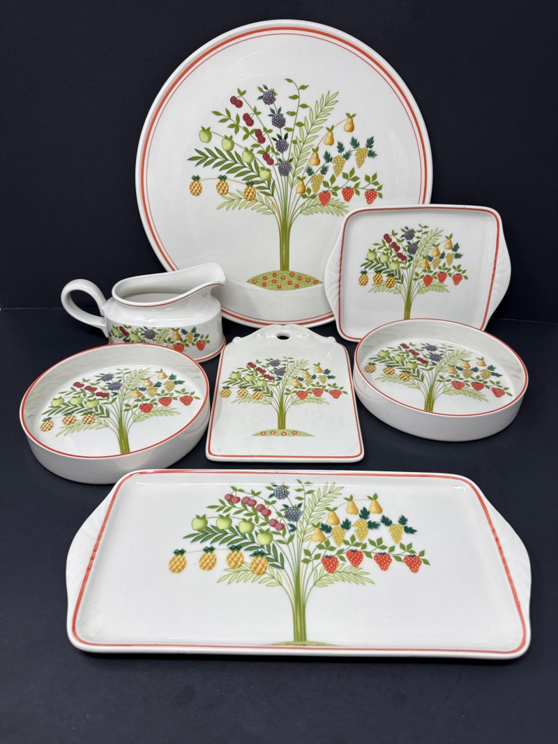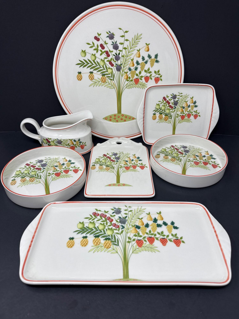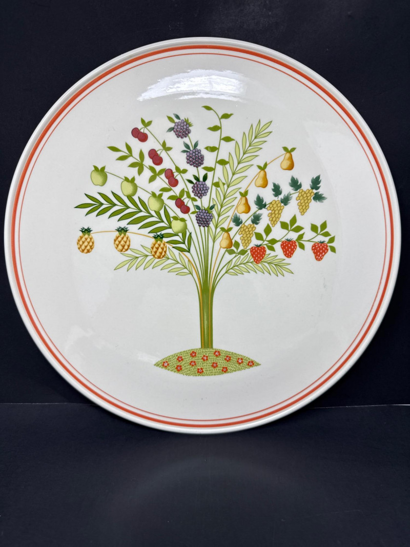 Add a touch of European charm to your table with this vibrant and collectible seven-piece serving set from Villeroy & Boch’s discontinued “Bon Appétit / Appetito” collection. Crafted in Germany from durable Vitro-Porzellan, each piece features a cheerful fruit tree motif—strawberries, pears, grapes, pineapples, cherries, and apples—framed by a warm red-orange rim.