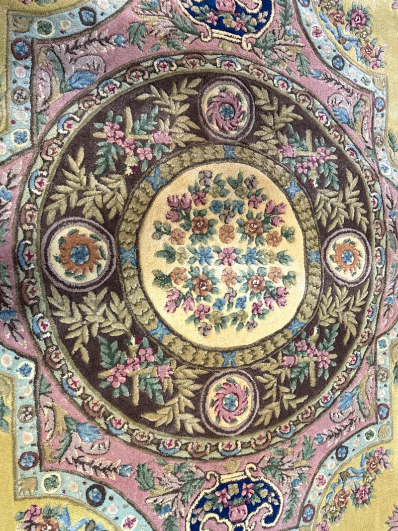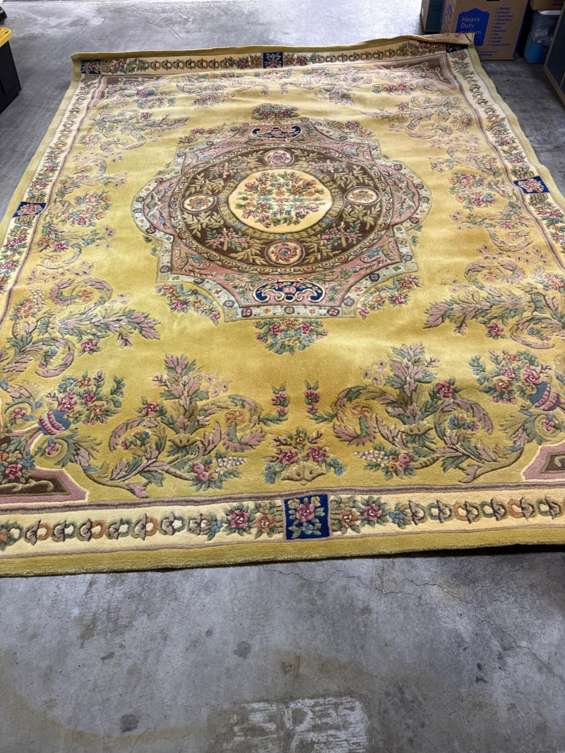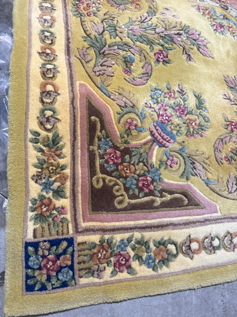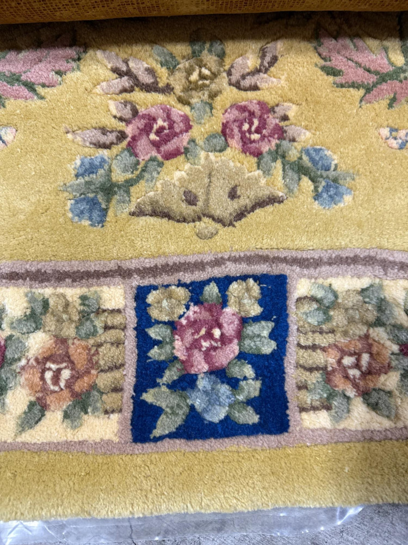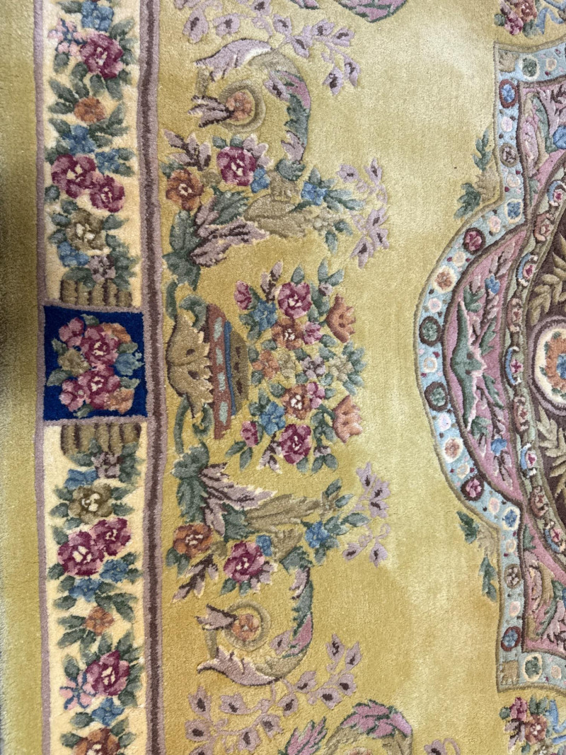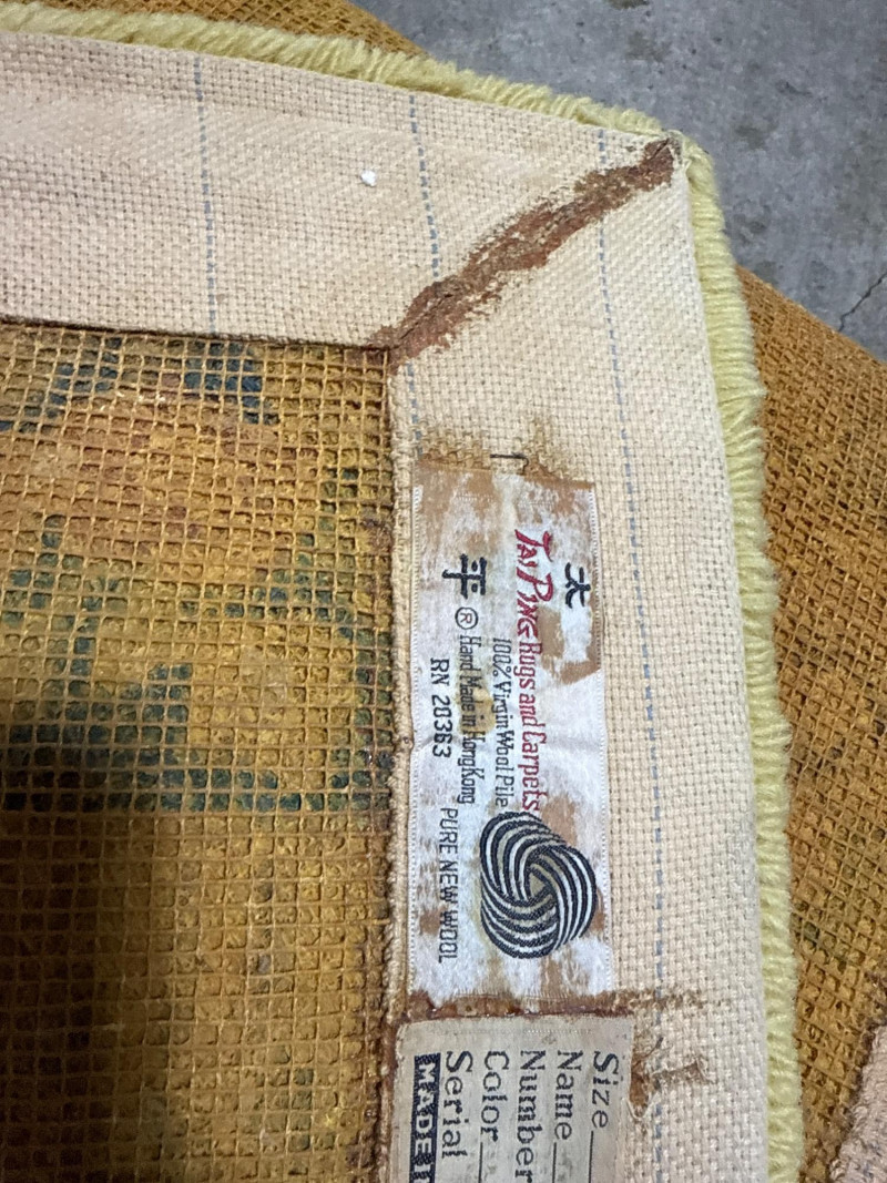 A vibrant Tai Ping wool rug in the “Dielmoth” pattern, featuring a central medallion and ornate floral borders in warm yellow, pink, blue, and green tones. This hand-tufted piece showcases the brand’s signature craftsmanship and colorwork—ideal for upscale interiors, gallery staging, or luxury resale. Size: 9' × 12' Maker: Tai Ping Pattern: “Dielmoth” Style: Traditional with central circular medallion, floral motifs, and decorative borders Colors: Golden yellow base with accents of pink, green, blue, and beige Material: Wool (hand-tufted) Rug was fully wrapped in plastic prior to photography Appears professionally cleaned; no visible stains or damage Edges and pile show minimal wear consistent with careful storage Dimensions