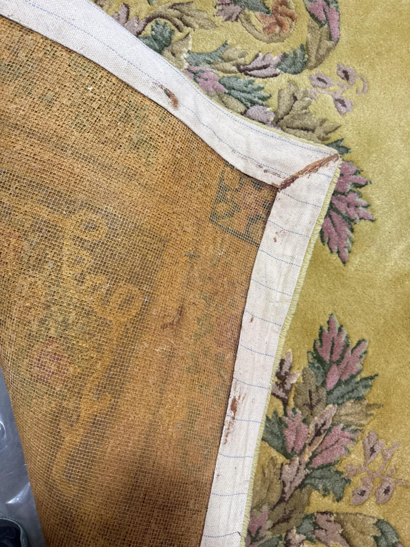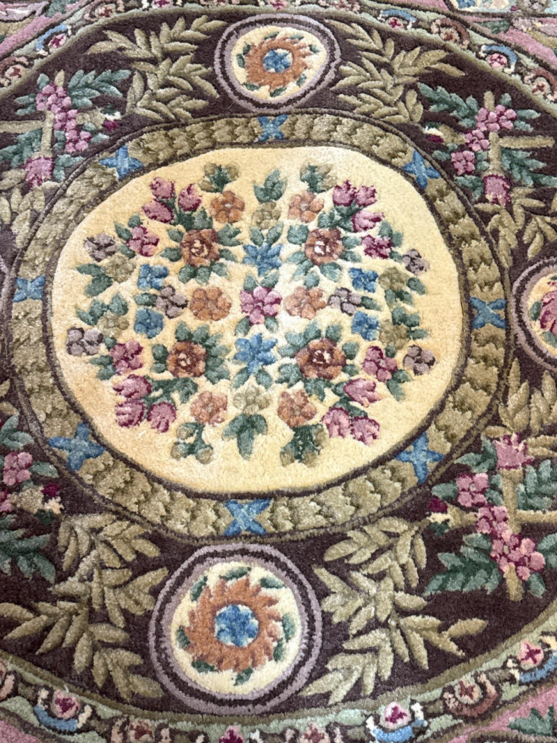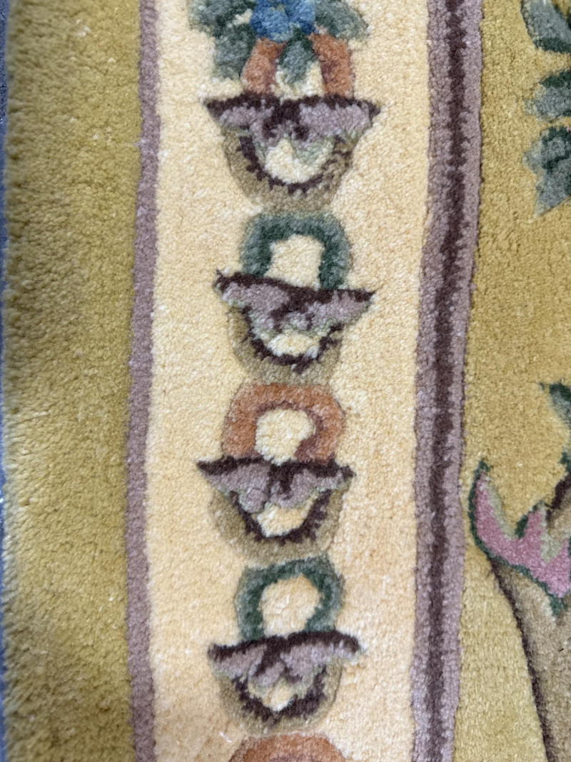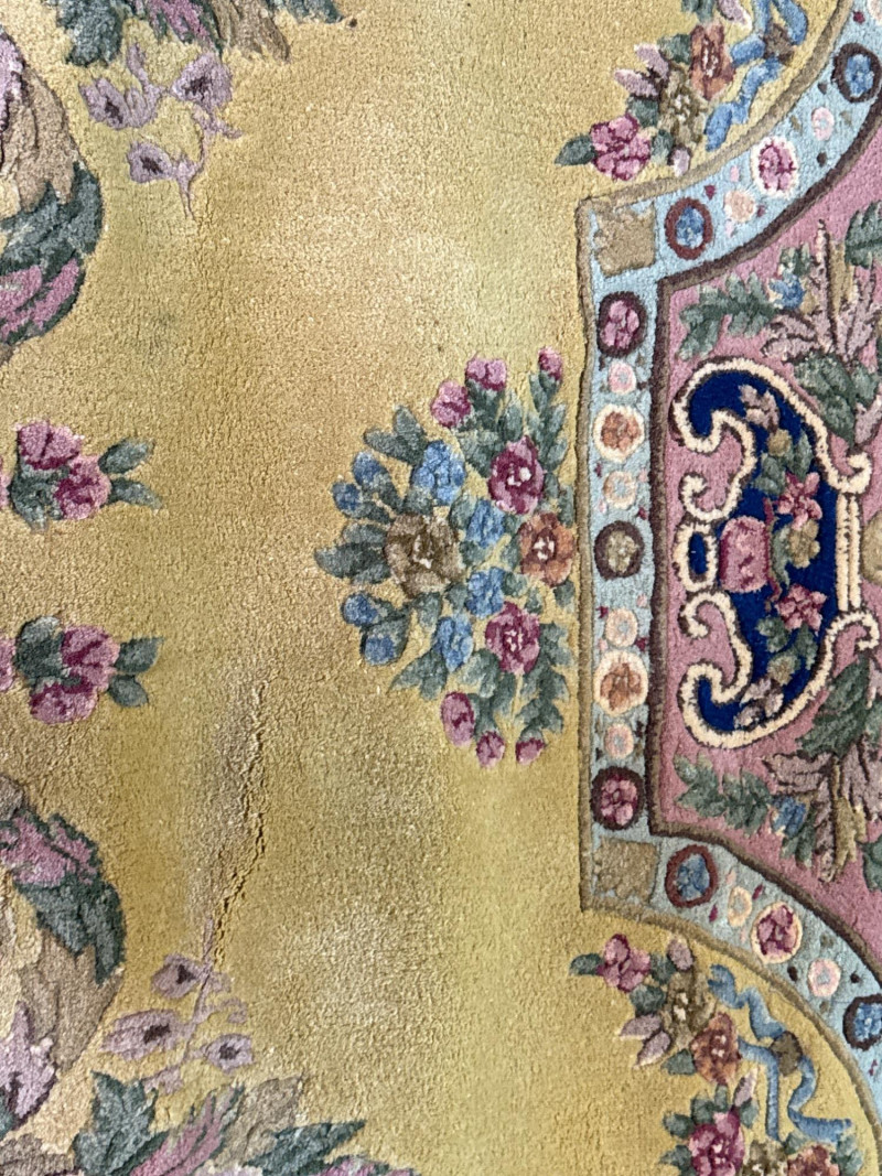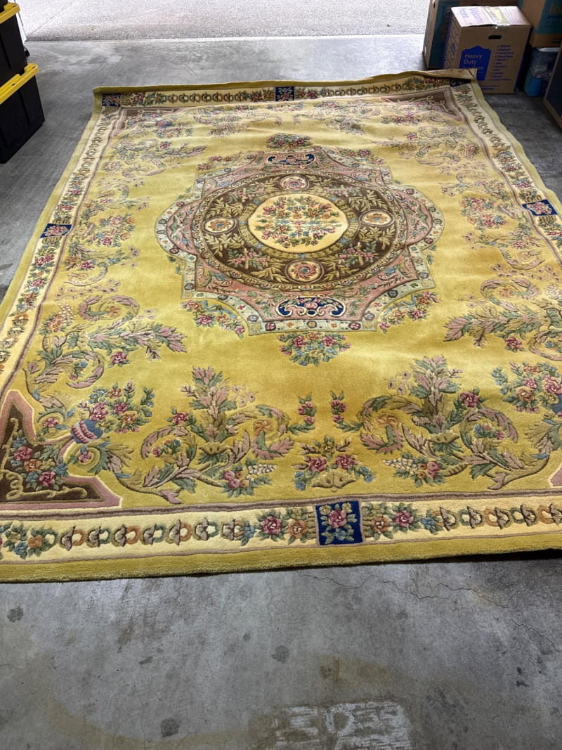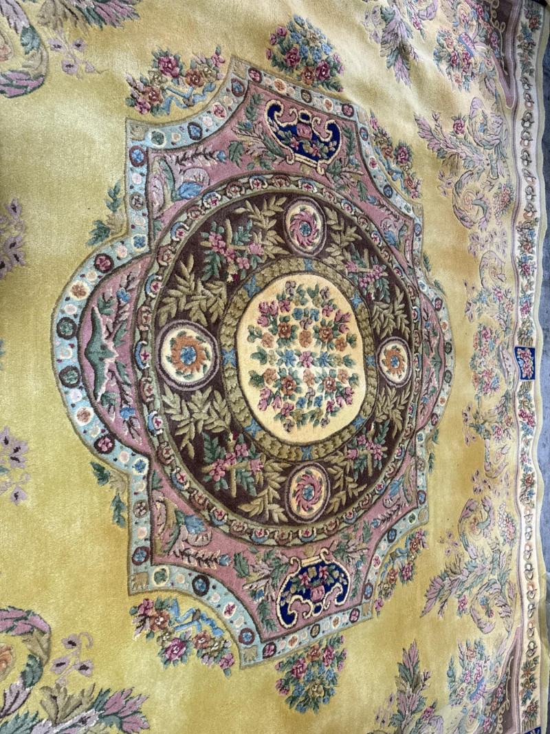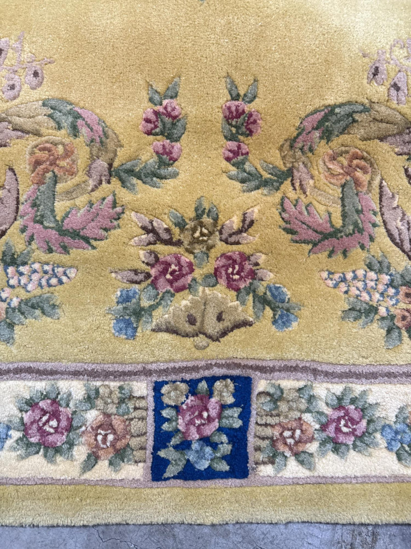 A vibrant Tai Ping wool rug in the “Dielmoth” pattern, featuring a central medallion and ornate floral borders in warm yellow, pink, blue, and green tones. This hand-tufted piece showcases the brand’s signature craftsmanship and colorwork—ideal for upscale interiors, gallery staging, or luxury resale. Size: 9' × 12' Maker: Tai Ping Pattern: “Dielmoth” Style: Traditional with central circular medallion, floral motifs, and decorative borders Colors: Golden yellow base with accents of pink, green, blue, and beige Material: Wool (hand-tufted) Rug was fully wrapped in plastic prior to photography Appears professionally cleaned; no visible stains or damage Edges and pile show minimal wear consistent with careful storage Dimensions