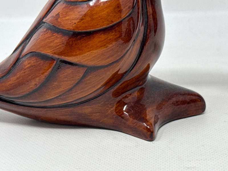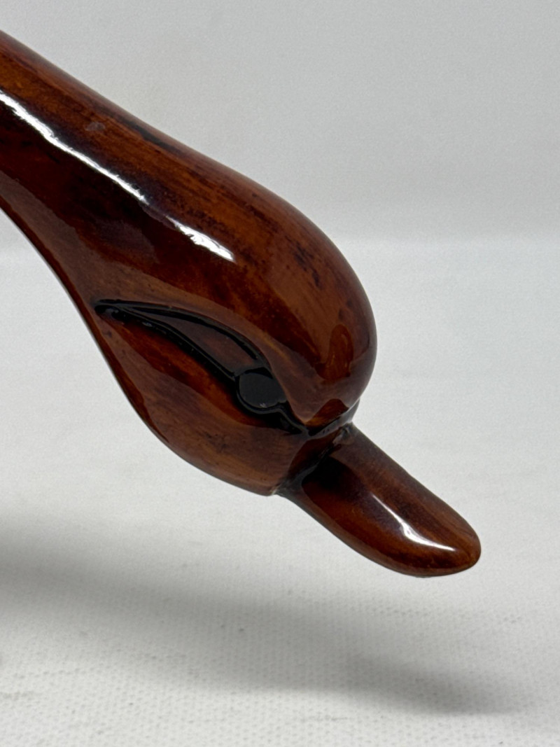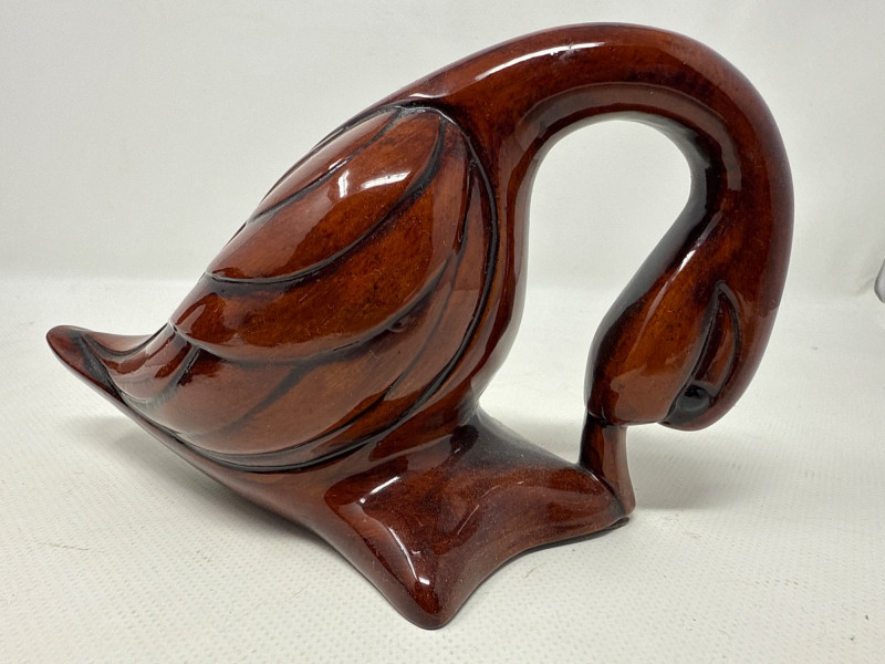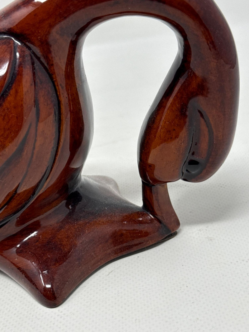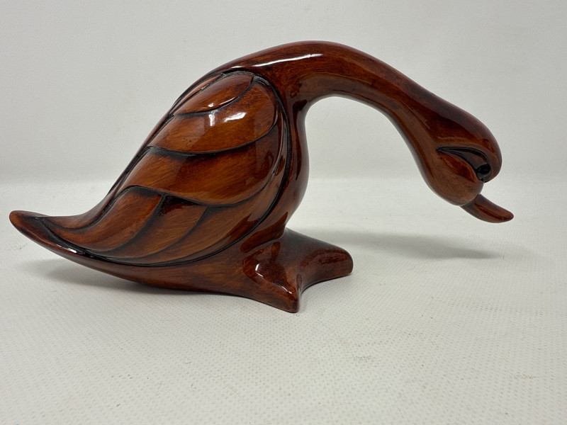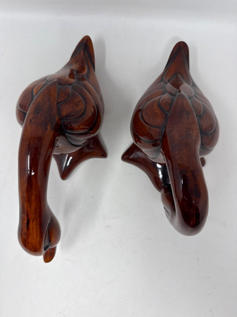 Pair of Signed Hand-Carved Ironwood Swan Figures Set of two solid ironwood swan sculptures, each hand-carved with smoothly polished surfaces and incised feather details. The figures are posed in complementary positions—one with its head lowered and the other with its head tucked. Both bases bear handwritten signatures/marks. Details: Form: Pair of stylized swans in complementary poses Material: Hand-carved ironwood (dense hardwood) Decoration: Incised feather lines with dark accents; polished finish Markings: Signed/numbered on underside of bases (see photos) Collecting Note:
