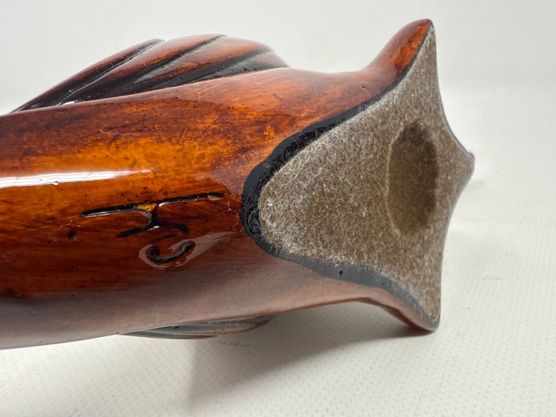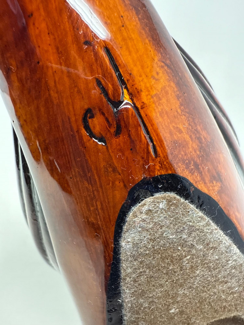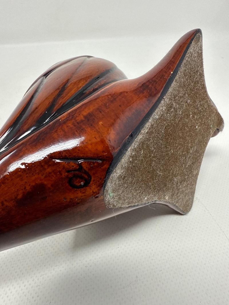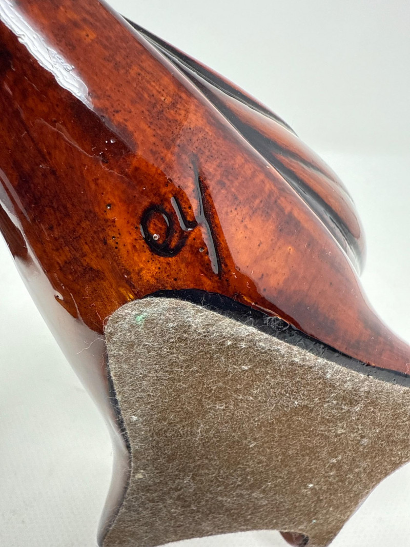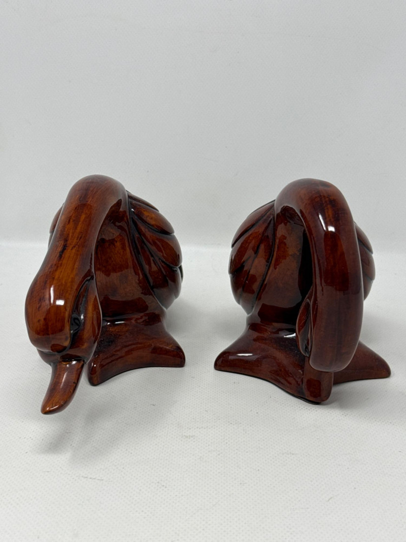 Pair of Signed Hand-Carved Ironwood Swan Figures Set of two solid ironwood swan sculptures, each hand-carved with smoothly polished surfaces and incised feather details. The figures are posed in complementary positions—one with its head lowered and the other with its head tucked. Both bases bear handwritten signatures/marks. Details: Form: Pair of stylized swans in complementary poses Material: Hand-carved ironwood (dense hardwood) Decoration: Incised feather lines with dark accents; polished finish Markings: Signed/numbered on underside of bases (see photos) Collecting Note: