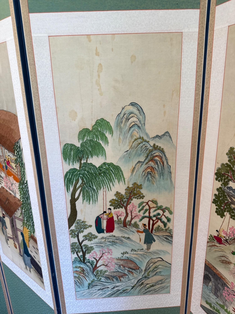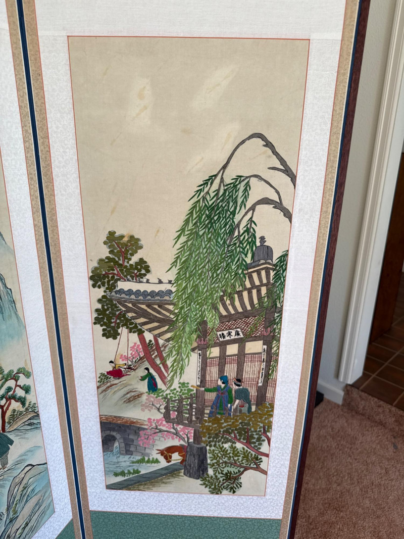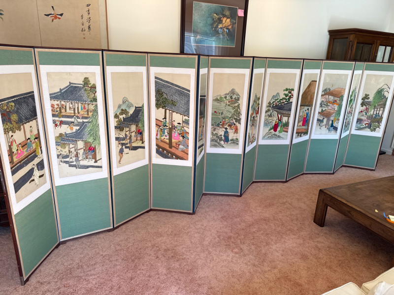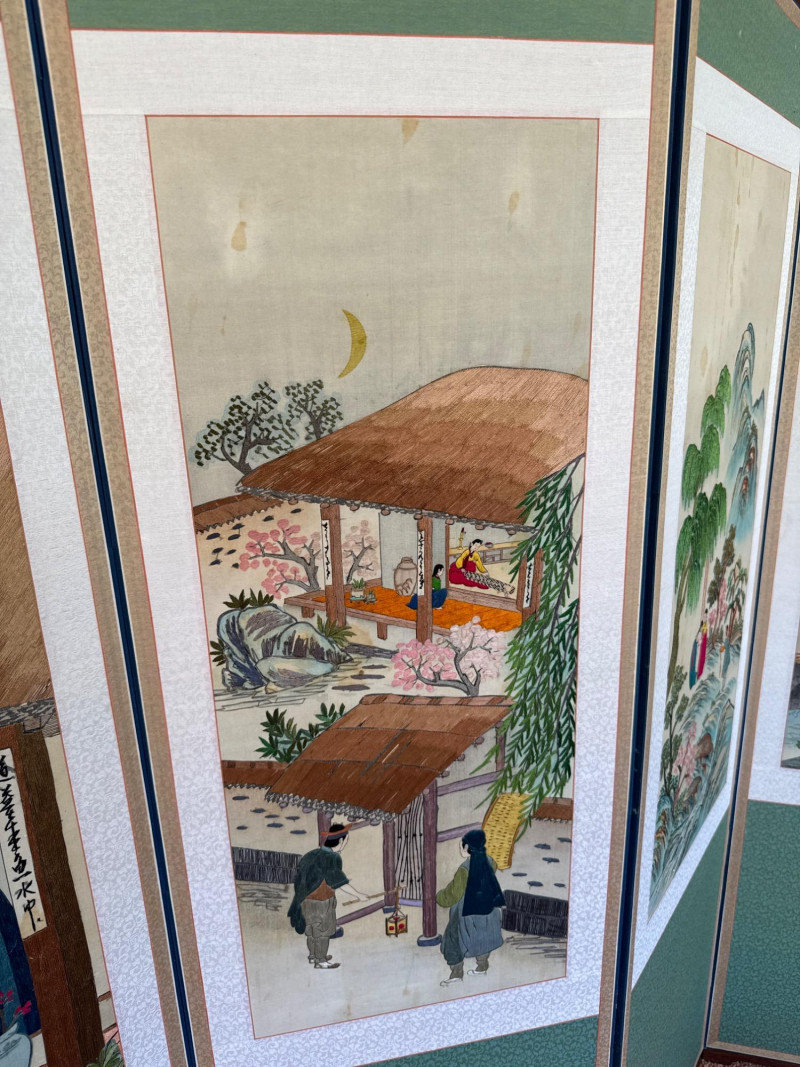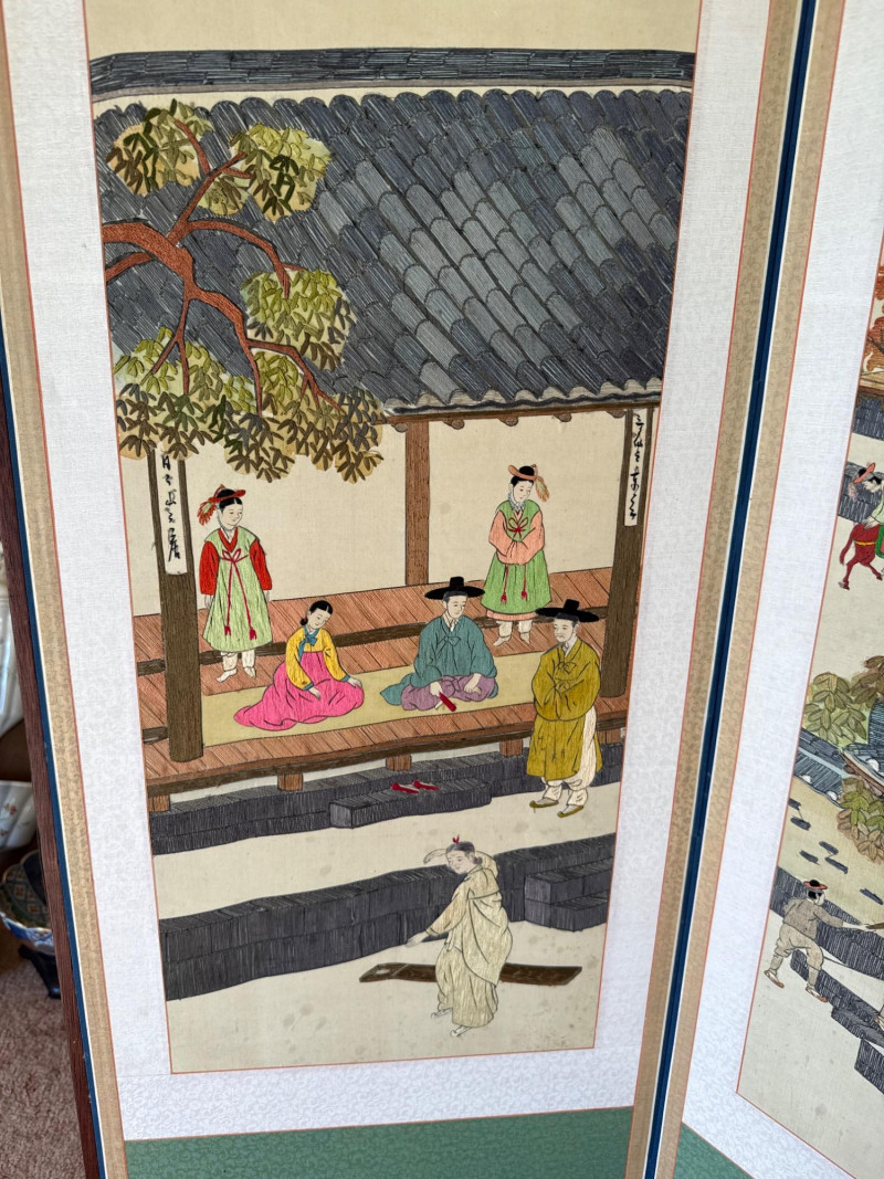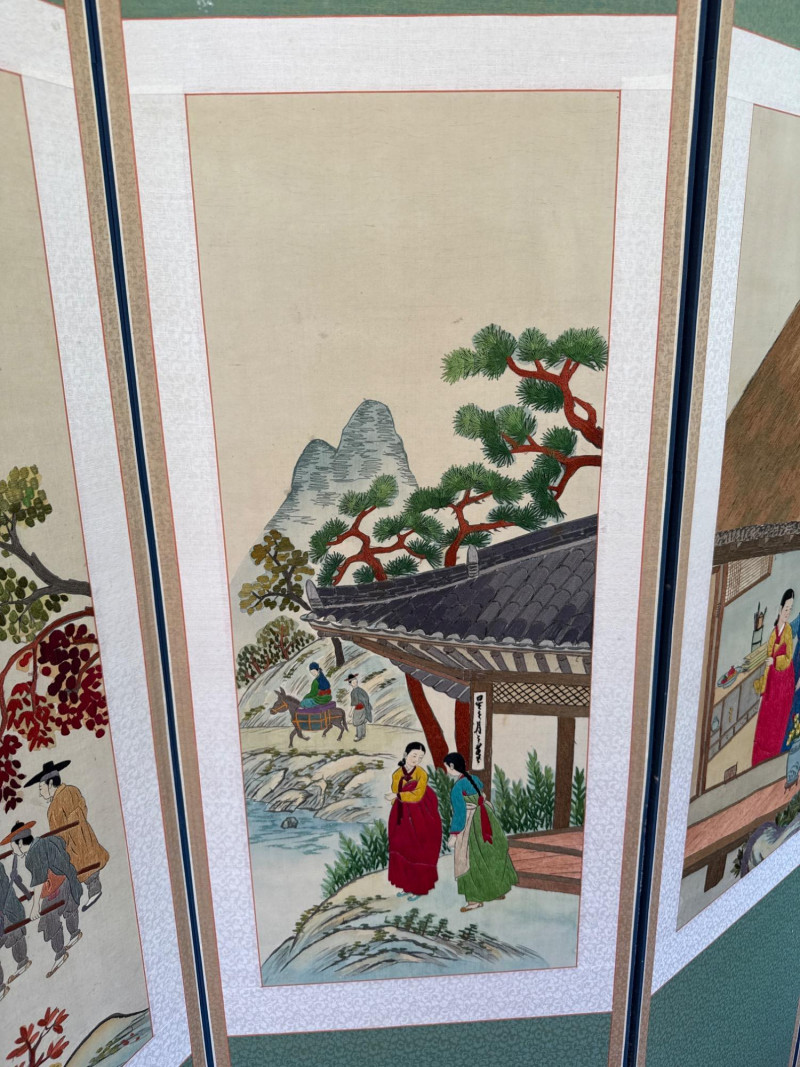 Korean Byeongpung 12-Panel Embroidered Folding Screen A monumental 12-panel Korean folding screen (byeongpung, 병풍), intricately embroidered with colorful silk threads to depict scenes of village and court life. Each panel features figures in traditional attire engaged in daily activities—gatherings, music, farming, and family life—set within landscapes of tiled-roof architecture, thatched cottages, and mountainous scenery. Framed with patterned silk brocade borders and mounted in a folding wood frame with side handles for transport, this screen is both a decorative and cultural centerpiece. Medium: Silk embroidery on fabric with brocade borders Panels: 12 (folding construction) Dimensions: 210 in L × 60.5 in H (overall when extended) Condition: Embroidery remains vibrant and detailed; mold present on outside edges but not affecting embroidered surfaces Function: Folding screens were essential in Korean interiors, used for privacy, decoration, and status display Artistic Tradition: Embroidery reflects pungsokhwa (풍속화), genre painting from the Joseon dynasty that celebrated everyday life Period: Likely created during the mid-20th century (1950s–1970s), a time of revival in traditional Korean arts for domestic and export markets Symbolism: Themes of prosperity, harmony, and cultural refinement make it ideal for formal settings Rarity: Embroidered screens of this scale are significantly less common than painted ones Craftsmanship: Exceptional silk embroidery showcases technical artistry and cultural depth Value: Appeals to collectors of Korean art, Asian textiles, and historical furnishings Preservation: With professional re-backing, it can be stabilized for long-term display and enjoymentHistorical & Cultural Context