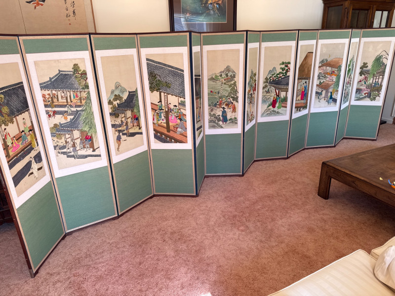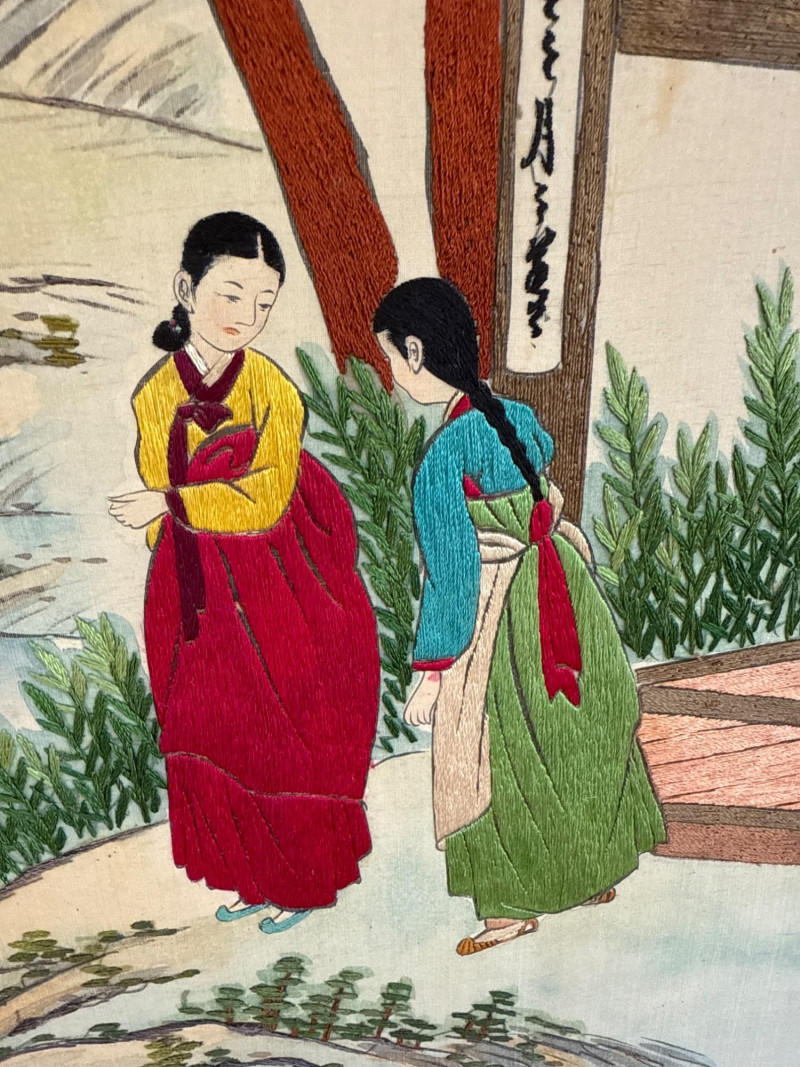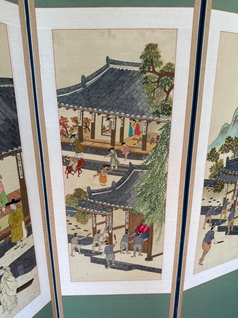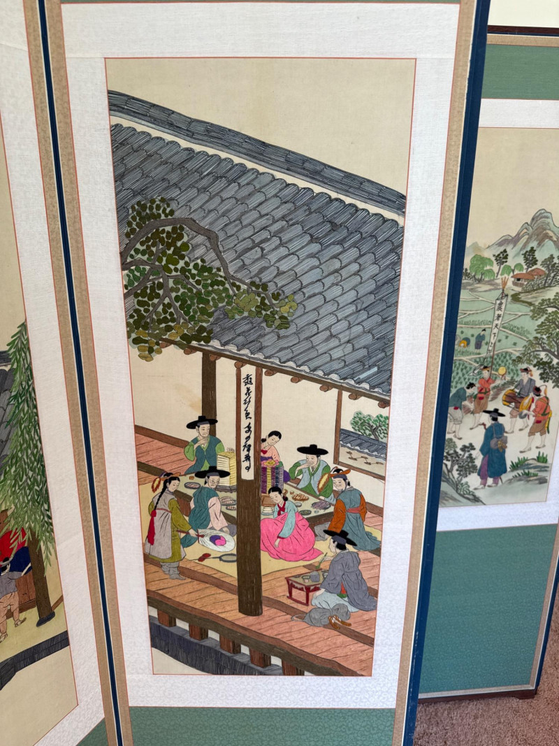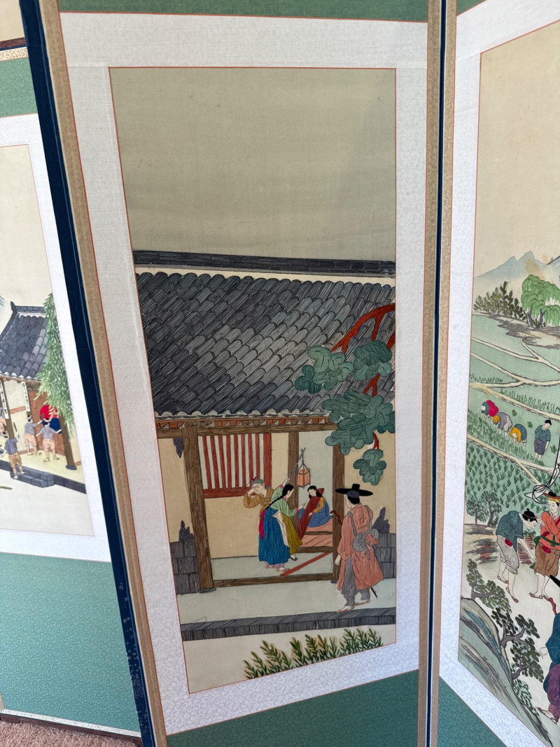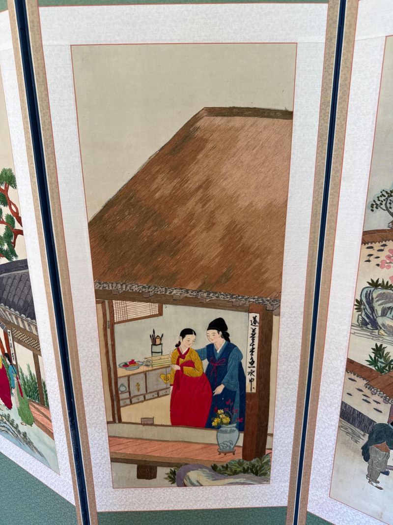 Korean Byeongpung 12-Panel Embroidered Folding Screen A monumental 12-panel Korean folding screen (byeongpung, 병풍), intricately embroidered with colorful silk threads to depict scenes of village and court life. Each panel features figures in traditional attire engaged in daily activities—gatherings, music, farming, and family life—set within landscapes of tiled-roof architecture, thatched cottages, and mountainous scenery. Framed with patterned silk brocade borders and mounted in a folding wood frame with side handles for transport, this screen is both a decorative and cultural centerpiece. Medium: Silk embroidery on fabric with brocade borders Panels: 12 (folding construction) Dimensions: 210 in L × 60.5 in H (overall when extended) Condition: Embroidery remains vibrant and detailed; mold present on outside edges but not affecting embroidered surfaces Function: Folding screens were essential in Korean interiors, used for privacy, decoration, and status display Artistic Tradition: Embroidery reflects pungsokhwa (풍속화), genre painting from the Joseon dynasty that celebrated everyday life Period: Likely created during the mid-20th century (1950s–1970s), a time of revival in traditional Korean arts for domestic and export markets Symbolism: Themes of prosperity, harmony, and cultural refinement make it ideal for formal settings Rarity: Embroidered screens of this scale are significantly less common than painted ones Craftsmanship: Exceptional silk embroidery showcases technical artistry and cultural depth Value: Appeals to collectors of Korean art, Asian textiles, and historical furnishings Preservation: With professional re-backing, it can be stabilized for long-term display and enjoymentHistorical & Cultural Context