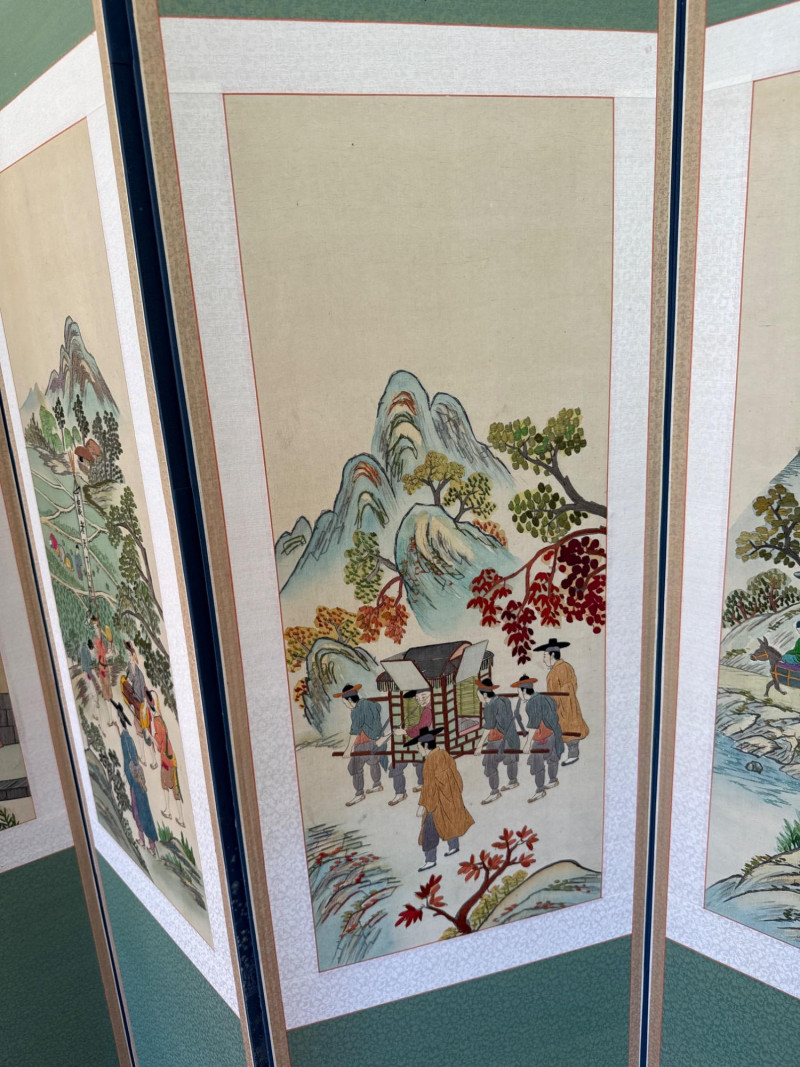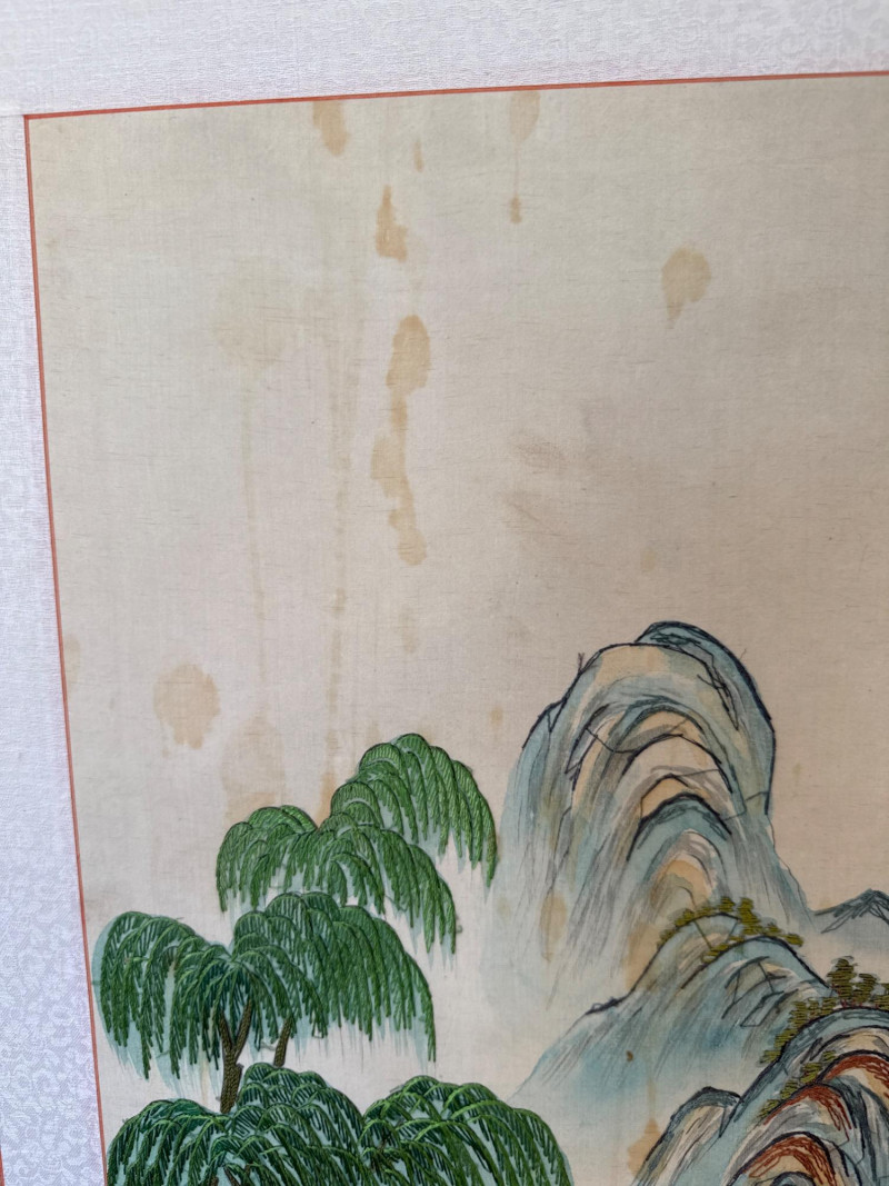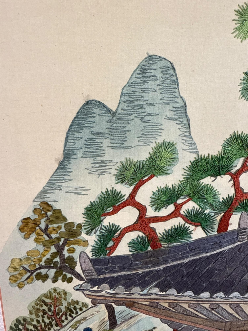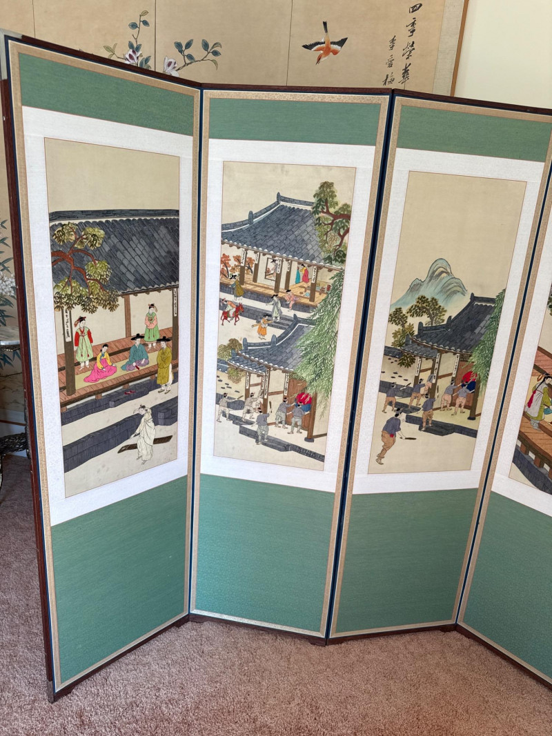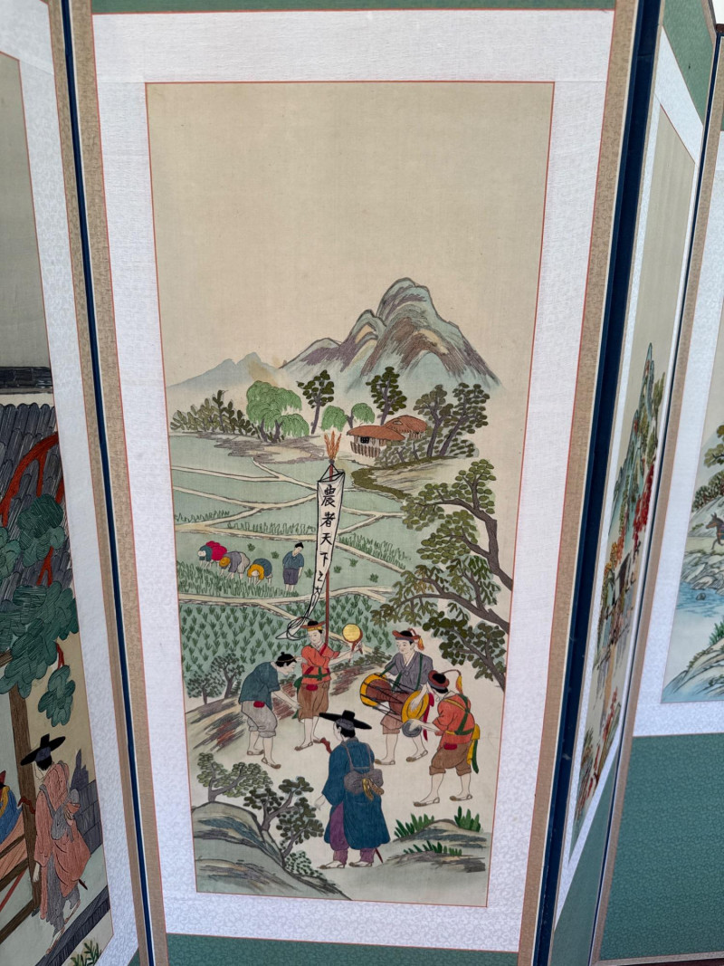 Korean Byeongpung 12-Panel Embroidered Folding Screen A monumental 12-panel Korean folding screen (byeongpung, 병풍), intricately embroidered with colorful silk threads to depict scenes of village and court life. Each panel features figures in traditional attire engaged in daily activities—gatherings, music, farming, and family life—set within landscapes of tiled-roof architecture, thatched cottages, and mountainous scenery. Framed with patterned silk brocade borders and mounted in a folding wood frame with side handles for transport, this screen is both a decorative and cultural centerpiece. Medium: Silk embroidery on fabric with brocade borders Panels: 12 (folding construction) Dimensions: 210 in L × 60.5 in H (overall when extended) Condition: Embroidery remains vibrant and detailed; mold present on outside edges but not affecting embroidered surfaces Function: Folding screens were essential in Korean interiors, used for privacy, decoration, and status display Artistic Tradition: Embroidery reflects pungsokhwa (풍속화), genre painting from the Joseon dynasty that celebrated everyday life Period: Likely created during the mid-20th century (1950s–1970s), a time of revival in traditional Korean arts for domestic and export markets Symbolism: Themes of prosperity, harmony, and cultural refinement make it ideal for formal settings Rarity: Embroidered screens of this scale are significantly less common than painted ones Craftsmanship: Exceptional silk embroidery showcases technical artistry and cultural depth Value: Appeals to collectors of Korean art, Asian textiles, and historical furnishings Preservation: With professional re-backing, it can be stabilized for long-term display and enjoymentHistorical & Cultural Context