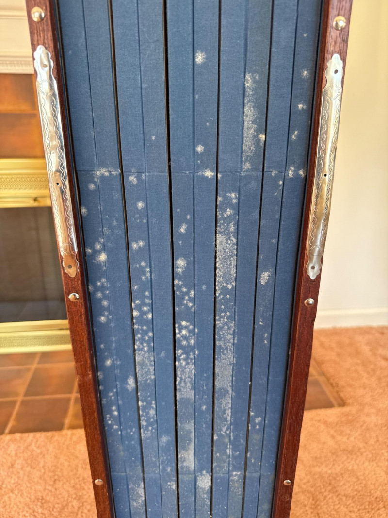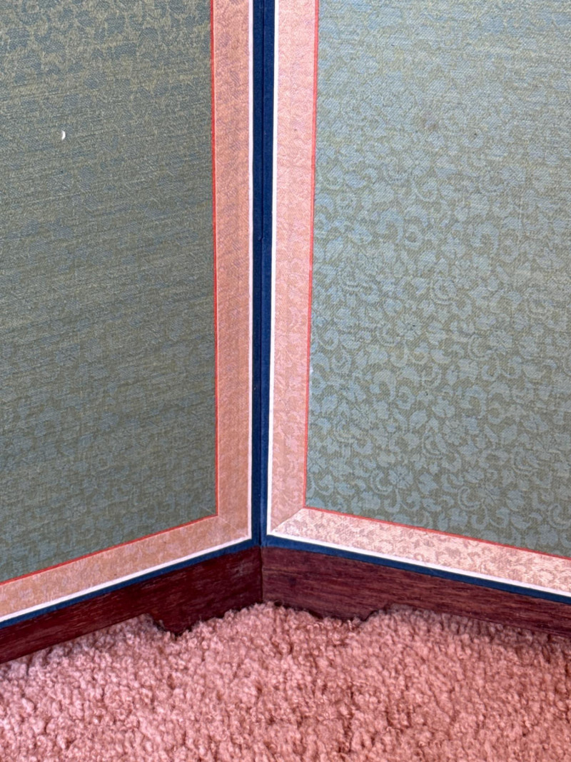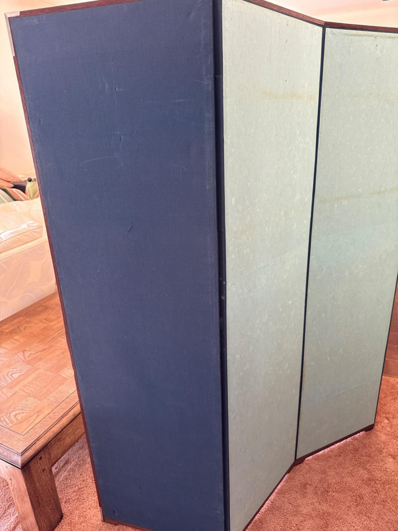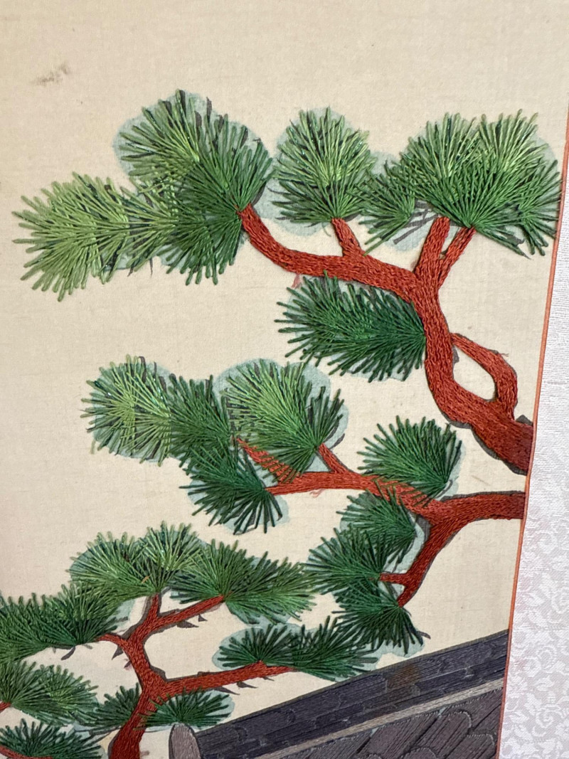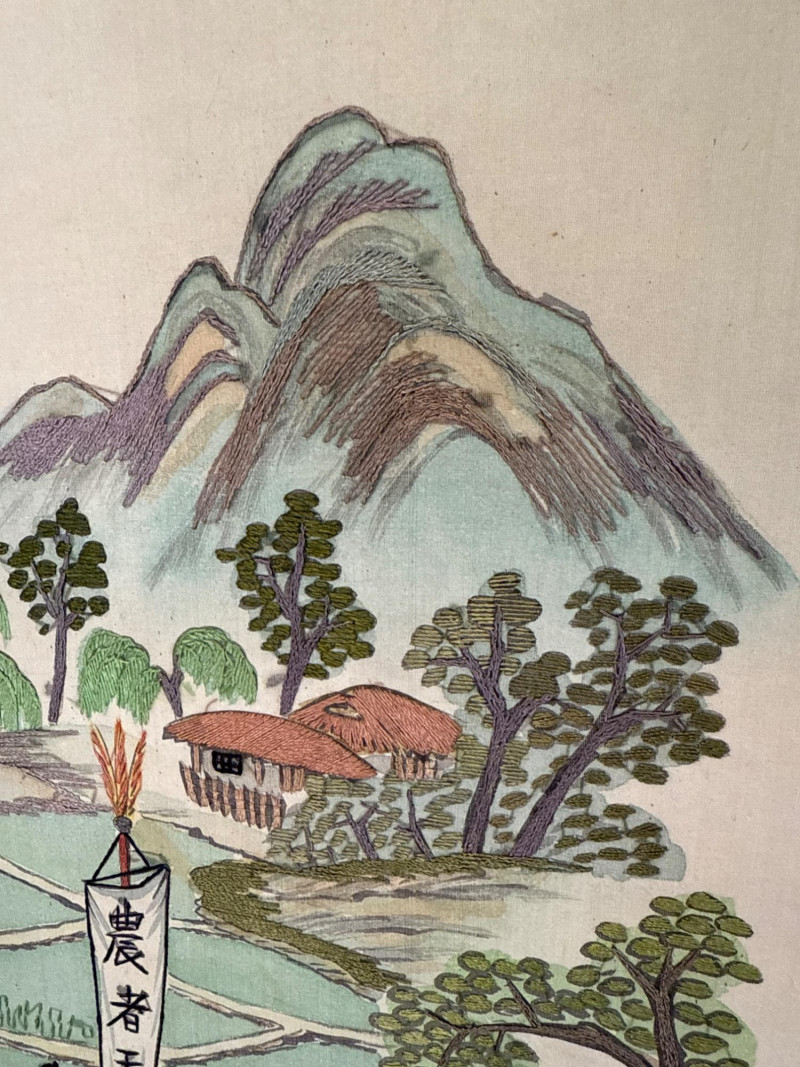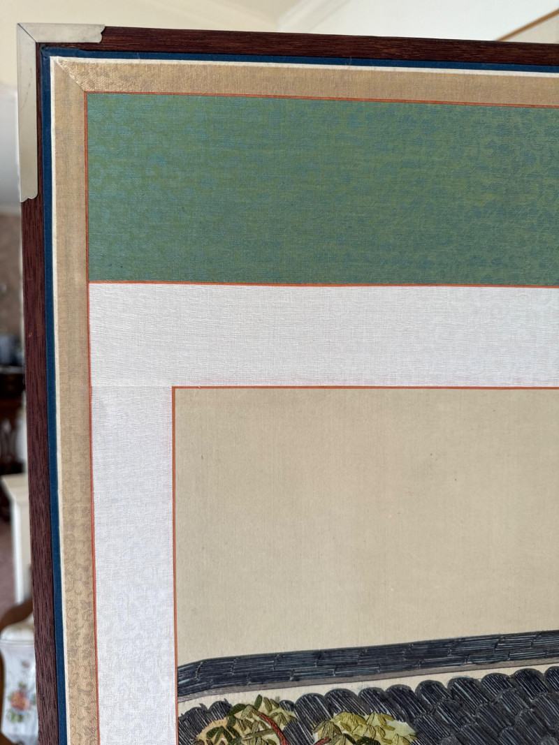 Korean Byeongpung 12-Panel Embroidered Folding Screen A monumental 12-panel Korean folding screen (byeongpung, 병풍), intricately embroidered with colorful silk threads to depict scenes of village and court life. Each panel features figures in traditional attire engaged in daily activities—gatherings, music, farming, and family life—set within landscapes of tiled-roof architecture, thatched cottages, and mountainous scenery. Framed with patterned silk brocade borders and mounted in a folding wood frame with side handles for transport, this screen is both a decorative and cultural centerpiece. Medium: Silk embroidery on fabric with brocade borders Panels: 12 (folding construction) Dimensions: 210 in L × 60.5 in H (overall when extended) Condition: Embroidery remains vibrant and detailed; mold present on outside edges but not affecting embroidered surfaces Function: Folding screens were essential in Korean interiors, used for privacy, decoration, and status display Artistic Tradition: Embroidery reflects pungsokhwa (풍속화), genre painting from the Joseon dynasty that celebrated everyday life Period: Likely created during the mid-20th century (1950s–1970s), a time of revival in traditional Korean arts for domestic and export markets Symbolism: Themes of prosperity, harmony, and cultural refinement make it ideal for formal settings Rarity: Embroidered screens of this scale are significantly less common than painted ones Craftsmanship: Exceptional silk embroidery showcases technical artistry and cultural depth Value: Appeals to collectors of Korean art, Asian textiles, and historical furnishings Preservation: With professional re-backing, it can be stabilized for long-term display and enjoymentHistorical & Cultural Context