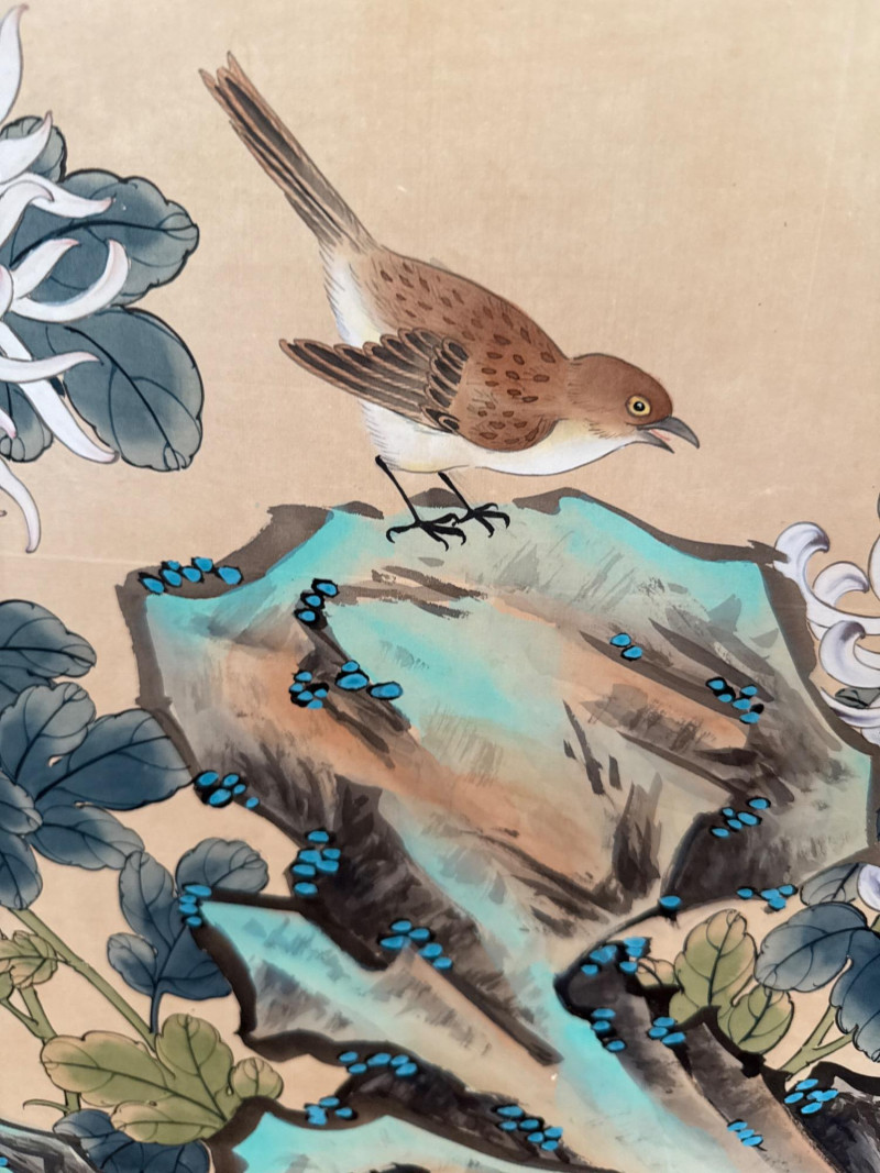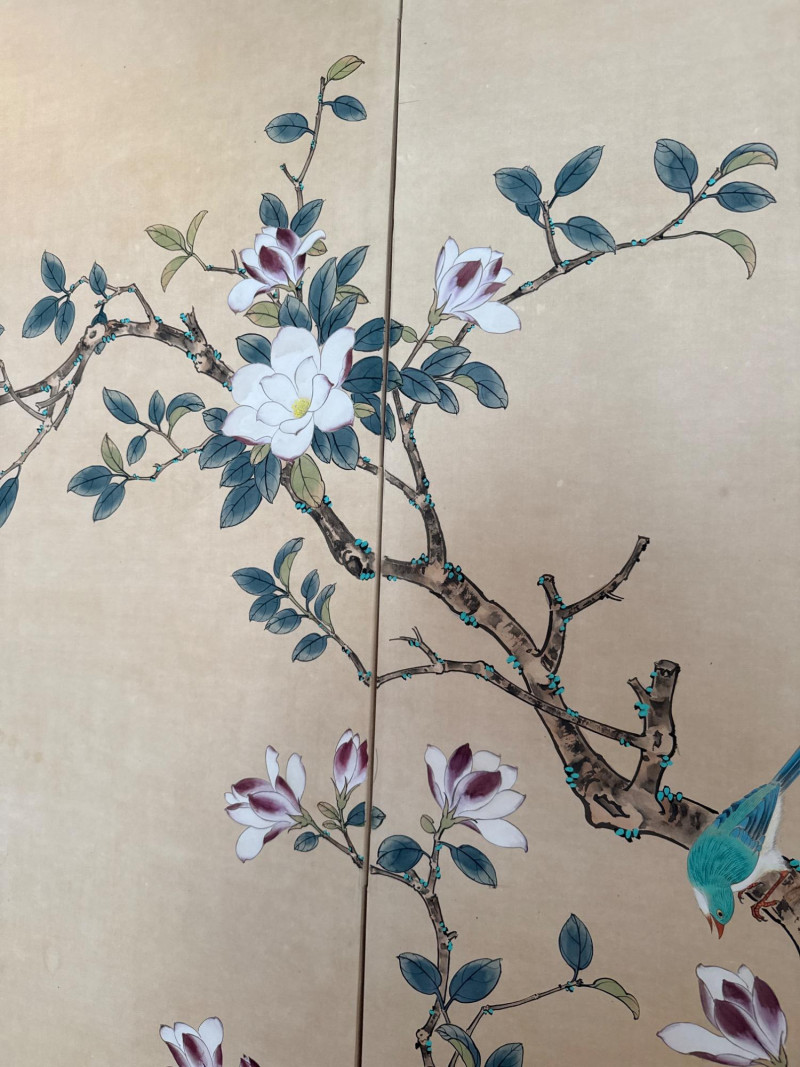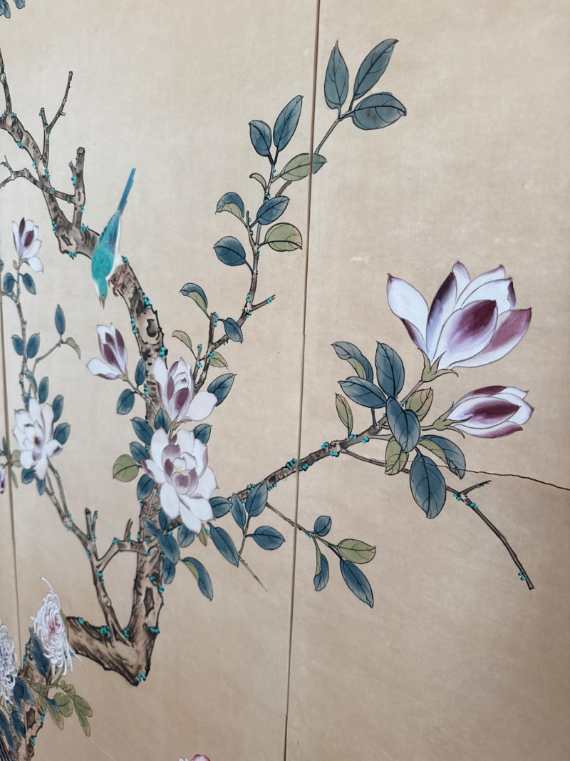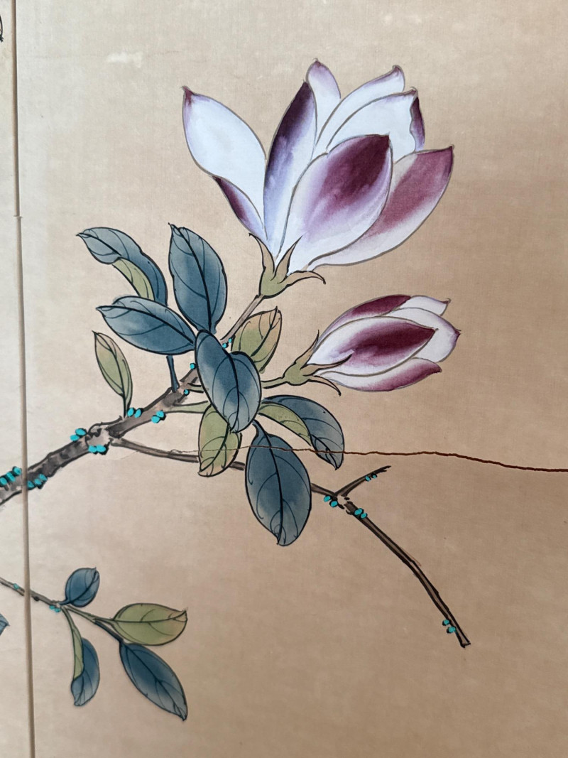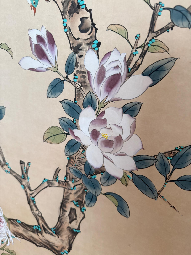 The subject of the “Four Seasons” is a classic theme in Chinese art, where flowers such as magnolia, chrysanthemum, and peony symbolize renewal, perseverance, and prosperity. Paired with birds in flight, the work conveys abundance, harmony, and good fortune across the year. Such paintings were popular as decorative panels in homes and ceremonial settings throughout the 20th century.