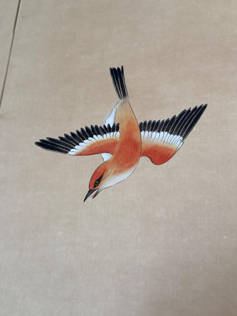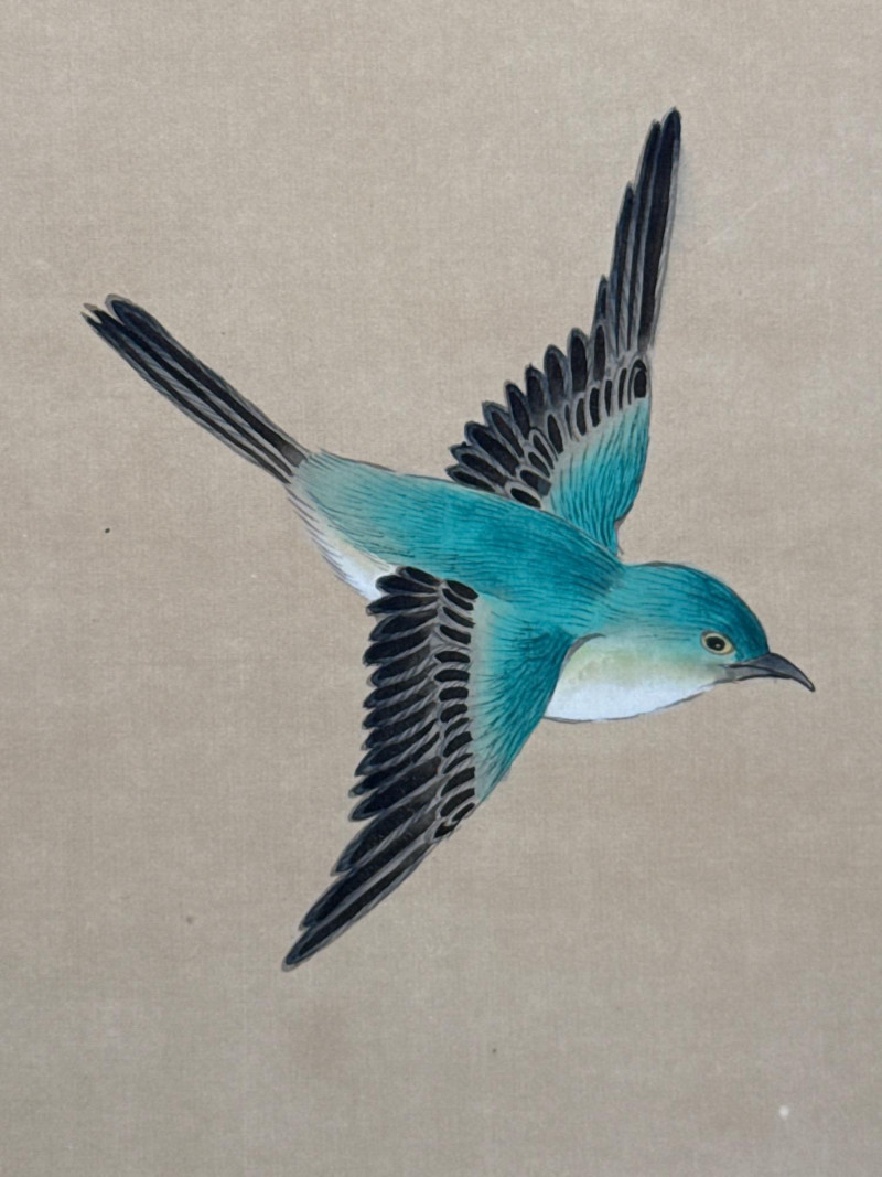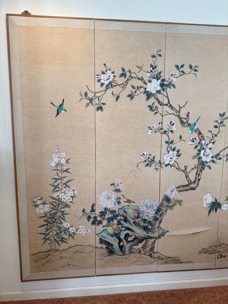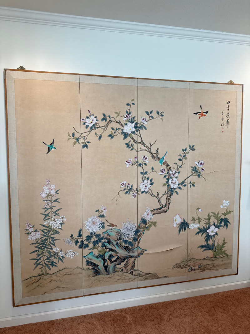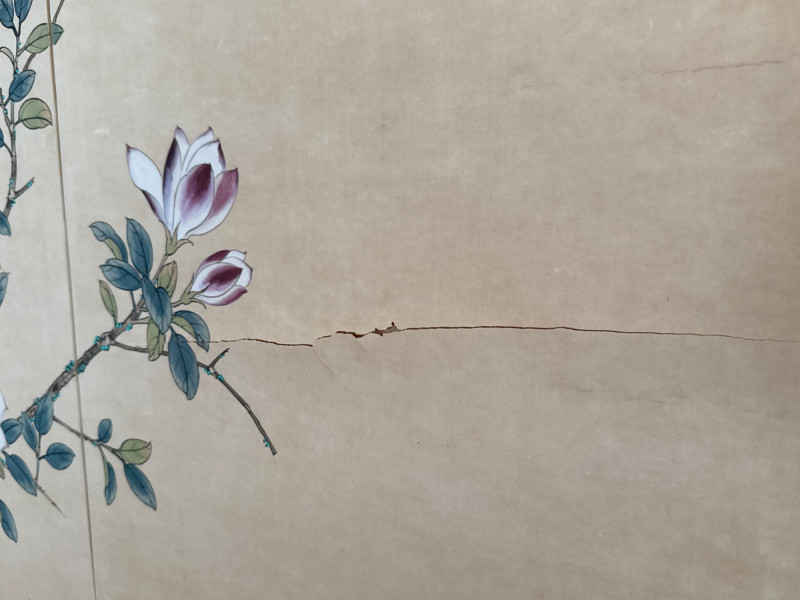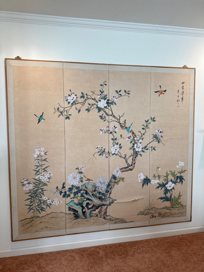 The subject of the “Four Seasons” is a classic theme in Chinese art, where flowers such as magnolia, chrysanthemum, and peony symbolize renewal, perseverance, and prosperity. Paired with birds in flight, the work conveys abundance, harmony, and good fortune across the year. Such paintings were popular as decorative panels in homes and ceremonial settings throughout the 20th century.