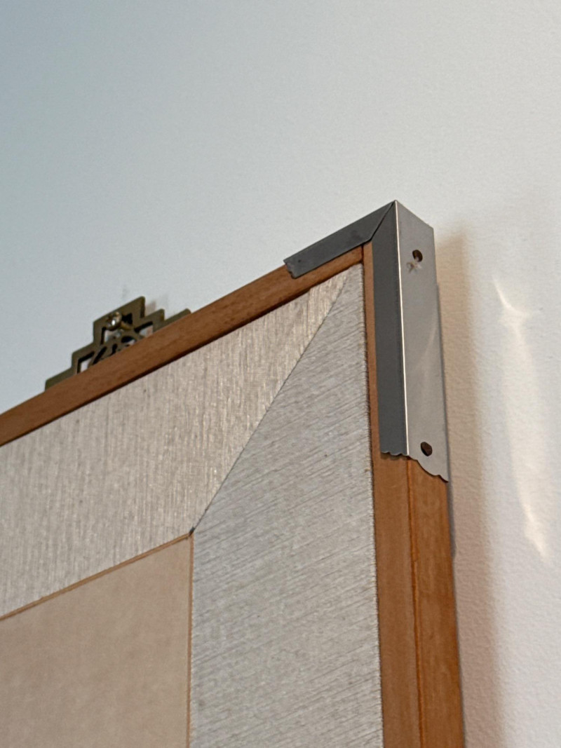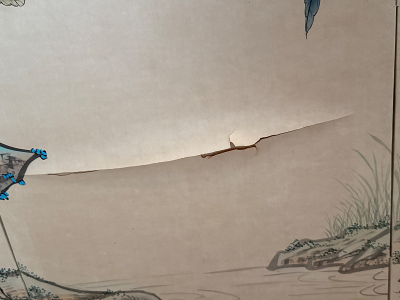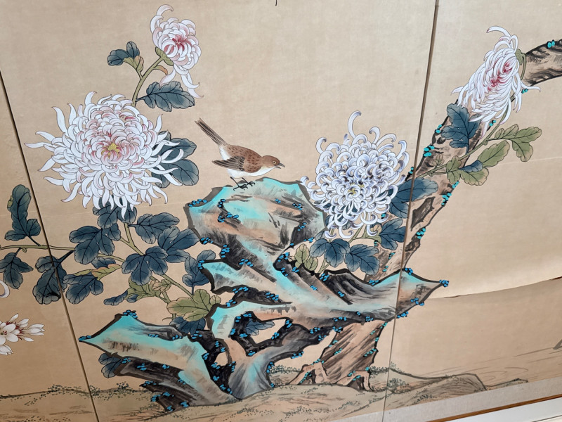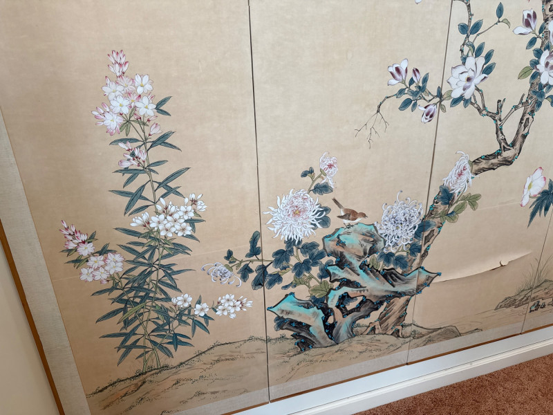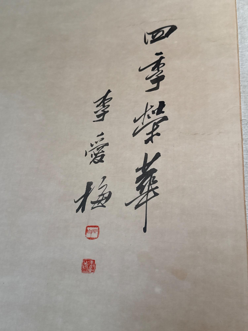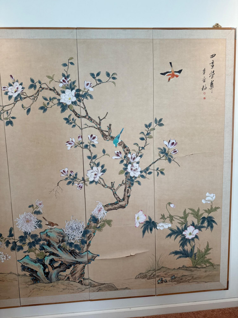 The inscription at the upper right reads “四季繁華” (Prosperity of the Four Seasons), followed by the artist’s signature “李愛梅” (Li Aimei), with two red seal impressions. Details: Form: Four-panel hanging screen painting Medium: Ink and pigments on paper with textile border and wooden frame Imagery: Magnolia, chrysanthemum, peony, and birds Inscription: 四季繁華 (Prosperity of the Four Seasons) Signature: 李愛梅 (Li Aimei), with two red seals Condition: Creasing, paper separation, and two tears visible in central and lower panels. Collecting Note: