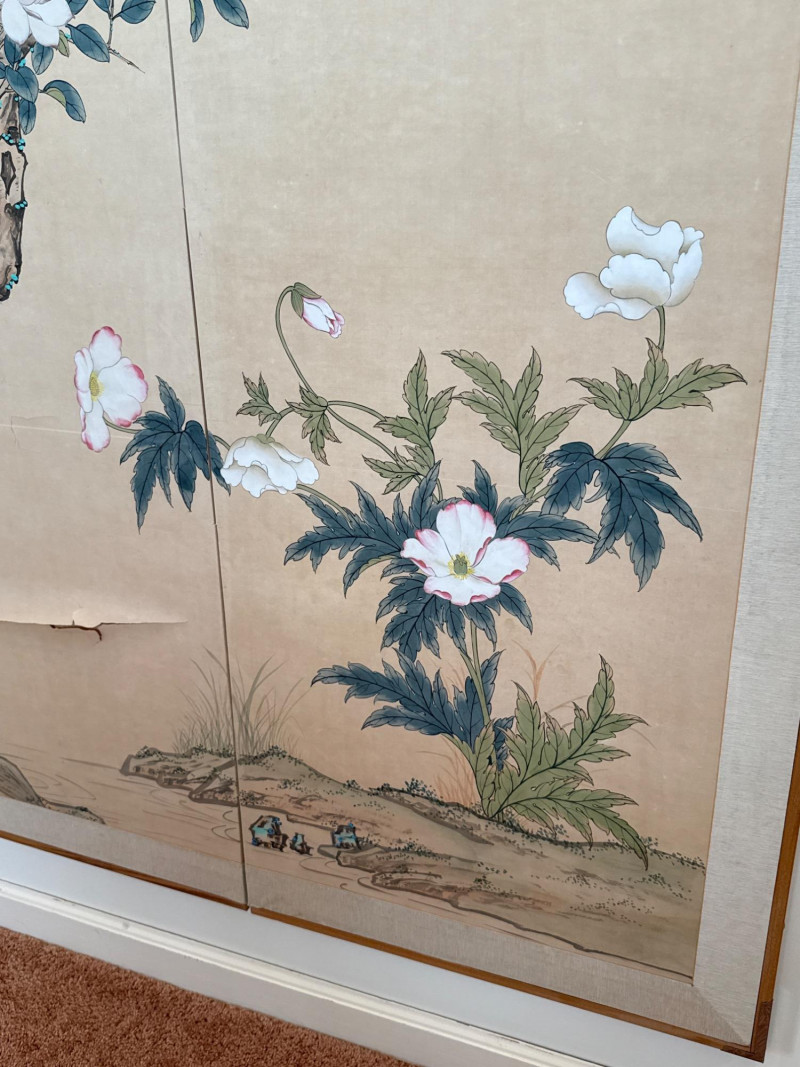 Vintage Chinese Four-Panel Screen Painting A vintage Chinese four-panel screen painting depicting seasonal flowers and birds in a natural landscape. The composition includes magnolia blossoms, chrysanthemums, and peonies, accompanied by brightly colored birds in flight and perched among branches. Executed in ink and pigments on paper with textile borders and wooden frame.