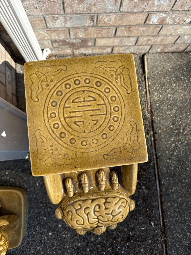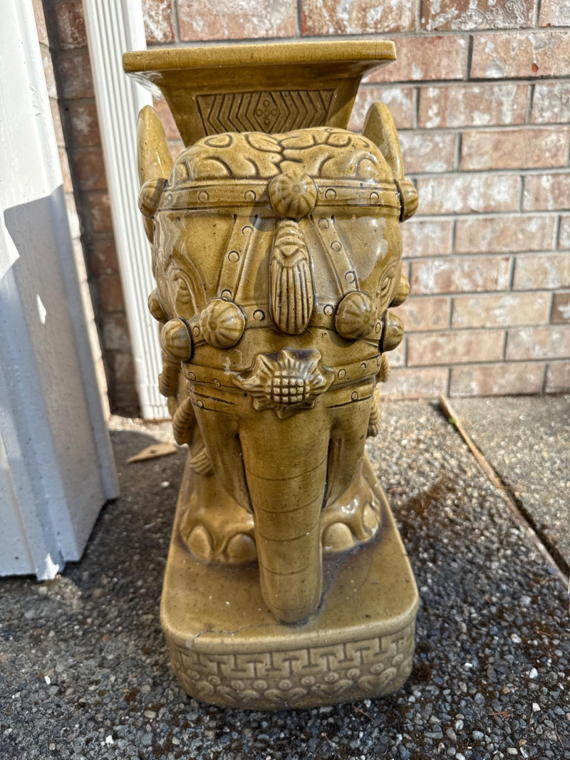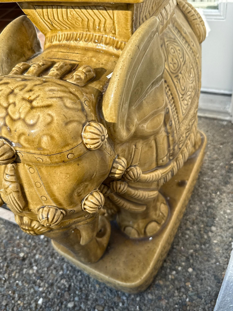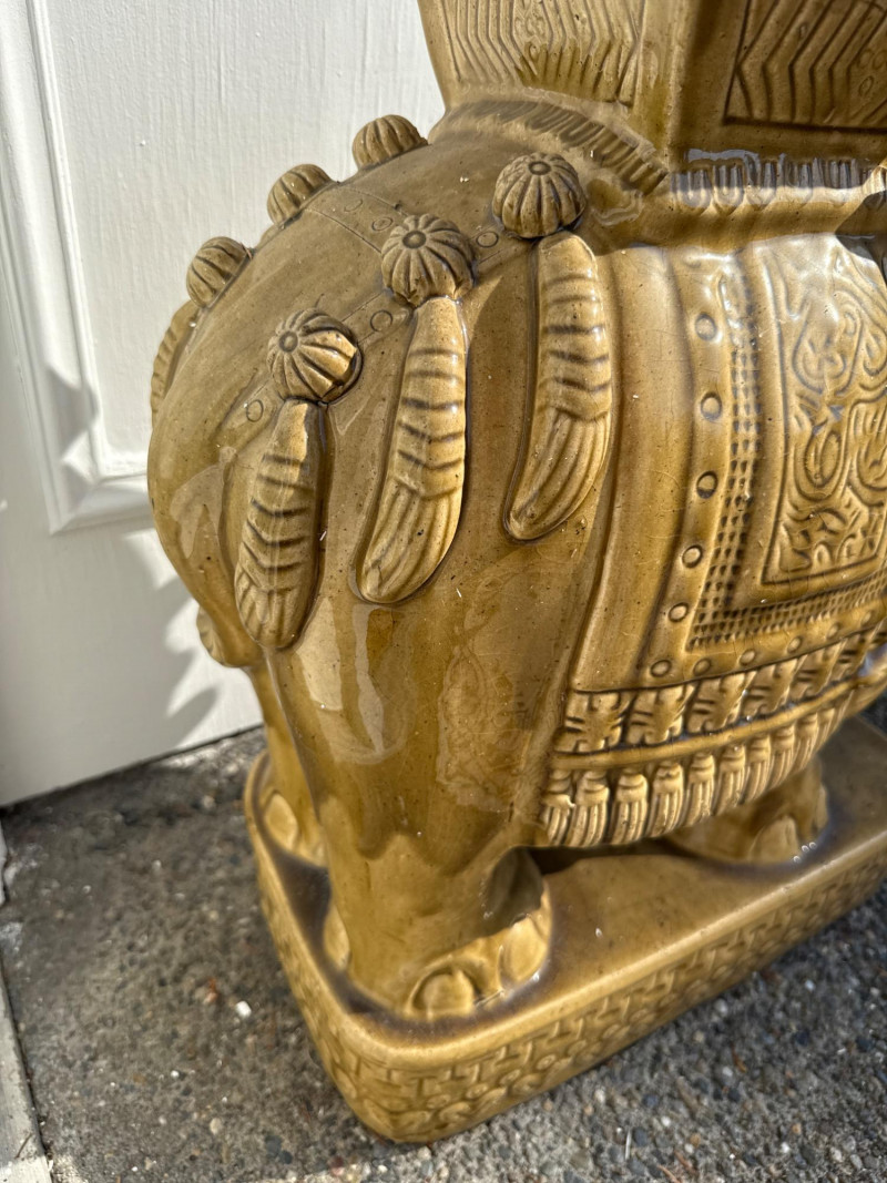 A regal duo of gold-glazed ceramic elephant stands, each featuring intricate ornamental detailing and a flat top surface ideal for use as plant pedestals or accent tables. These sculptural pieces blend decorative charm with functional design—perfect for indoor or patio staging, boho garden corners, or eclectic interiors. Length: 19" Width: 9" Height: 22" Material: Glazed ceramic with matte gold finish Form: Elephant-shaped base with carved saddle top Style: Asian-inspired decorative motif with floral and scroll accents Function: Flat top suitable for planters, sculptures, or small traysDimensions (Each)