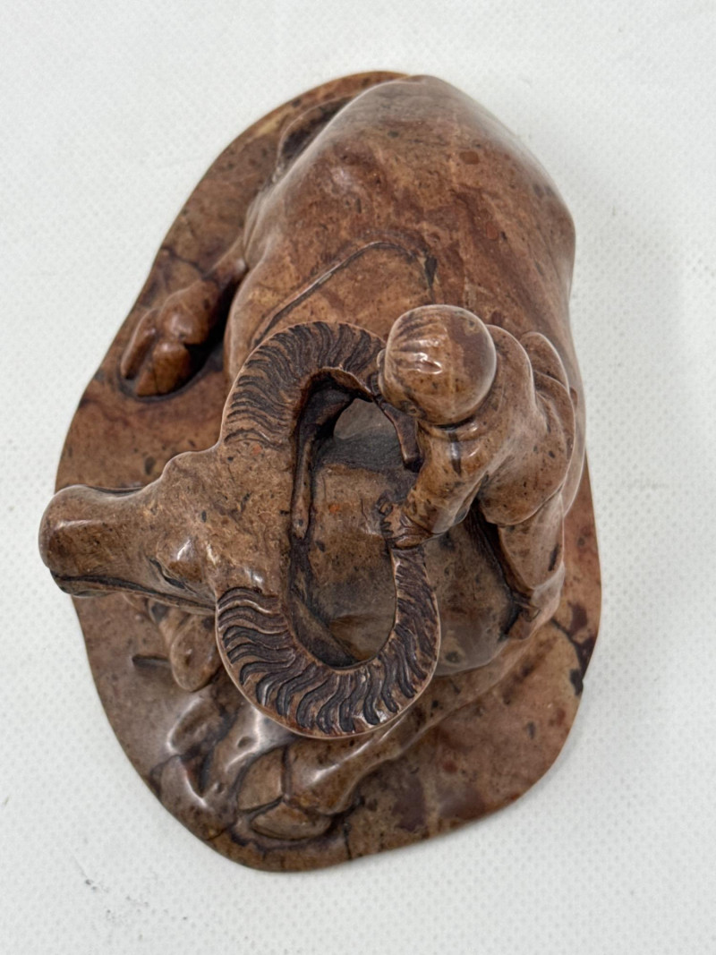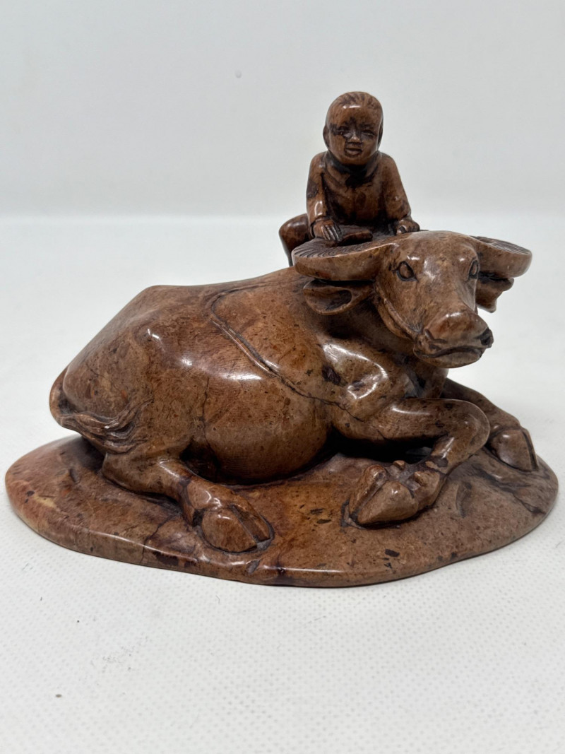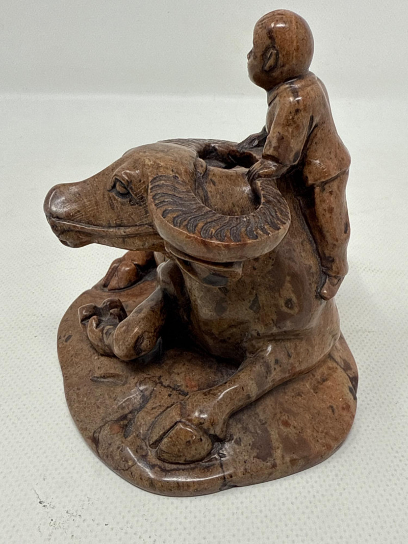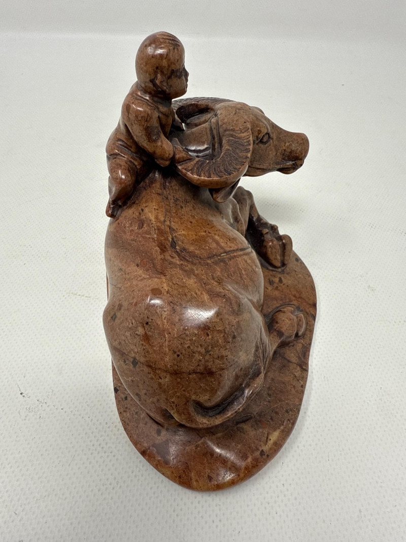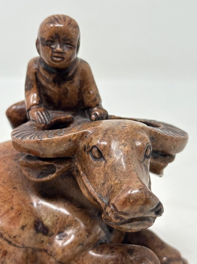 Chinese Soapstone Sculpture of Child on Water Buffalo A vintage hand-carved Chinese soapstone sculpture featuring a child seated atop a reclining water buffalo. Expertly carved from a single block of mottled brown soapstone, the piece showcases natural veining and a soft polish. The buffalo is depicted in a resting posture, with finely rendered horns, expressive facial features, and a gentle demeanor. The child sits peacefully on its back, carved in a simple, traditional style that evokes rural innocence and harmony. Carved from a single block of natural soapstone Depicts a traditional child-and-buffalo motif, symbolic in Chinese folk art Crafted from mottled brown stone with natural veining and a smooth polished surface Finely detailed buffalo horns, facial expression, and child figure Represents themes of simplicity, harmony with nature, and spiritual enlightenment in Daoist tradition Soapstone In Chinese culture, the water buffalo symbolizes strength, perseverance, and the agrarian way of life. Artistic depictions of children riding buffaloes are common in folk art, representing simplicity, innocence, and a deep connection to nature. In Daoist and Buddhist traditions, this motif resonates with the “Oxherding” parables—allegories of spiritual awakening and the journey toward inner peace.Features: