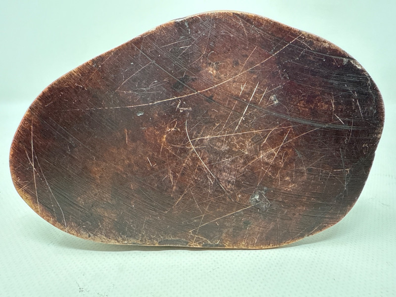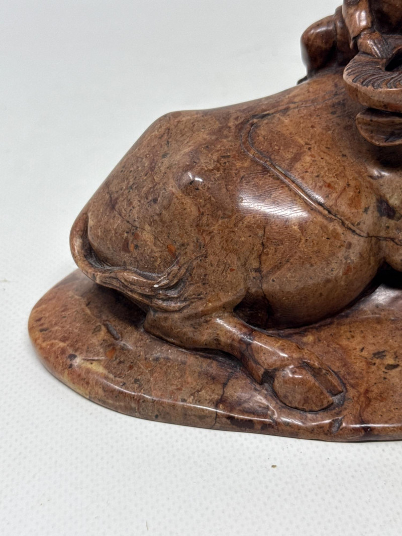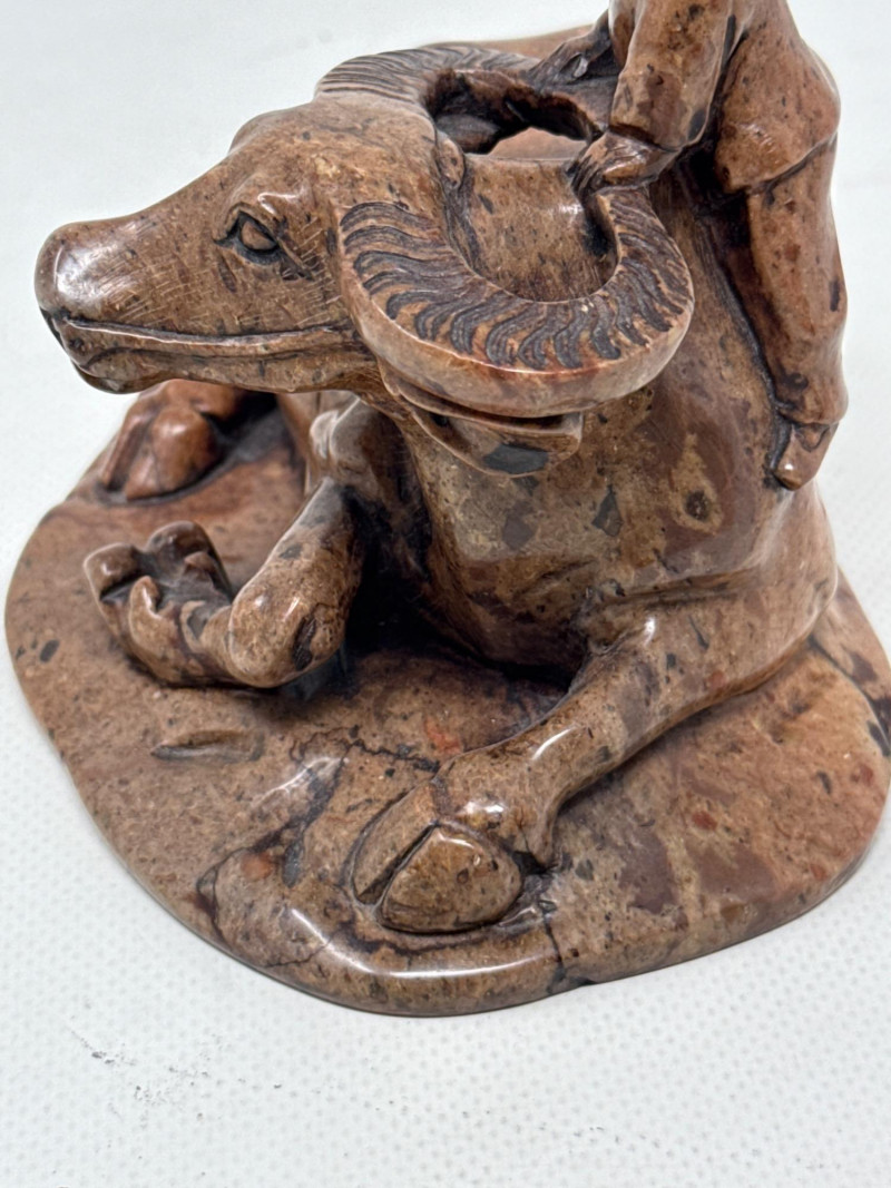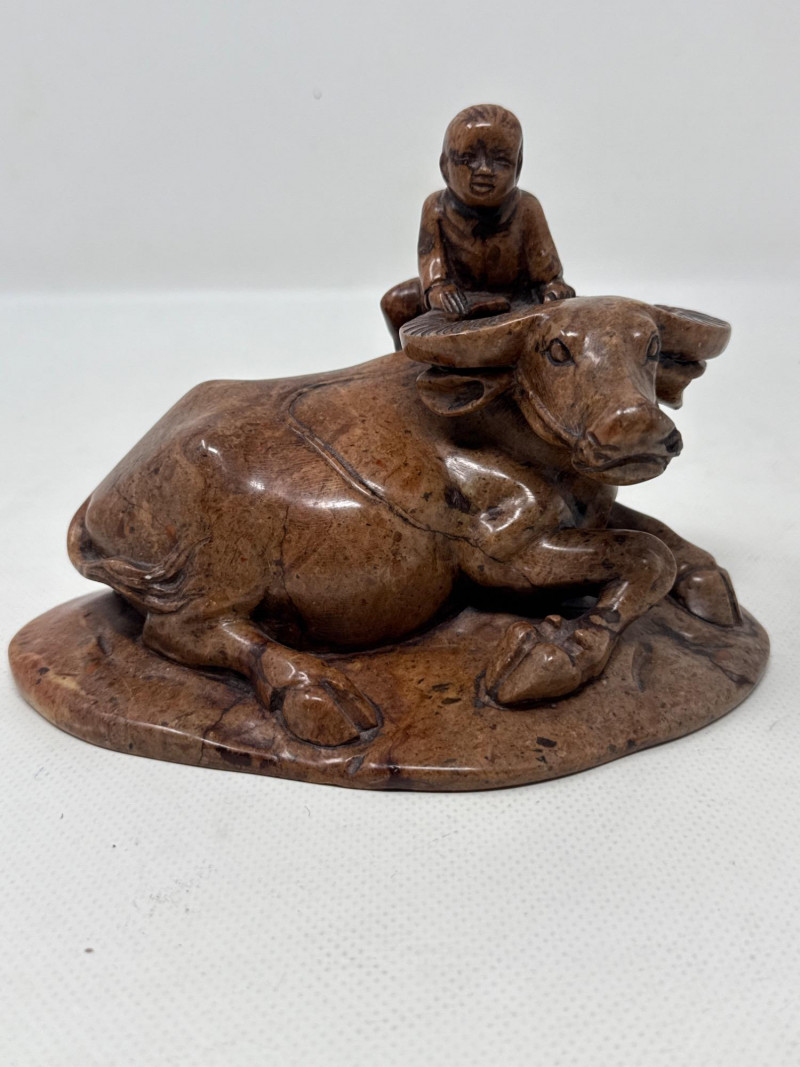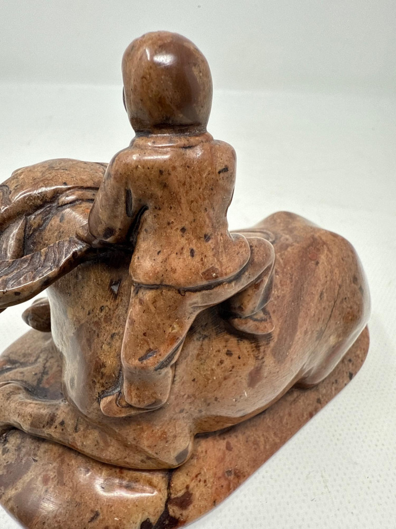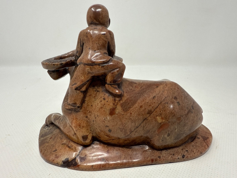Chinese Soapstone Sculpture of Child on Water Buffalo A vintage hand-carved Chinese soapstone sculpture featuring a child seated atop a reclining water buffalo. Expertly carved from a single block of mottled brown soapstone, the piece showcases natural veining and a soft polish. The buffalo is depicted in a resting posture, with finely rendered horns, expressive facial features, and a gentle demeanor. The child sits peacefully on its back, carved in a simple, traditional style that evokes rural innocence and harmony. Carved from a single block of natural soapstone Depicts a traditional child-and-buffalo motif, symbolic in Chinese folk art Crafted from mottled brown stone with natural veining and a smooth polished surface Finely detailed buffalo horns, facial expression, and child figure Represents themes of simplicity, harmony with nature, and spiritual enlightenment in Daoist tradition Soapstone In Chinese culture, the water buffalo symbolizes strength, perseverance, and the agrarian way of life. Artistic depictions of children riding buffaloes are common in folk art, representing simplicity, innocence, and a deep connection to nature. In Daoist and Buddhist traditions, this motif resonates with the “Oxherding” parables—allegories of spiritual awakening and the journey toward inner peace.Features: