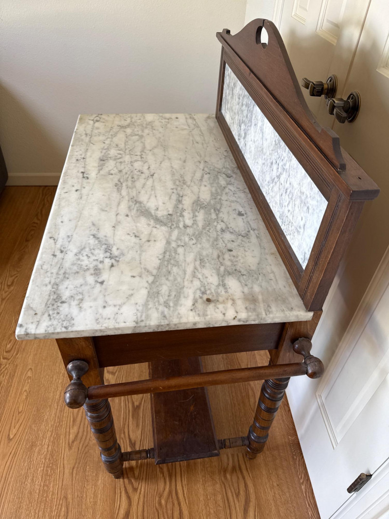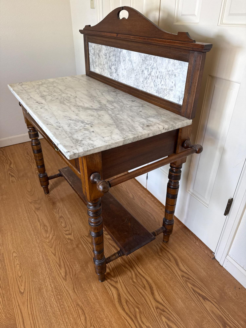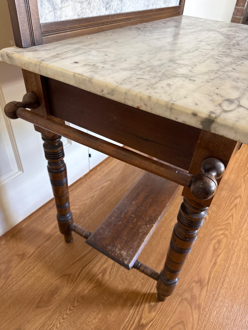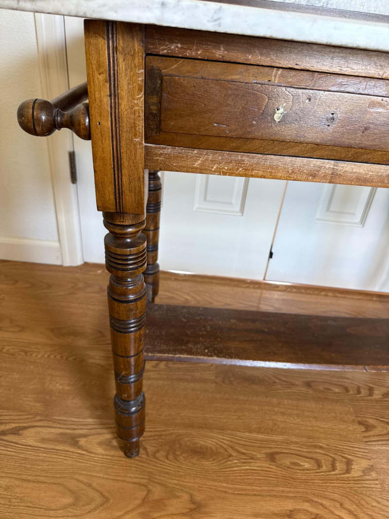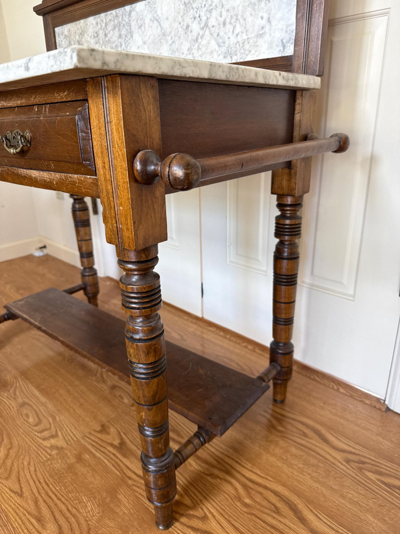 An elegant early 20th-century washstand featuring: Top: White/gray veined marble slab with matching marble backsplash inset in wood. Wood: Solid walnut frame with four turned legs showcasing 18 decorative ring turnings. Drawer: Single wide drawer with original brass pulls (note: one pull requires reattachment). Other Features: Side towel bars and a lower wood shelf. Hardware: Original brass pulls included; one detached but present. Marble-top washstands were popular in the late 19th and early 20th centuries, typically used with a basin and pitcher before indoor plumbing became widespread. Walnut examples with turned legs, brass pulls, and side towel bars reflect transitional Victorian and early Eastlake design aesthetics.Antique Marble and Walnut Washstand – Early 20th Century